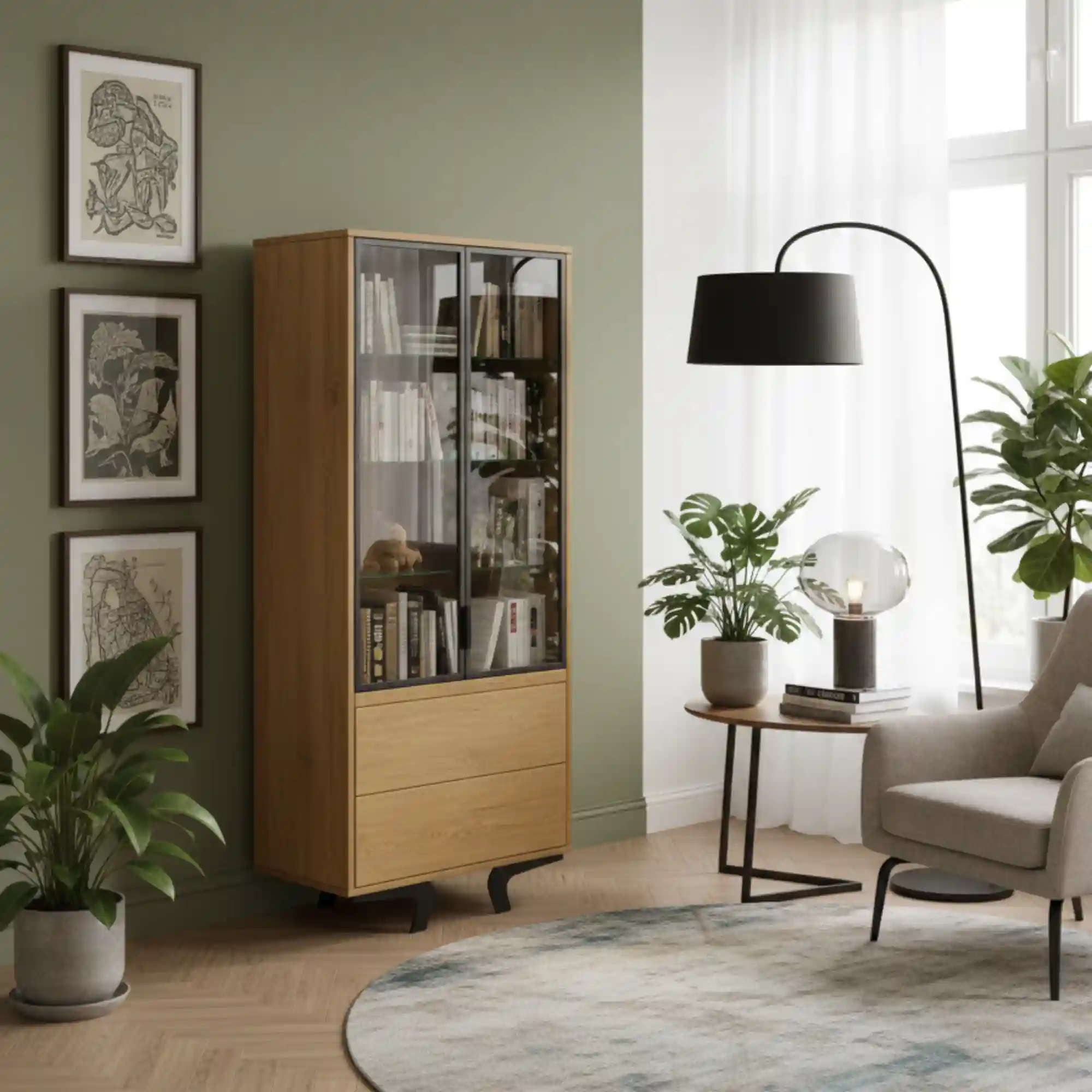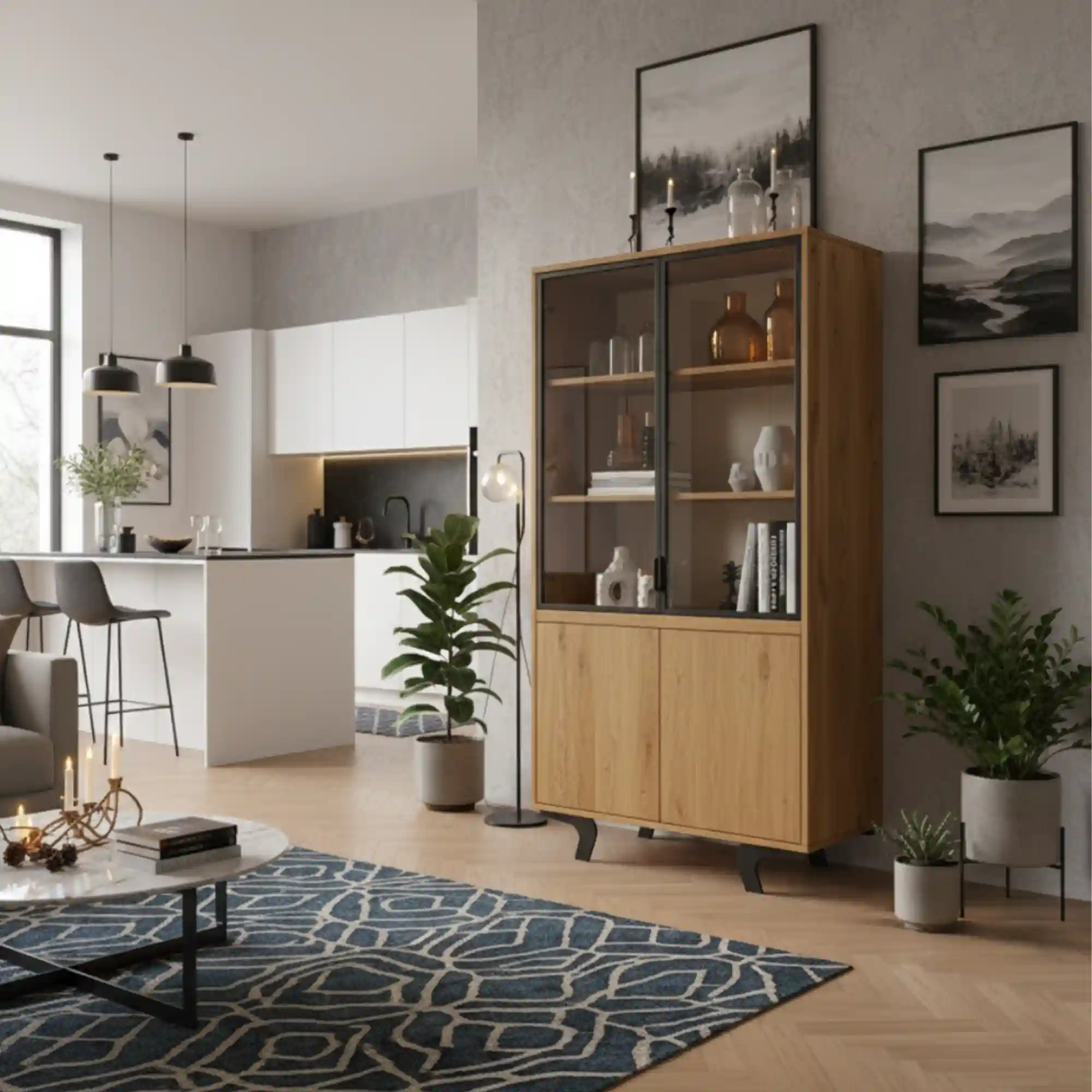 The oak display cabinet is a modern design combined with solid materials and perfect workmanship. Display cabinet made of natural oak wood will easily fit into most interior styles. The structure is made of solid oak wood, while the original display cabinet legs are made of steel. Modern wooden display cabinet on metal legs will be a great decoration of the room and a practical piece of furniture for storage. The oak display cabinet equipped with wooden fronts with a classic solution of opening doors will give us access to the entire interior of the dresser. Each product prepared directly after placing an order. Our furniture is shipped assembled, so that after delivery you only have to enjoy the beauty of the display cabinet. In addition, delivery with carry-in is also possible. If you have any doubts, please contact us, we will be happy to answer all your questions and advise you. Go to the “customize display cabinet” tab, fill out the contact form, and we will respond as soon as possible!