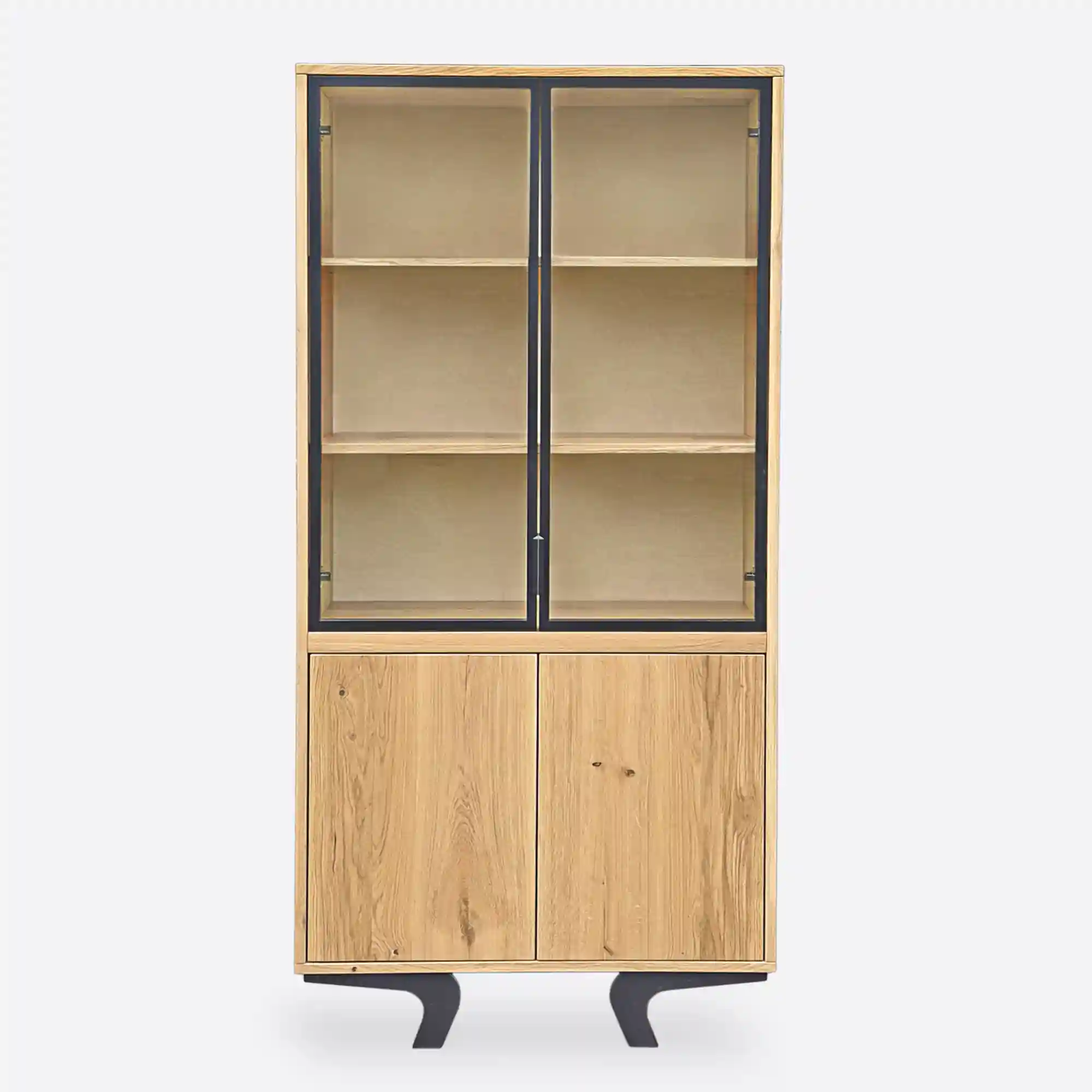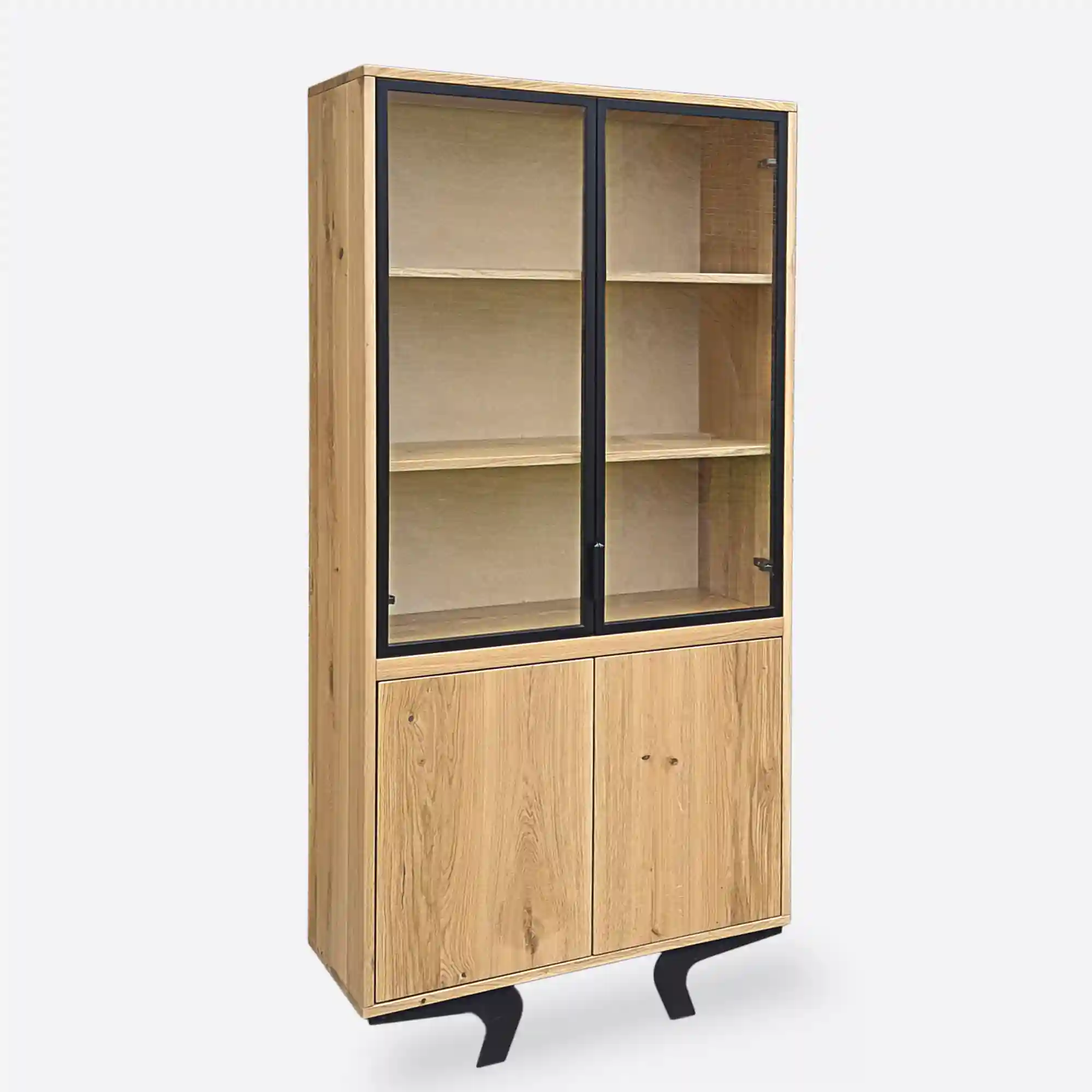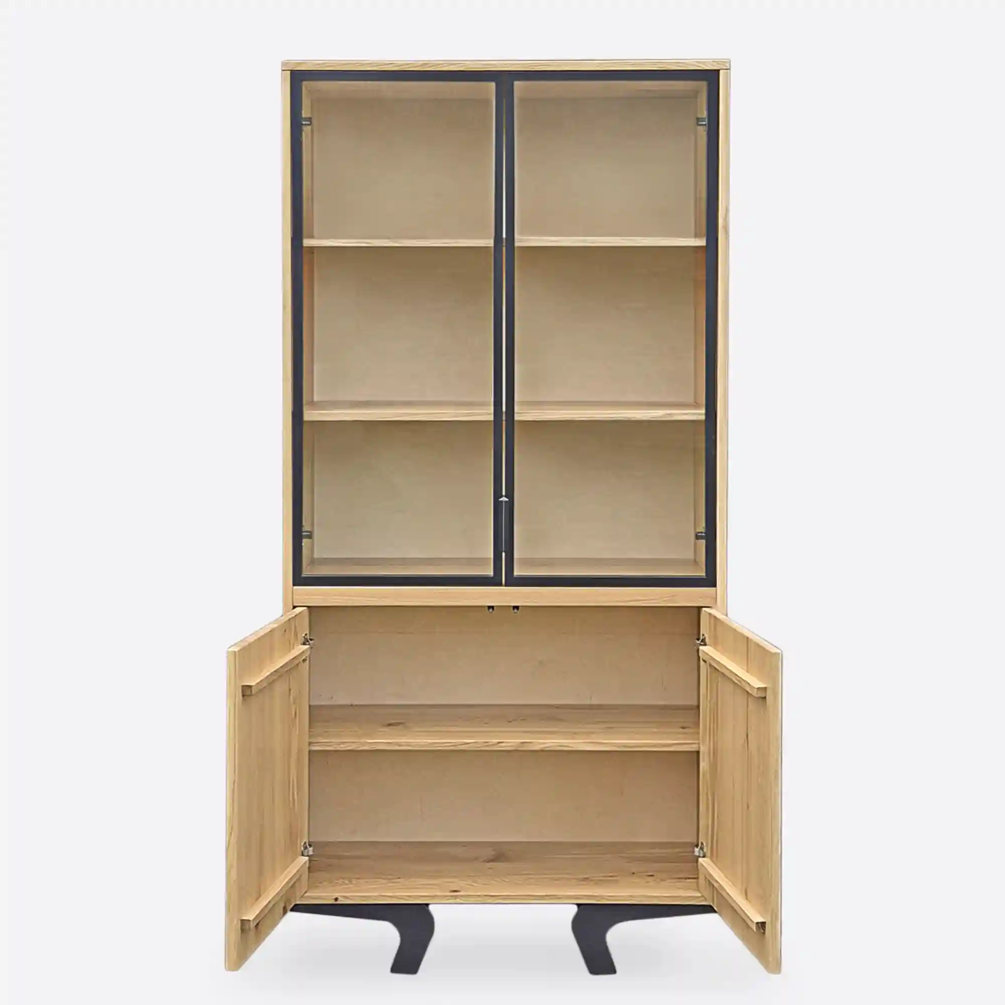 Designer oak display cabinet VITA is a unique design and interesting form in a modern way. The display cabinet is made of solid oak wood combined with steel, which will ensure excellent strength and stability of the furniture. The modern oak display cabinet is an ideal place to display photos or tableware, thanks to the glass in the upper part of the furniture. While the lower cabinet of the display cabinet has been filled with practical shelves, so the VITA oak display cabinet will provide plenty of storage space. Oak display cabinet with a classic solution of opening doors, so that we have access to the entire interior of the furniture. This form of furniture is extremely practical and functional! Display cabinets made of solid wood will accommodate a lot of everyday things giving at the same time a guarantee of their safe storage. Designer display cabinet of solid oak wood VITA is a perfect piece of furniture for creating an elegant interior design. Industrial solid wood display cabinets will fit perfectly into modern, industrial and loft interiors.