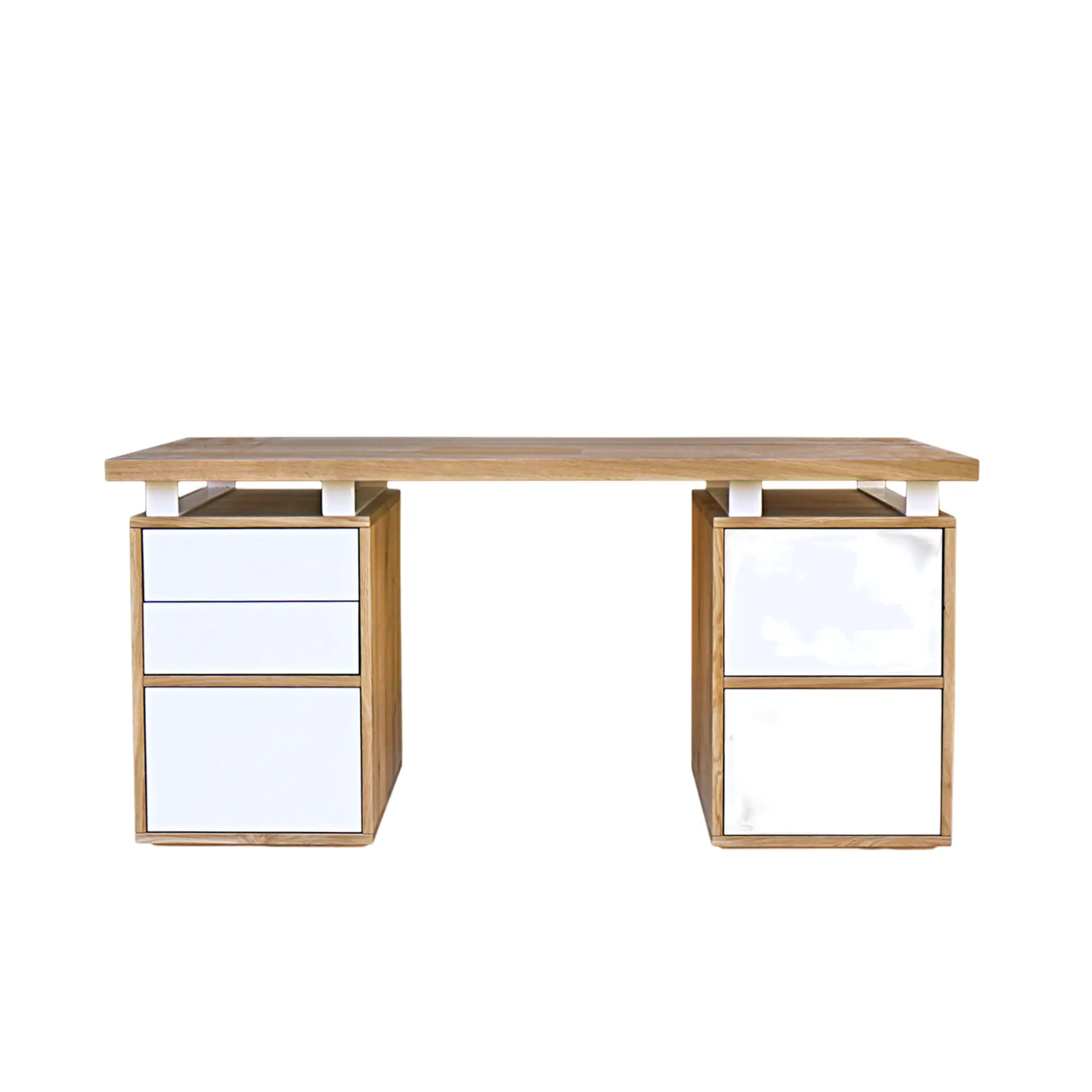 Desk with wooden top and drawers DORIS I is a combination of functionality and style. Practical drawers provide a convenient place to store everything you need for work and study. In addition, the capacious drawers are equipped with the TIP-ON touch opening system. A desk with a wooden top made of solid oak wood is a solid piece of furniture. A wooden desk will provide space for a portable computer, monitor, computer keyboard or other necessary accessories. Between the drawers of the desk and the table top there are metal supports in white. The space between the desk drawers provides convenient use and accommodates an armchair or chair. Create your home office or study space needed in every home.