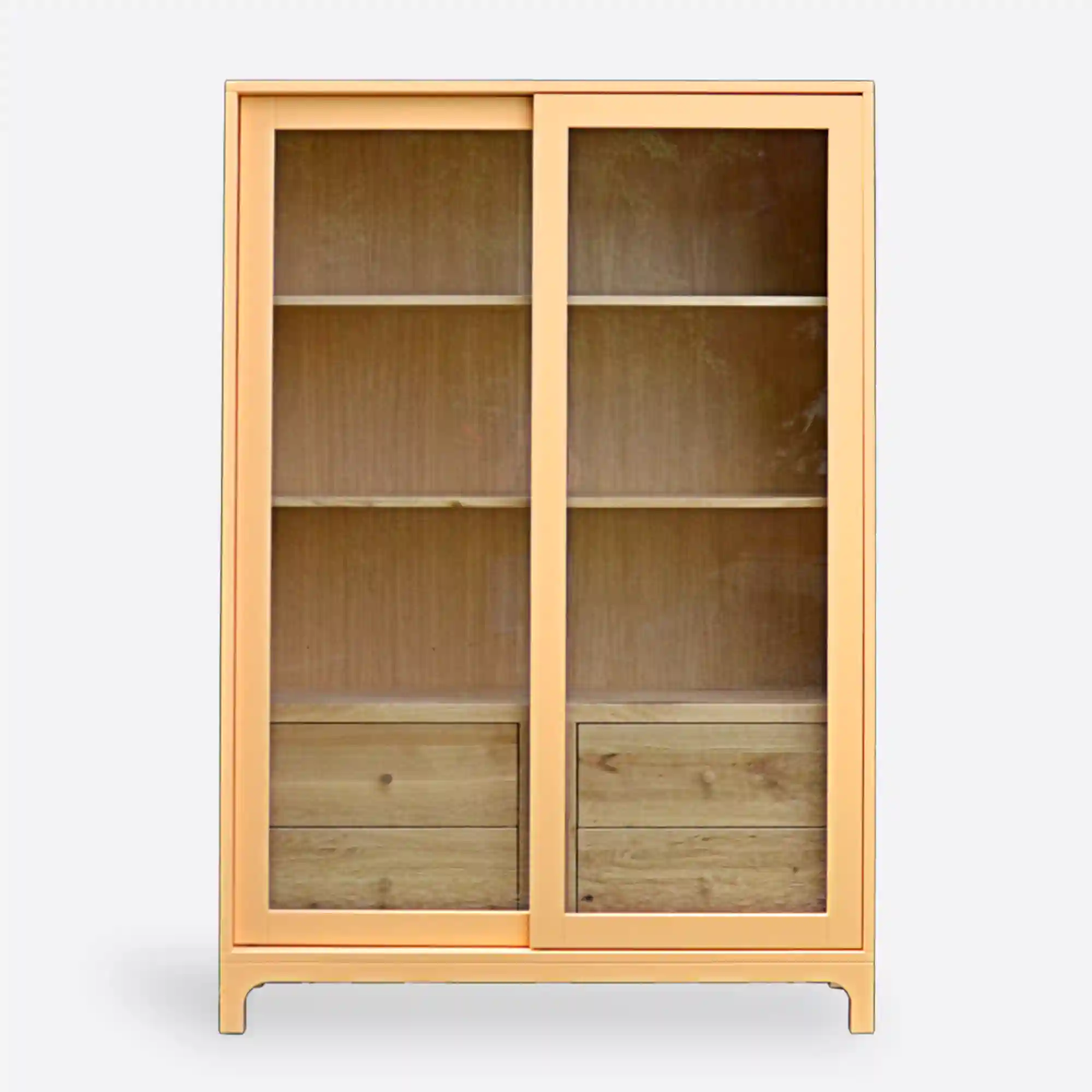 A display case with sliding doors is a piece of furniture for the living room, dining room or living room. Glass display case will allow you to expose, for example, books, tableware or collector’s items. Glass showcase will work well for arranging modern interiors and more. The decorative and stylish legs of the display case give it a classic look. The body and back wall are made of laminated board in Apricot Orange color. Shelves and drawers are made of solid oak wood. The fronts of the site are placed on sliding guides. Thanks to this, the site is comfortable and will work in a room where there is not much space. The display cabinet can also be used as a sideboard for plates or glasses. Showcases or sideboards are furniture that are used not only for storage, but are a decorative element of the interior. Bet on a stylish showcase for the living room or dining room straight from the manufacturer of oak furniture.