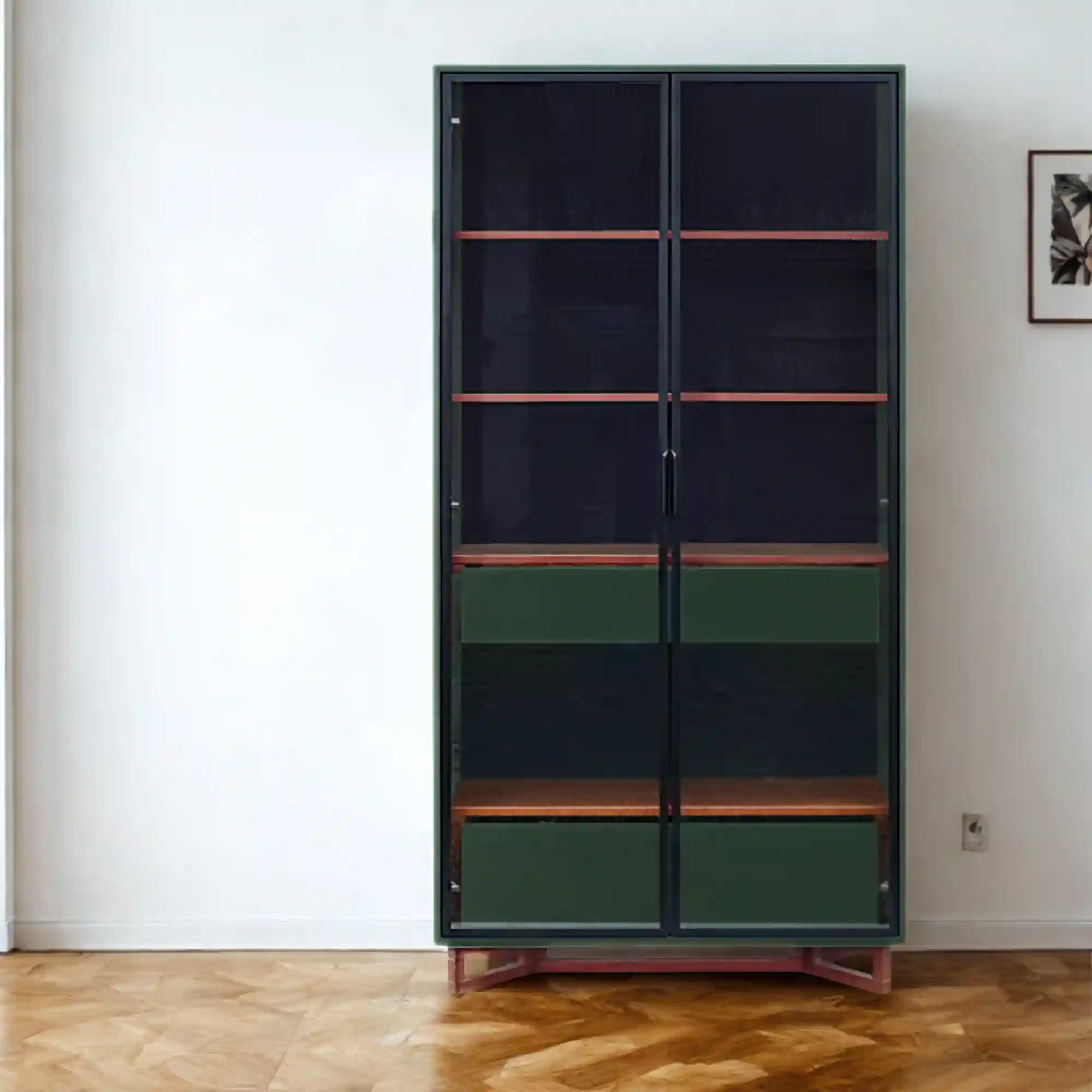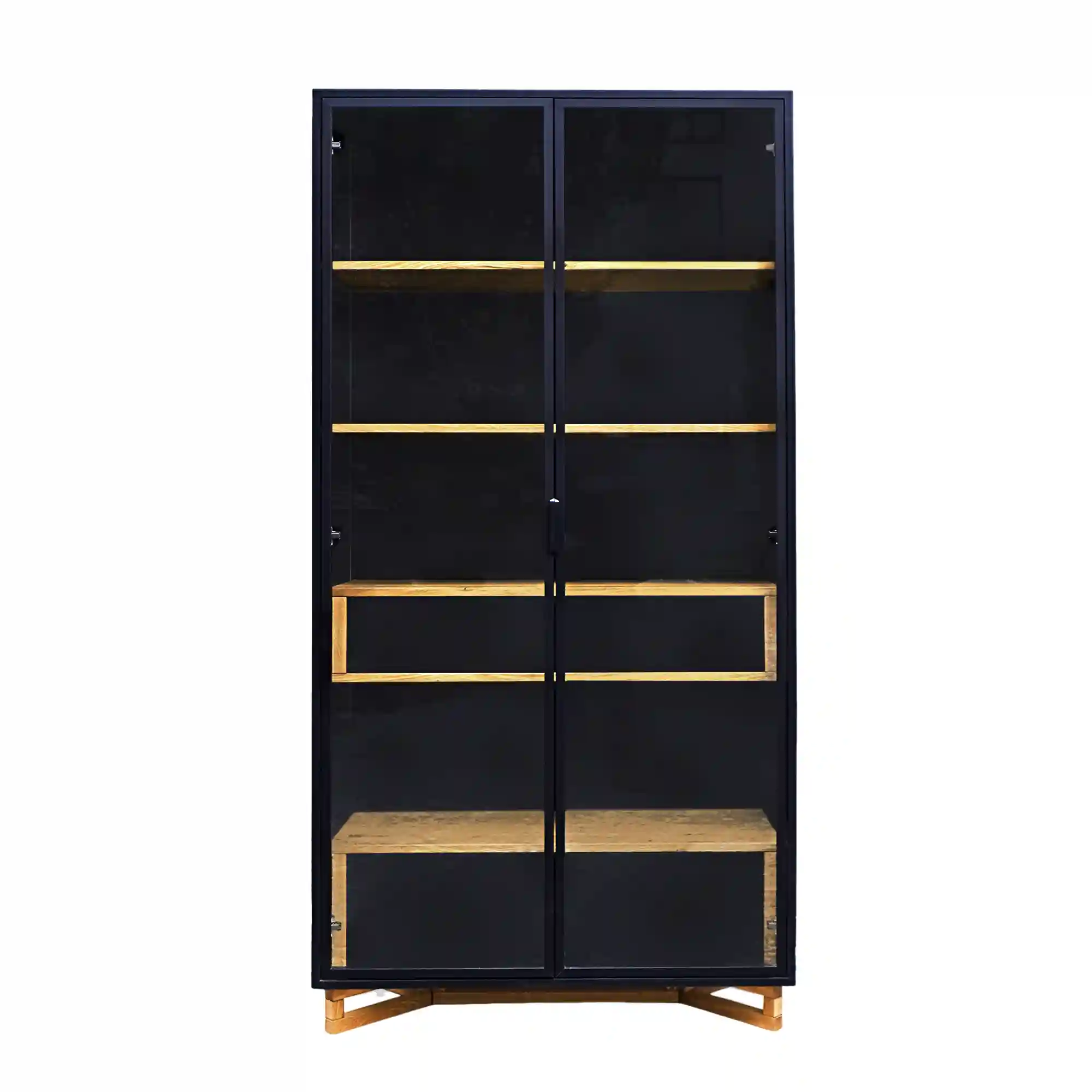 An original proposal for every living room, room or dining room. The wooden display case has four large shelves and two capacious drawers, thanks to which it will provide a lot of storage space. The modern display case is made of laminated board in Labrador color. The shelves of the showcase are made of oak solid wood in cherry color. The legs of the furniture are made of powder-coated steel in black to ensure the stability of the furniture. The door of the showcase is made of glass with a metal frame, so you can easily display family souvenirs and other decorative elements. Our glass display case with two drawers will allow you to hide all the objects or documents that you want to have hidden. A large display case made of oak wood and NORD boards is a combination of elegance and modern design that will add a unique look to any interior.