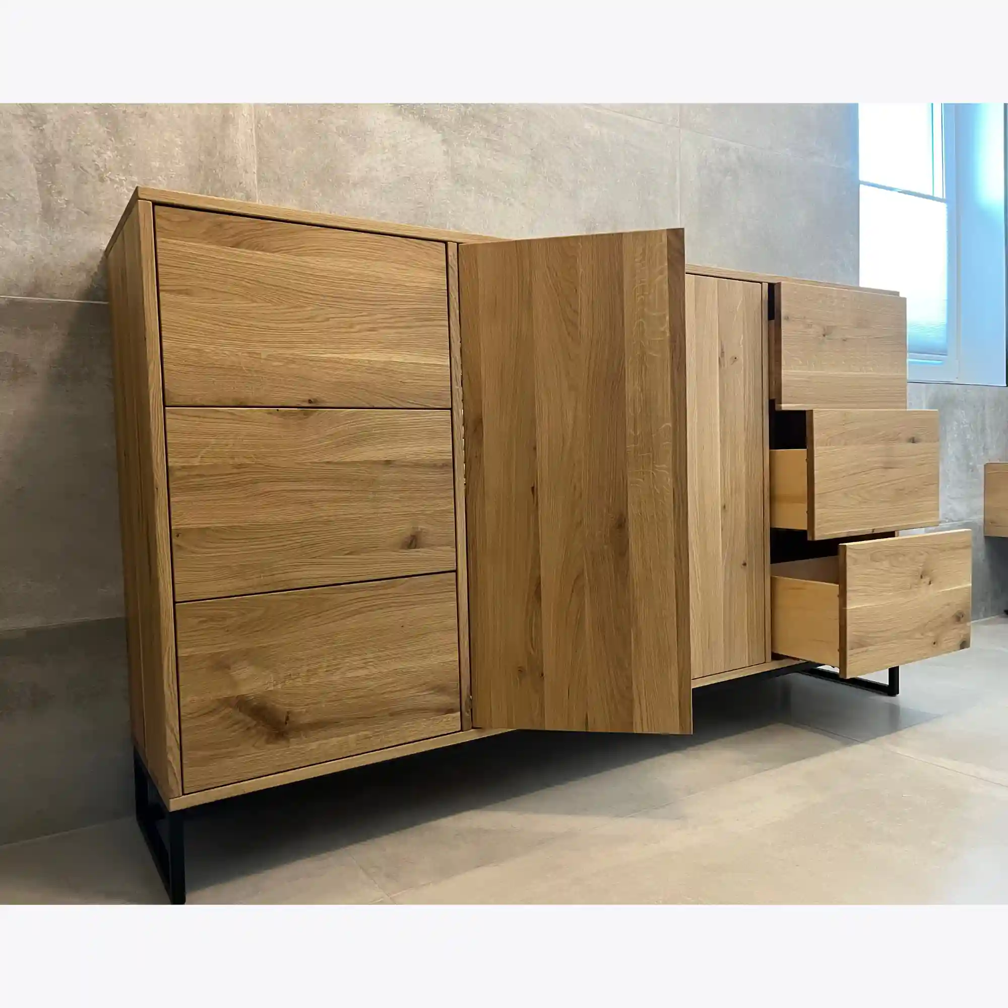 By choosing MERIS oak chests of drawers, you gain custom-made furniture that is not only beautiful but also practical and solid. Natural oak wood combined with industrial steel is synonymous with timeless style and quality.