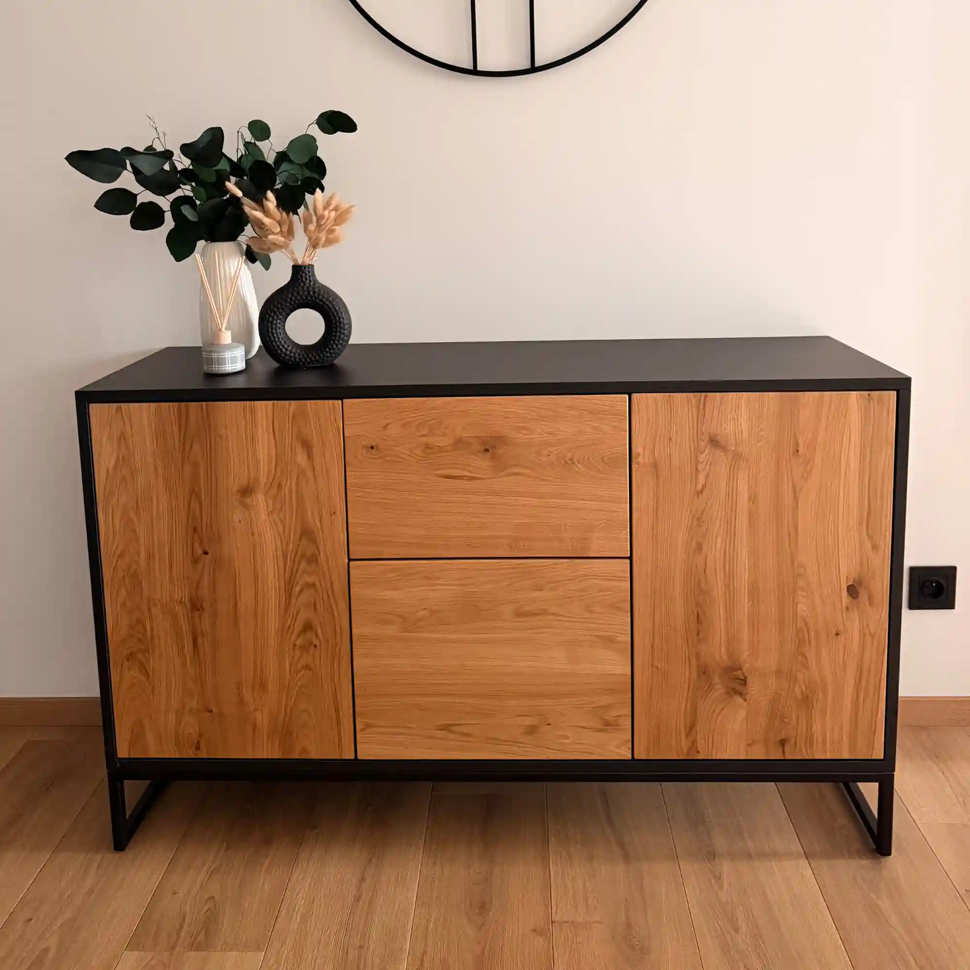 Loft oak chest of drawers in the industrial style ADEO III is a large, capacious and elegant piece of furniture. The chest of drawers is made of oak wood and laminated board, and the legs are made of powder-coated steel in black. The oak chest of drawers has two capacious drawers and two cabinets. Loft oak chest of drawers ADEO III is the perfect piece of furniture for the bedroom, living room or study. Oak chest of drawers in industrial style will work in many interiors. Oak chest of drawers will be perfect for any room in the house. Oak wood in combination with metal is an excellent proposition for loft-style interiors! Carefully secured furniture is delivered throughout the country. Delivery is carried out by company transport or a specialized courier company.
