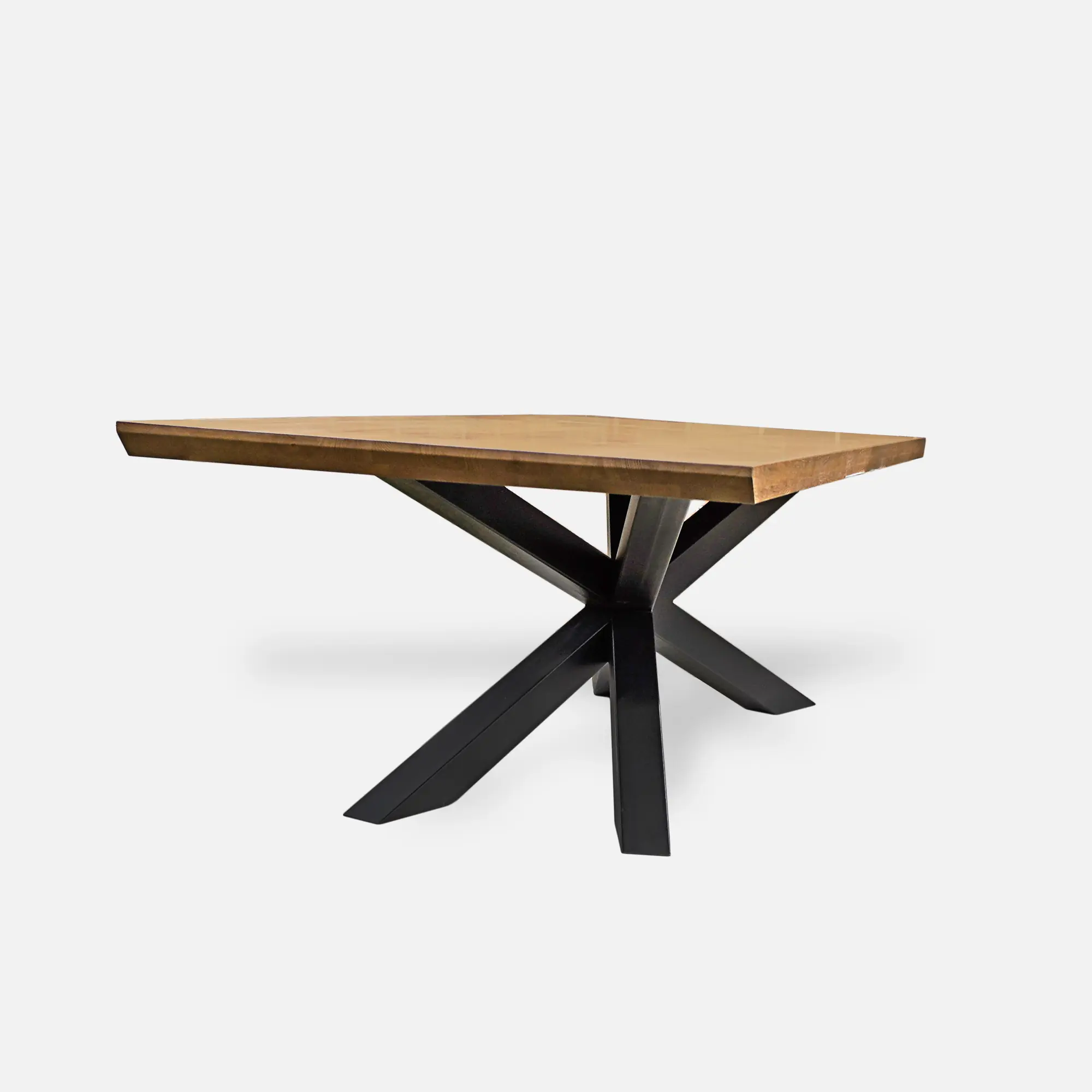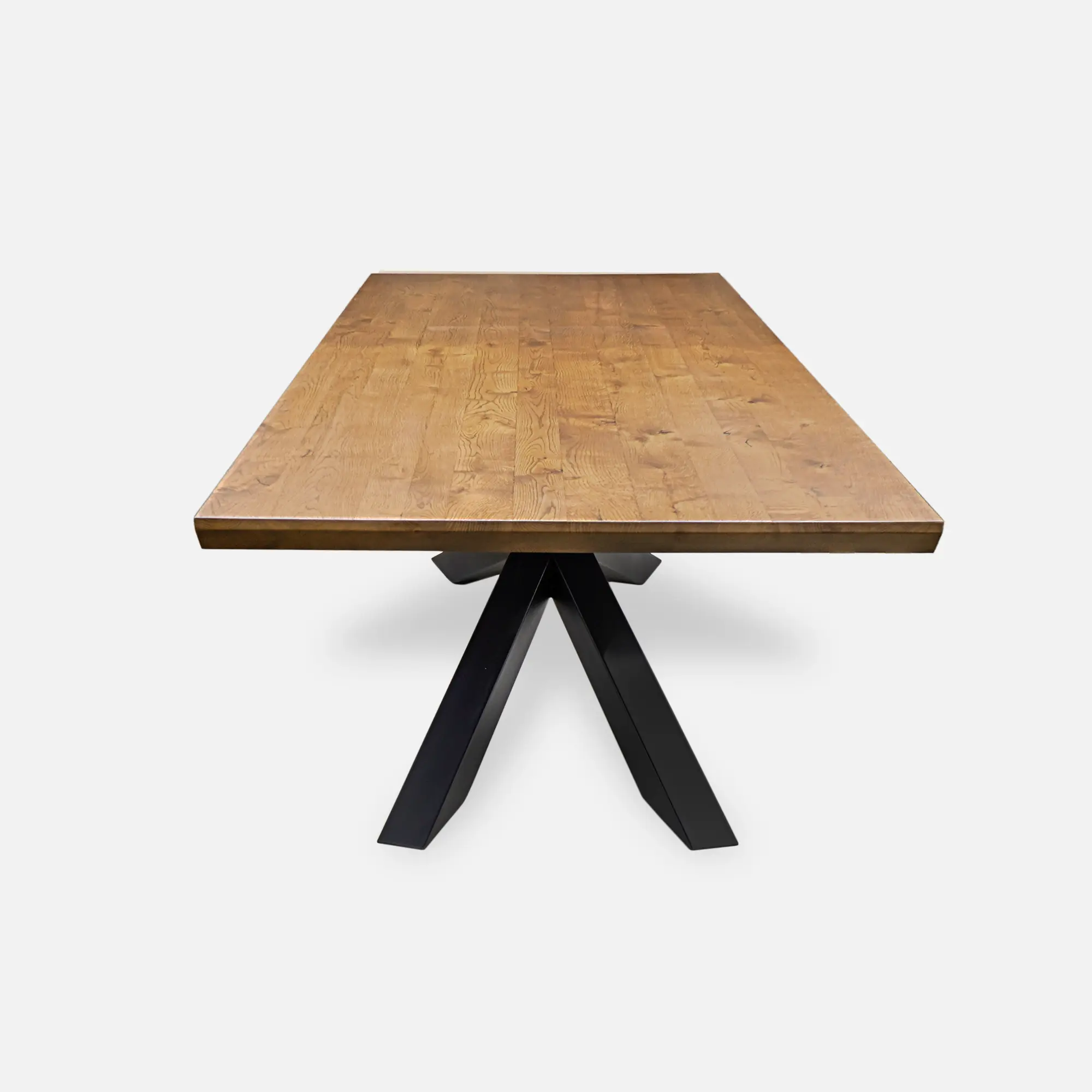 The oak loft table DEVON I is a unique piece of furniture combining the natural beauty of wood with the rawness of steel elements in loft style. Made of the highest quality natural oak wood, it impresses with a massive and solid top that rests on an unusual metal base. The warm character of the oak contrasts perfectly with the cold finish of the steel, creating a harmonious and modern whole. The table base, made of powder-coated steel, catches the eye with its unusual design – the legs converging at a central point add lightness and an industrial feel. However, the standard black colour can be changed to a different shade, customising the table to suit individual preferences. This allows the furniture to fit in perfectly with different interior styles. The natural oak top can be coloured in one of the many colours available, adapting it to the specific interior design. In addition, edge finishing is possible – from the classic straight cut to a Swiss undercut, which gives the table an even more sophisticated look. Thanks to such flexibility in personalisation, DEVON I is not only a functional table, but also a unique decorative element that will enrich any interior. Made with passion and attention to detail, it will become the focal point of a space, conducive to spending time in comfort.