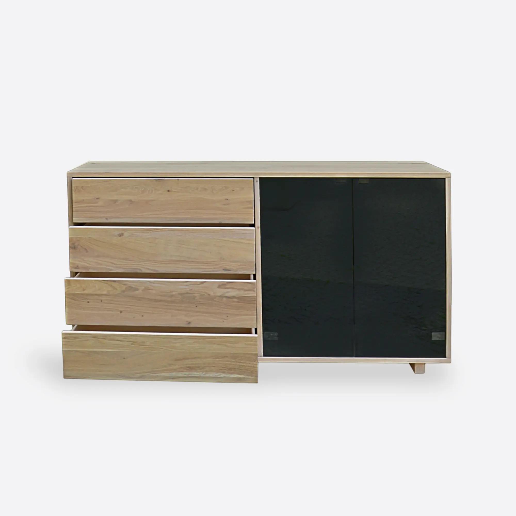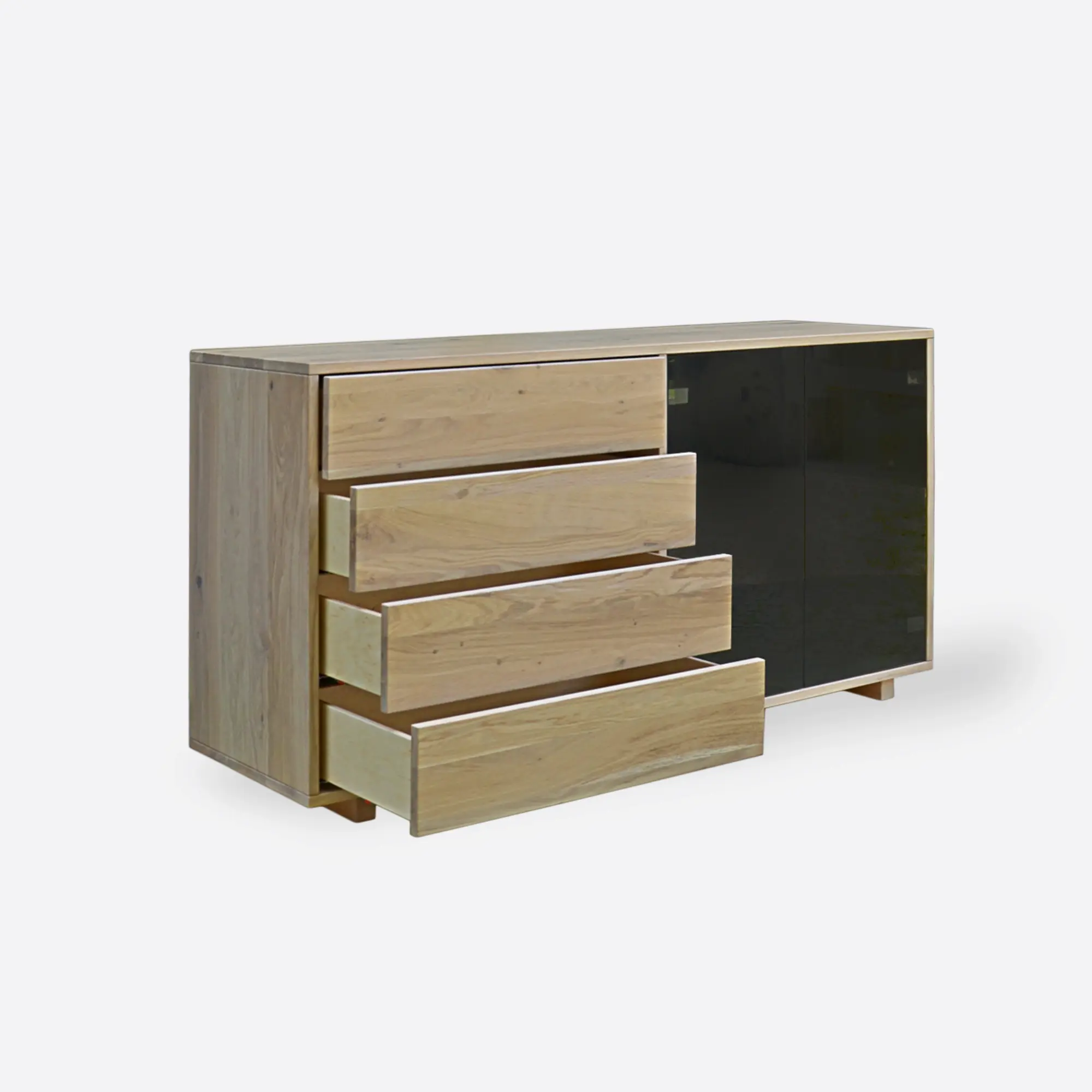 The modern oak chest of drawers BERGEN I is a unique, modern piece of furniture that combines functionality with elegant design. Solid oak wood and top quality glass not only enhance the aesthetics, but also ensure the durability and solidity of the construction. The body and fronts made entirely of oak give the modern oak chest of drawers a natural and luxurious look, while the glass doors on the right with shelves inside allow you to display elegant accessories or store in a more organised manner. The four drawers on the left side, which open by touch, are a great solution for modern interiors, minimising the number of handles and additional elements. The BERGEN I modern oak chest of drawers is not only a decorative piece, but also a practical piece of furniture that can be adapted to different rooms – from the living room, where it can be used as a stylish bar, to the study, where it will help organise documents and everyday items. The high quality of the materials and the handmade workmanship make the chest of drawers unique and will be a decoration for any interior.