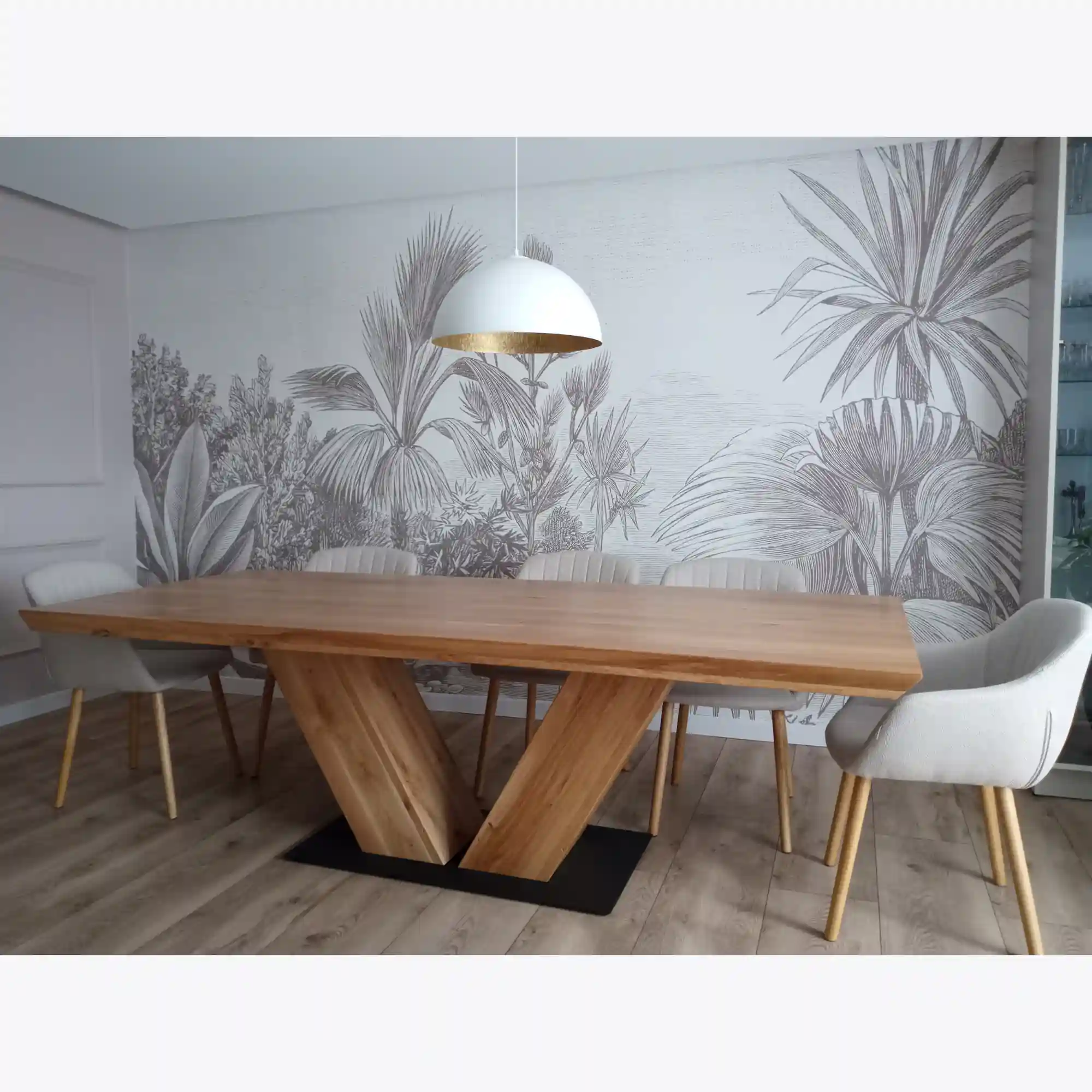 A modern table with an oak top is a perfect proposition for the living room or dining room. A solid wooden tabletop thickened at the edges up to 6 cm will serve you for many years. The steel structure of the V-shaped table has been reinforced with oak wood, which gives it a unique style. The VENICE model is a modern extendable table with an oak top, which, thanks to the extra beds, will allow you to, for example, have dinner or meet in a larger group. Our extendable wooden tables are equipped with guides under the table top, and the assembly of the extra beds is very simple. All you have to do is slide out the mounted guides from underneath the worktop and place the extra beds on them, which are a beautiful extension of the oak countertop. An elegant extendable table is a proposition for people who value style and comfort. The dining table is perfect for a modern, industrial or Scandinavian style interior.