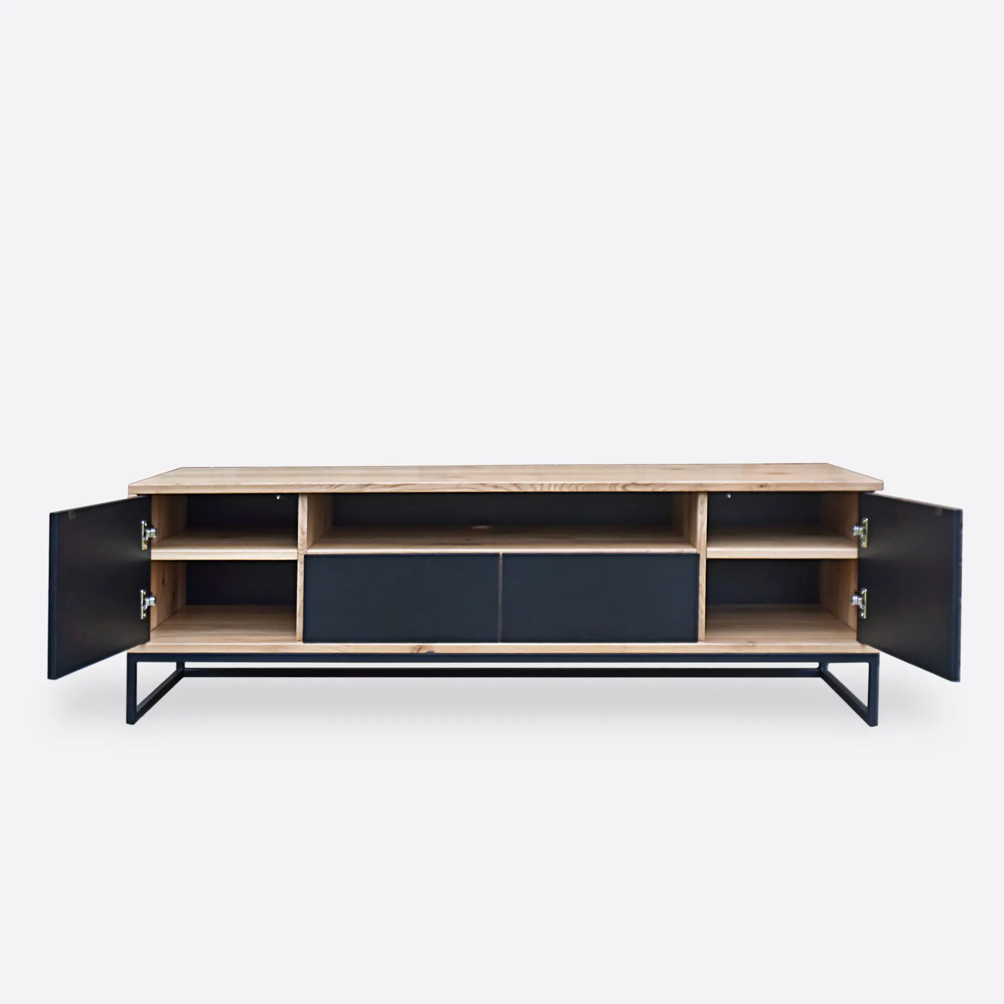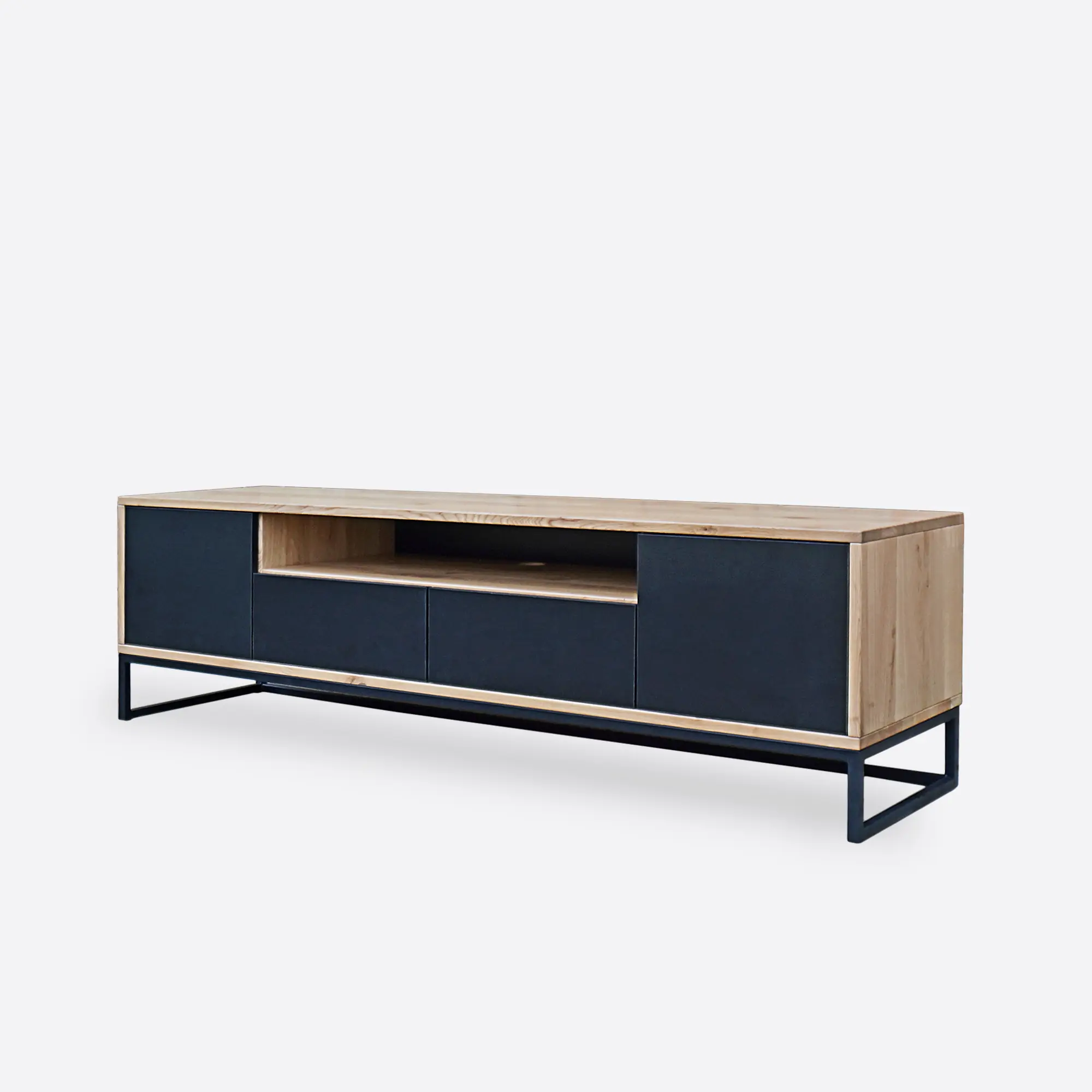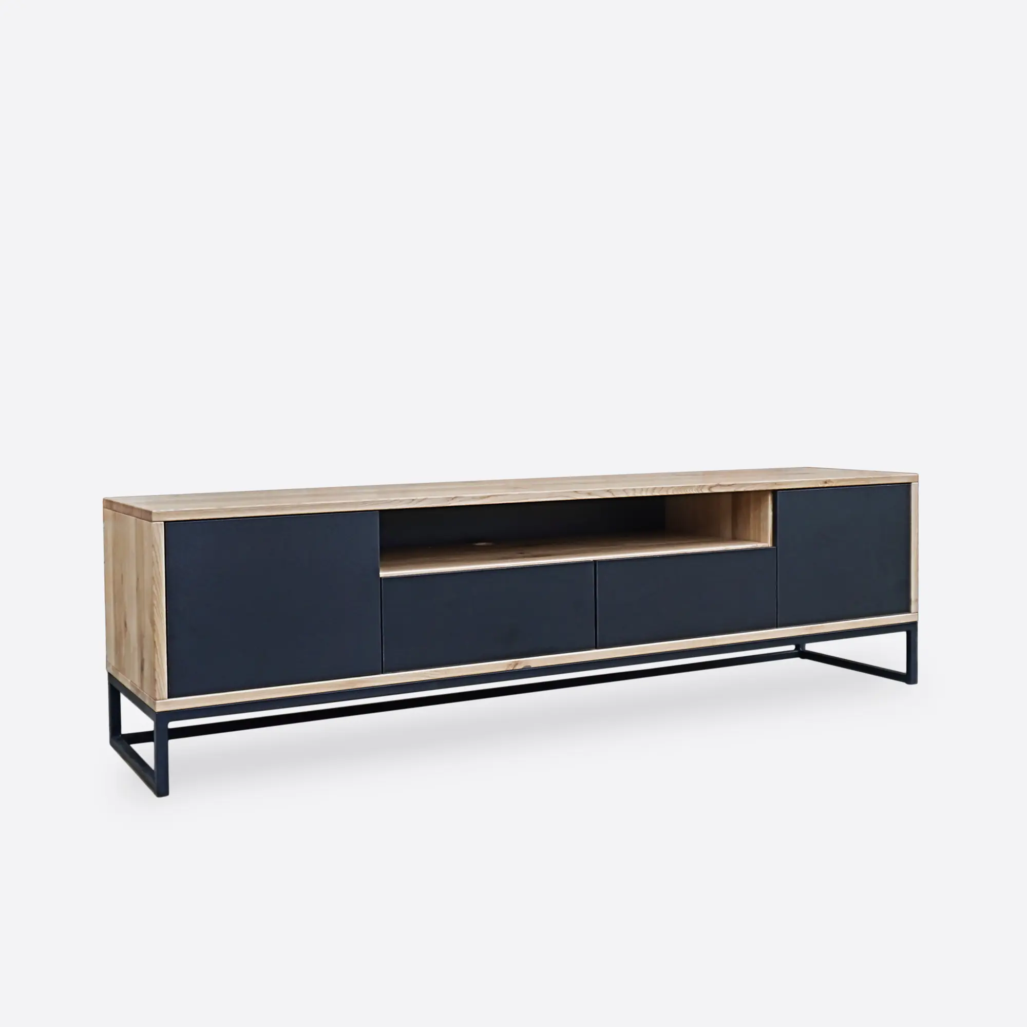 Carla III RTV cabinet made of oak wood, furniture board and metal base is a piece of furniture that combines durability and modern design. By choosing these materials, you get RTV furniture that is durable and easy to maintain and will become the focal point in the living room. Carla III RTV cabinet is a piece of furniture that breathes the warmth and a note of elegance into your interior. The cabinet body is made of solid oak wood, and oak guarantees durability and a unique appearance thanks to the characteristic wood grain. The cabinet fronts, realized from the furniture board, provide a smooth surface, which gives the furniture a modern look. Oak wood combined with a furniture plate creates a harmonious composition, combining traditional aesthetics with the functionality of modern design. The metal base is solid and modern support for the cabinet, adding an industrial accent to the whole. This basis not only ensures stability, but also contrasts with natural wood, giving the furniture a dynamic character. We designed the RTV cabinet for functionality. It has open shelves, where you will place audio-visual equipment, and at the same time allow you to display decorative elements. Closed cabinets and practical drawers offer a place to hide accessories, keeping order around the TV. The RTV cabinets of oak, furniture board and metal elements of the base are a perfect combination of tradition, modernity and functionality. Carla III RTV cabinet will blend in with both classic and modern interiors, giving them a unique character.