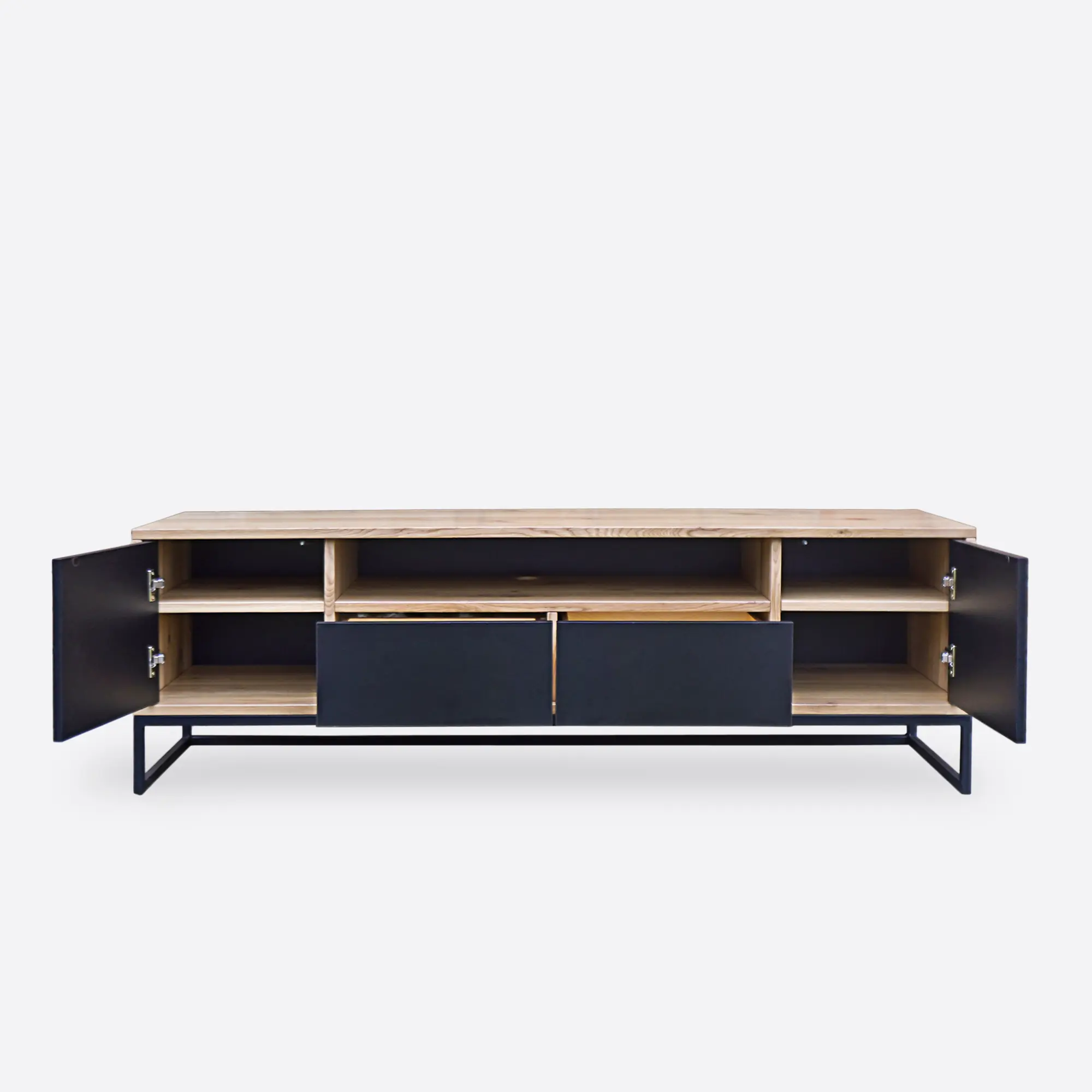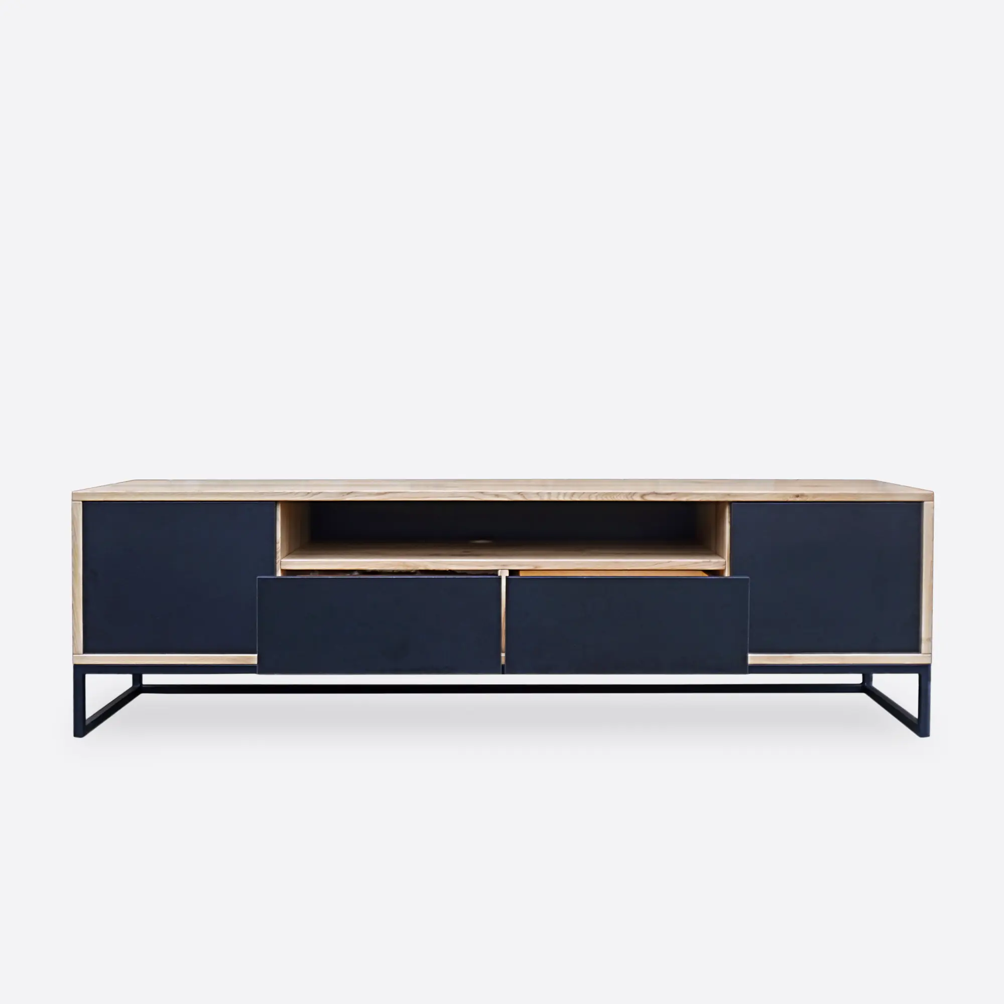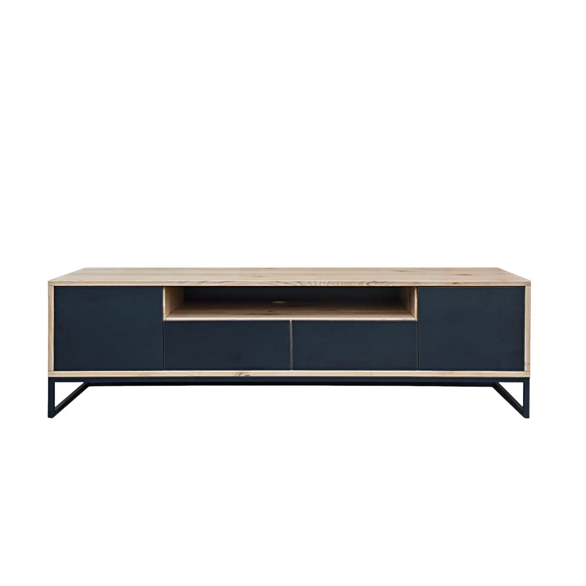 Carla III RTV cabinet made of oak wood, furniture board and metal base is a piece of furniture that combines durability and modern design. By choosing these materials, you get RTV furniture that is durable and easy to maintain and will become the focal point in the living room. Carla III RTV cabinet is a piece of furniture that breathes the warmth and a note of elegance into your interior. The cabinet body is made of solid oak wood, and oak guarantees durability and a unique appearance thanks to the characteristic wood grain. The cabinet fronts, realized from the furniture board, provide a smooth surface, which gives the furniture a modern look. Oak wood combined with a furniture plate creates a harmonious composition, combining traditional aesthetics with the functionality of modern design. The metal base is solid and modern support for the cabinet, adding an industrial accent to the whole. This basis not only ensures stability, but also contrasts with natural wood, giving the furniture a dynamic character. We designed the RTV cabinet for functionality. It has open shelves, where you will place audio-visual equipment, and at the same time allow you to display decorative elements. Closed cabinets and practical drawers offer a place to hide accessories, keeping order around the TV. The RTV cabinets of oak, furniture board and metal elements of the base are a perfect combination of tradition, modernity and functionality. Carla III RTV cabinet will blend in with both classic and modern interiors, giving them a unique character.