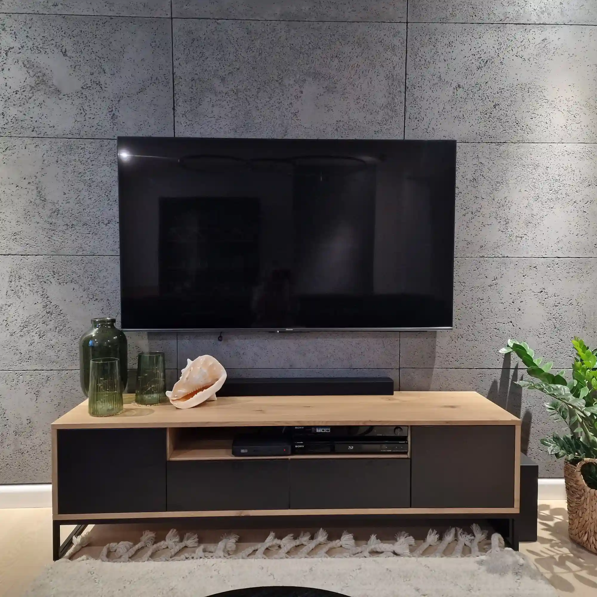 Standard media units often require compromises. They may not match the width of your screen, lack storage for devices or fail to integrate cables discreetly. As a result, the media wall can appear visually unbalanced.
