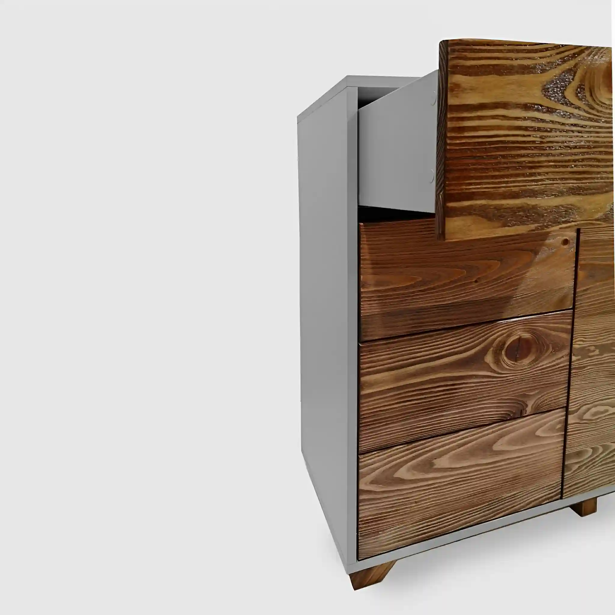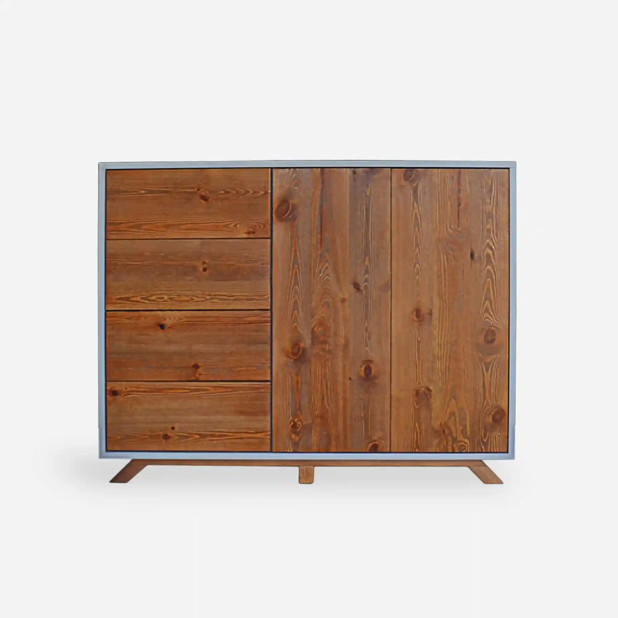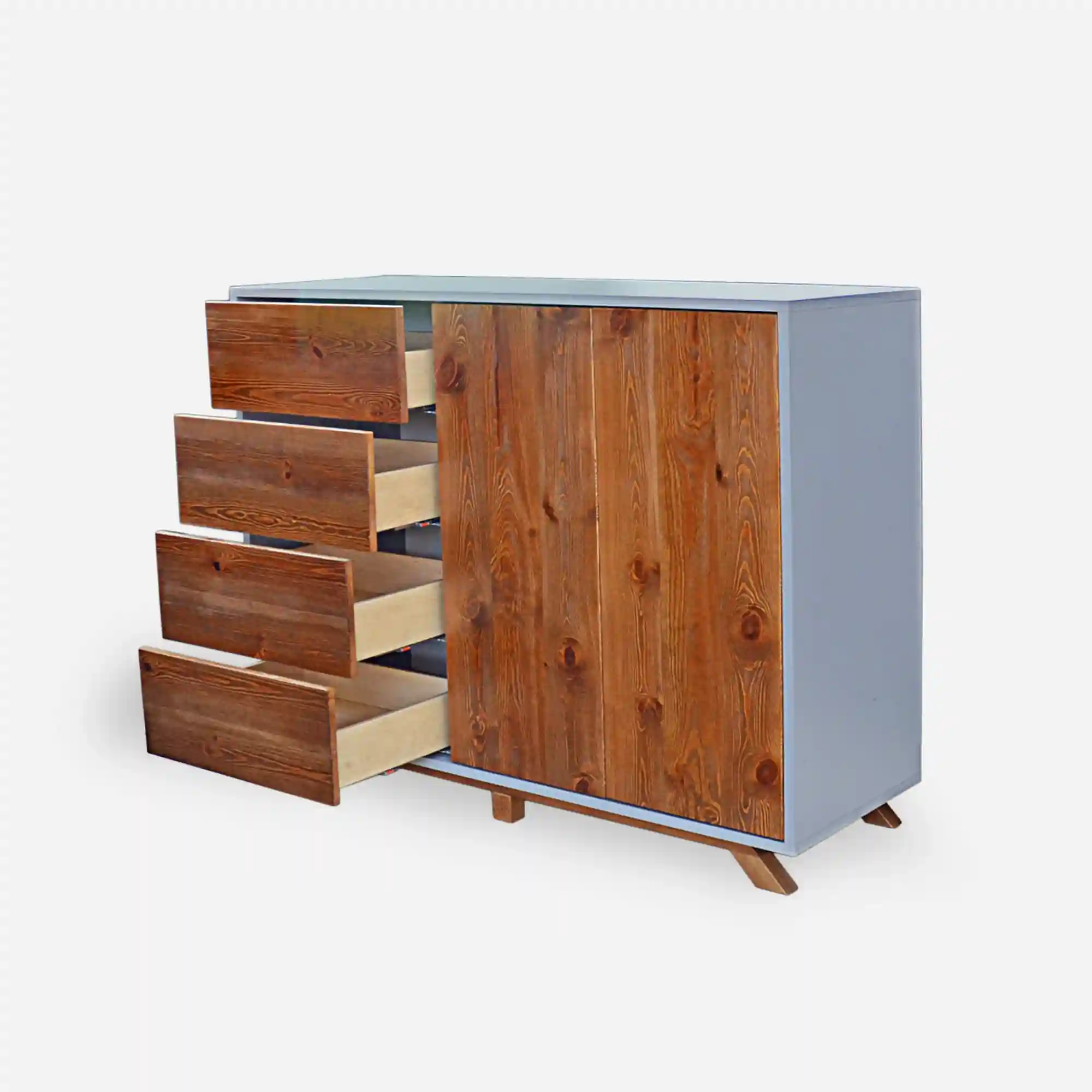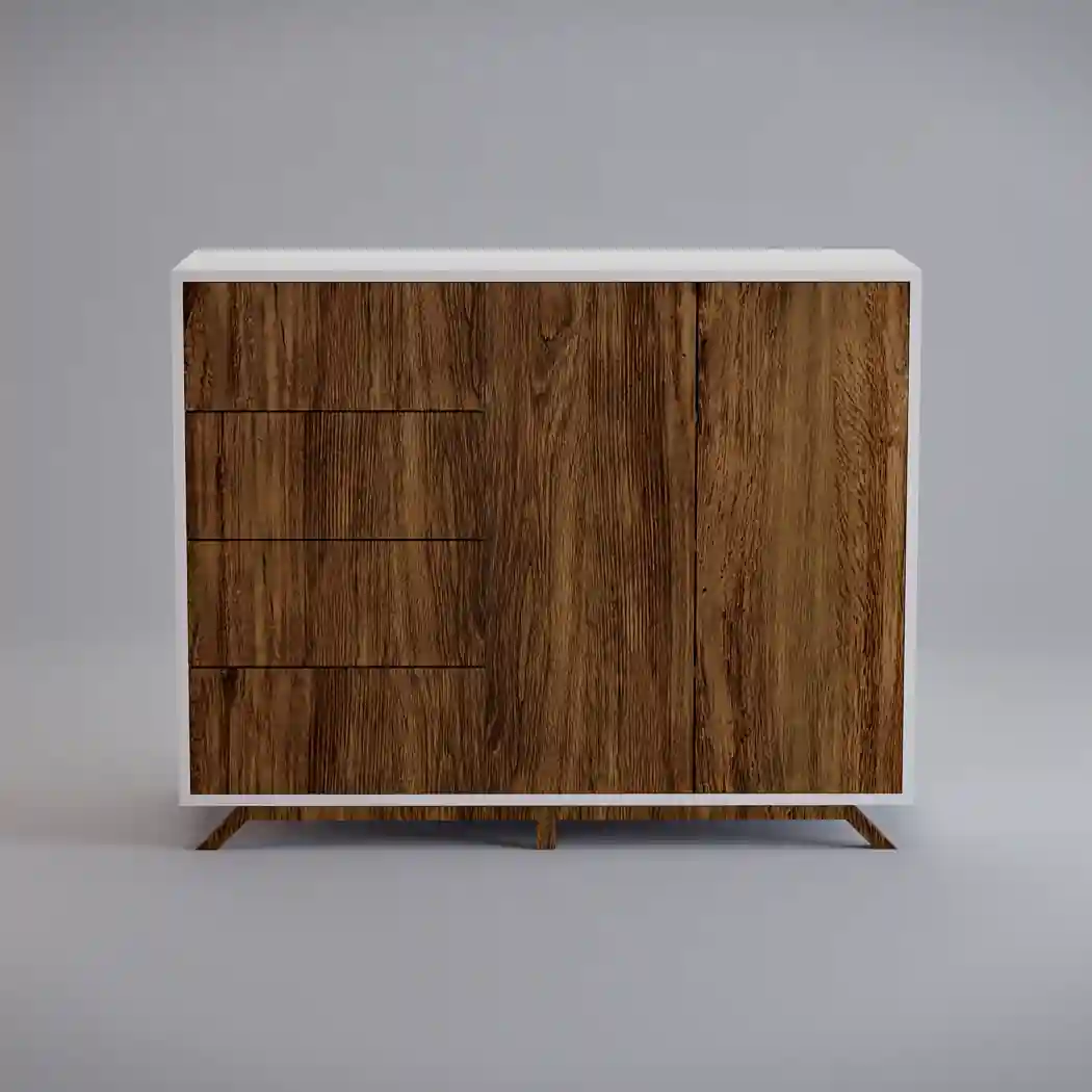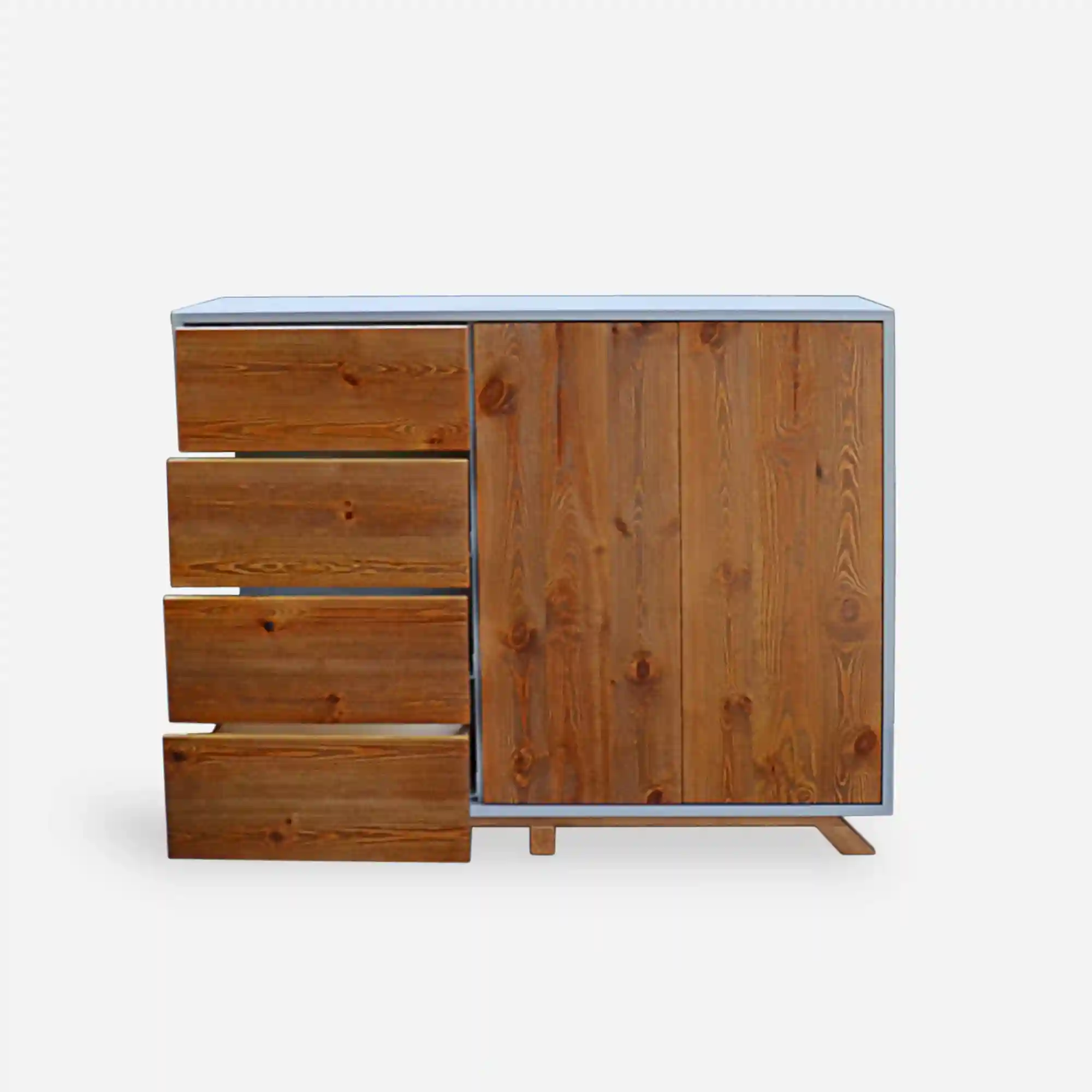A modern wooden chest of drawers with fronts made of old solid wood BERGEN is a solution for organization not only in the bedroom, but also in the dining room or in the study. The furniture is made of solid wood in combination with laminated board. The mdf body gives lightness to the chest of drawers. Wooden wood, apart from its beautiful appearance, also offers a lot of storage space. The furniture has 4 drawers and a large cabinet with shelves. Modern wooden chest of drawers BERGEN impresses with its aesthetics and designer form of workmanship, but also with sensationally planned usable space. A wooden chest of drawers is not only a storage space, but also a piece of furniture for electronics equipment.