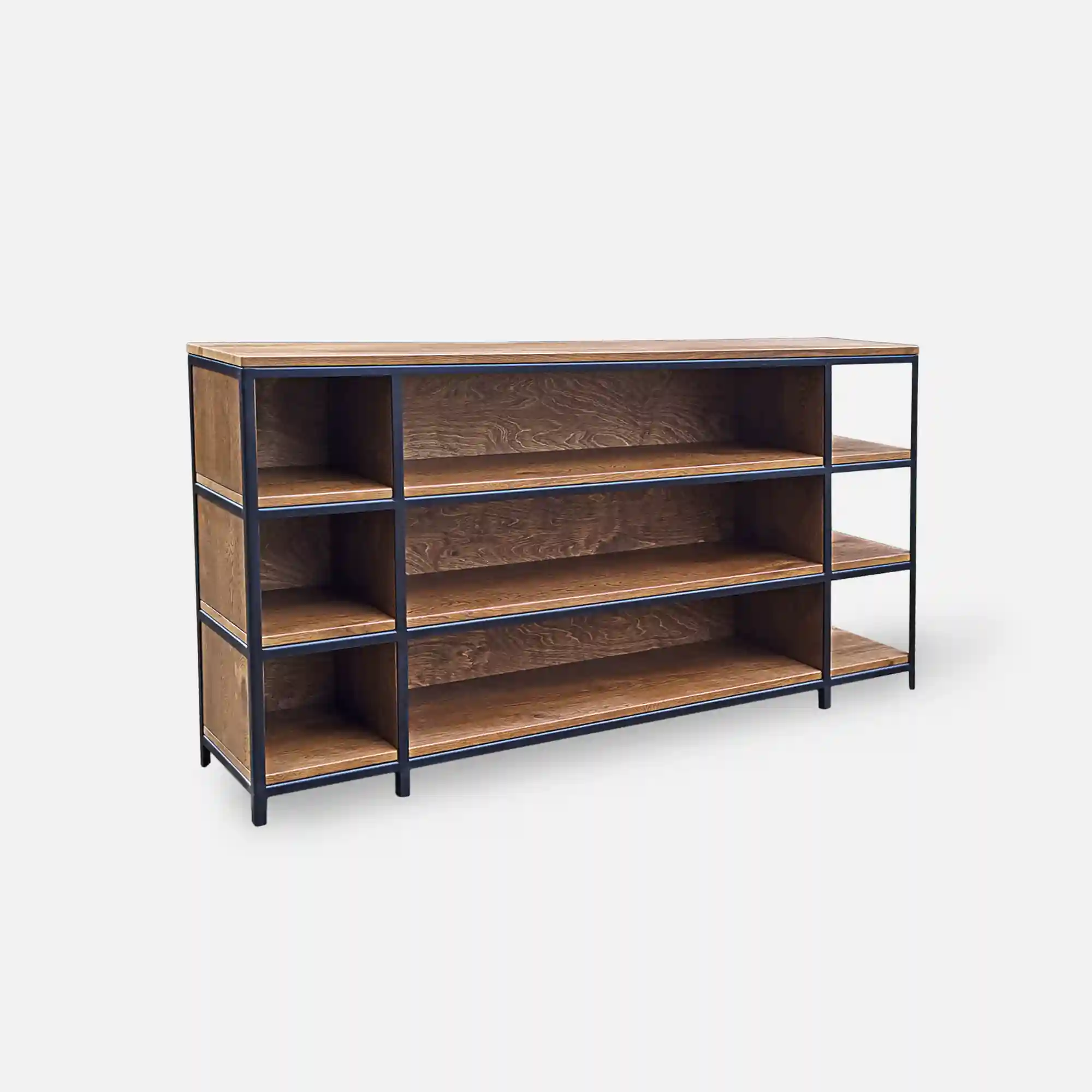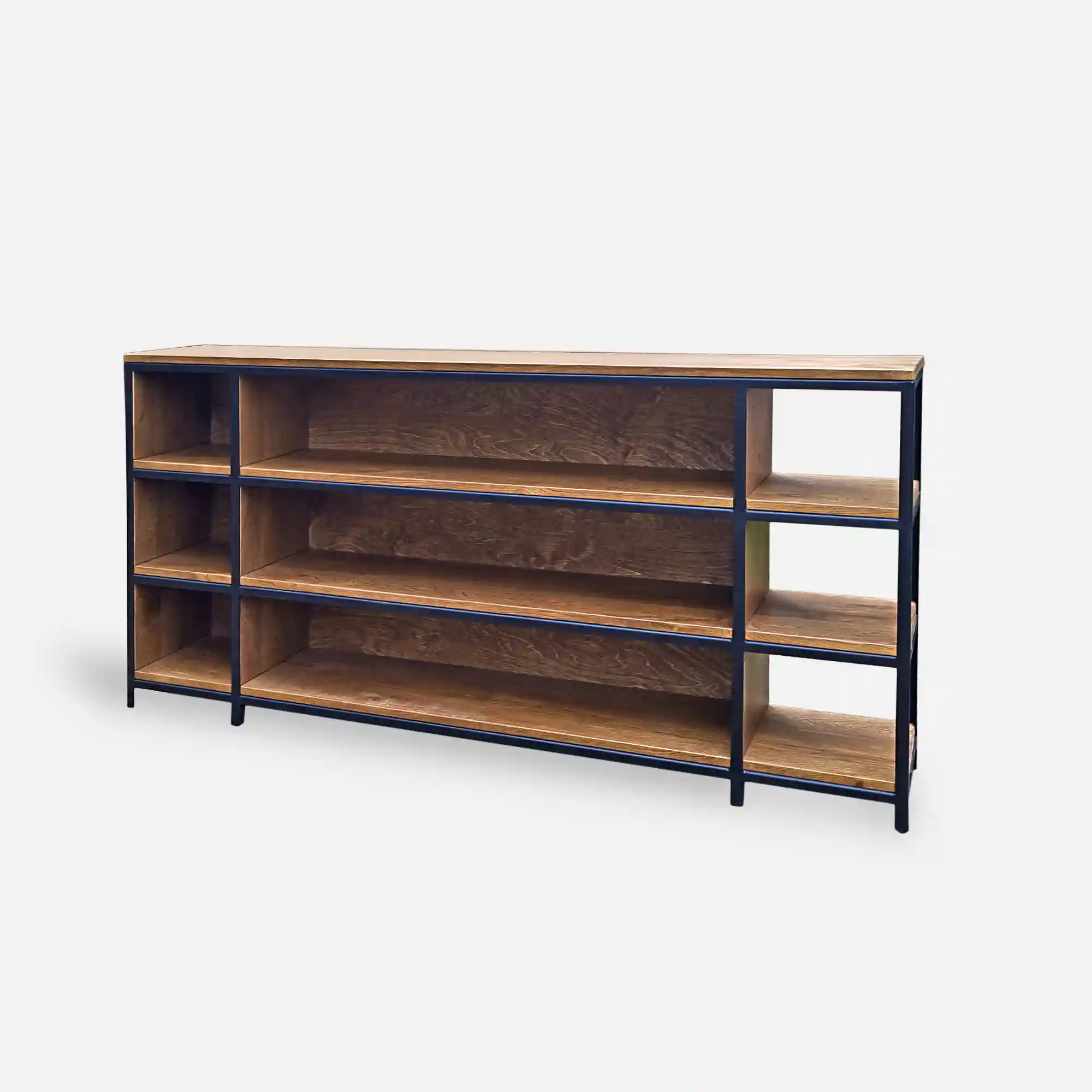 Oak bookcase of solid wood was hand-made with attention to every detail. The furniture was made of solid oak wood, which is distinguished by an impressive grain. Delicate oak décor in natural tones is the greatest asset of the furniture. In addition, oak bookcase of solid wood has a solid metal structure that will ensure the durability and stability of the furniture. The steel was protected with black powder coating. Industrial oak rack offers the possibility of choosing the color of wood and steel according to your needs. Thanks to this, it is easy to match the appearance of the furniture to the arrangement of the room. HUGON oak bookcase will provide plenty of space for books and documents, and at the same time make the room stylish and cozy. The bookcase will fit into the interiors decorated in industrial style and loft style. In modern interiors, black color combined with wood will also look stylish and tasteful.