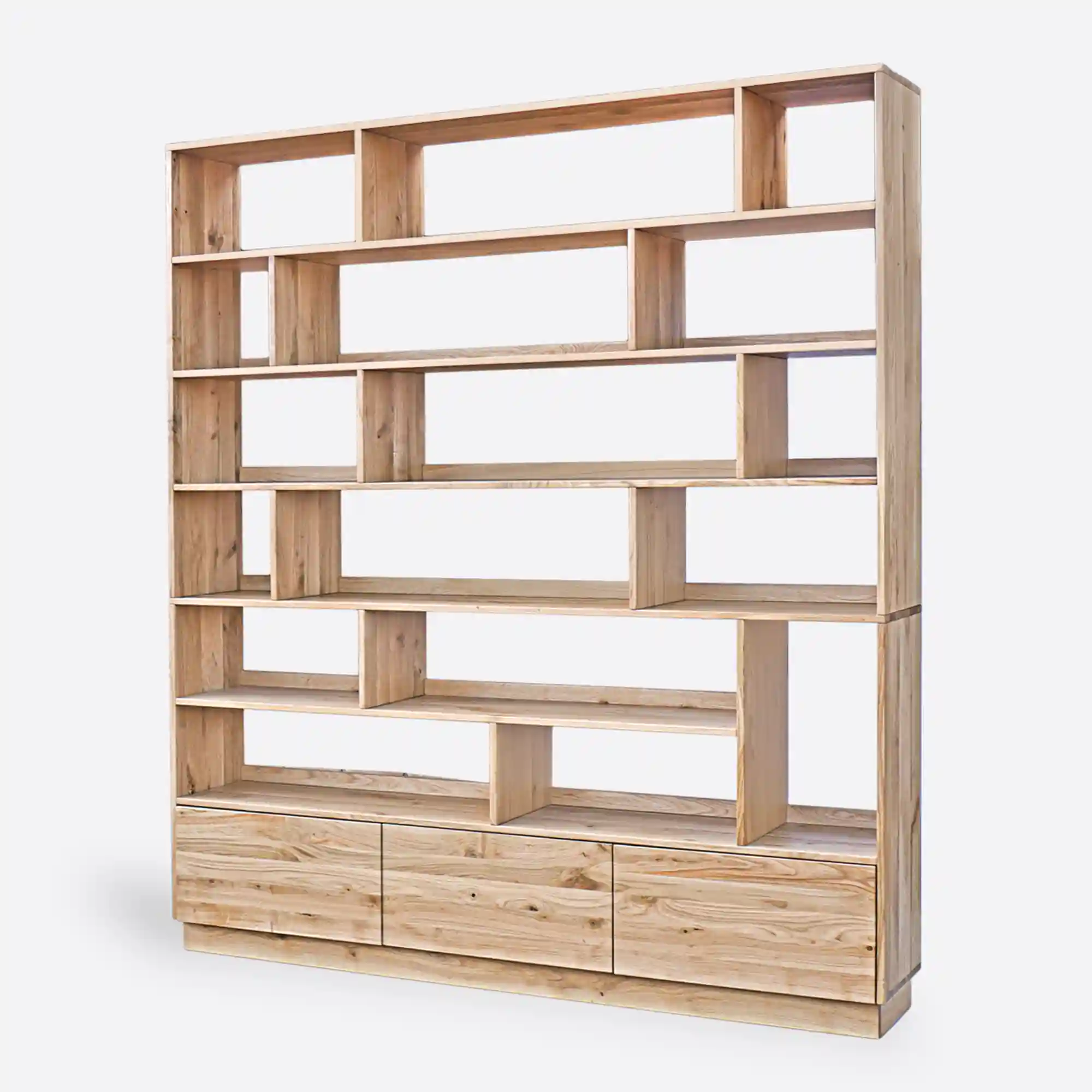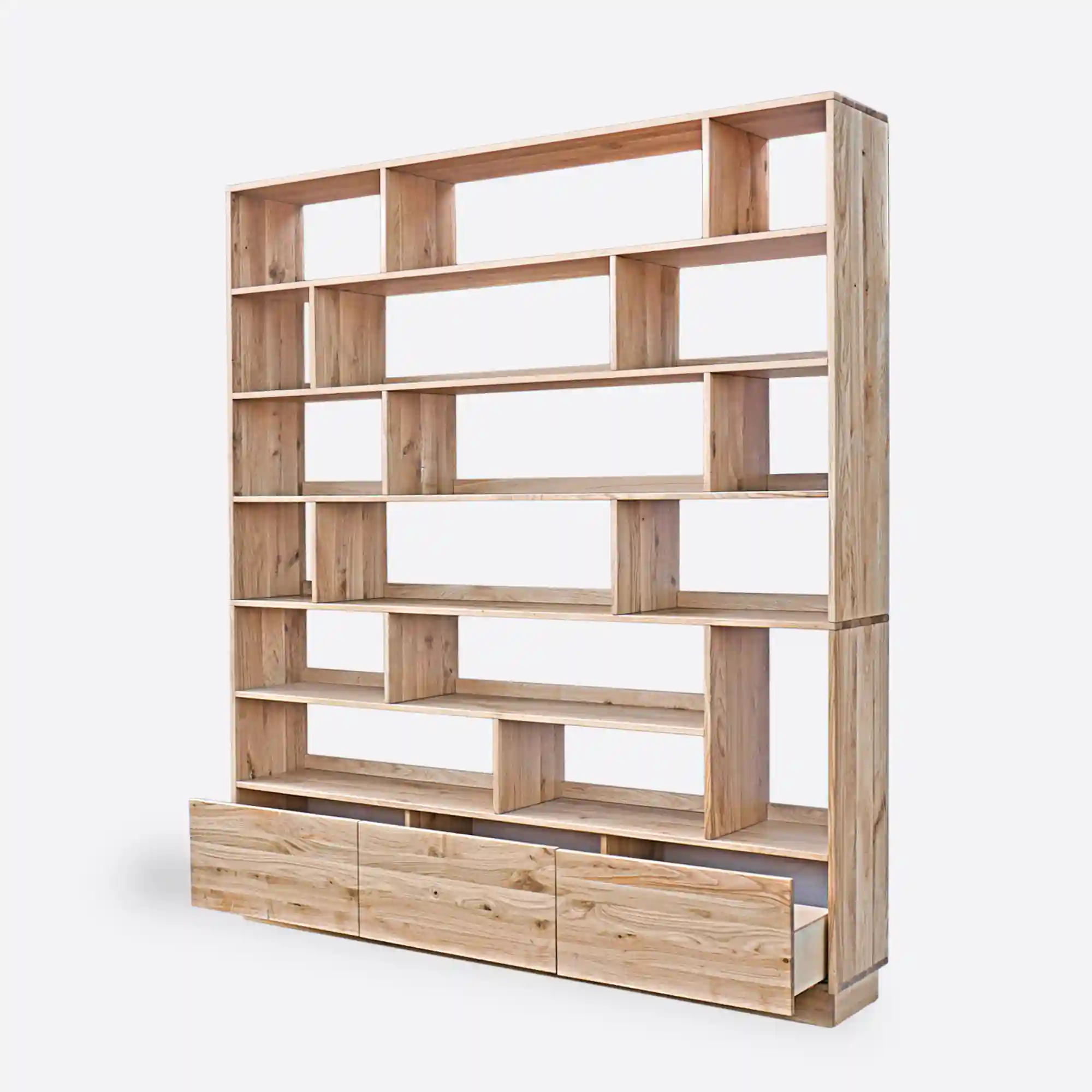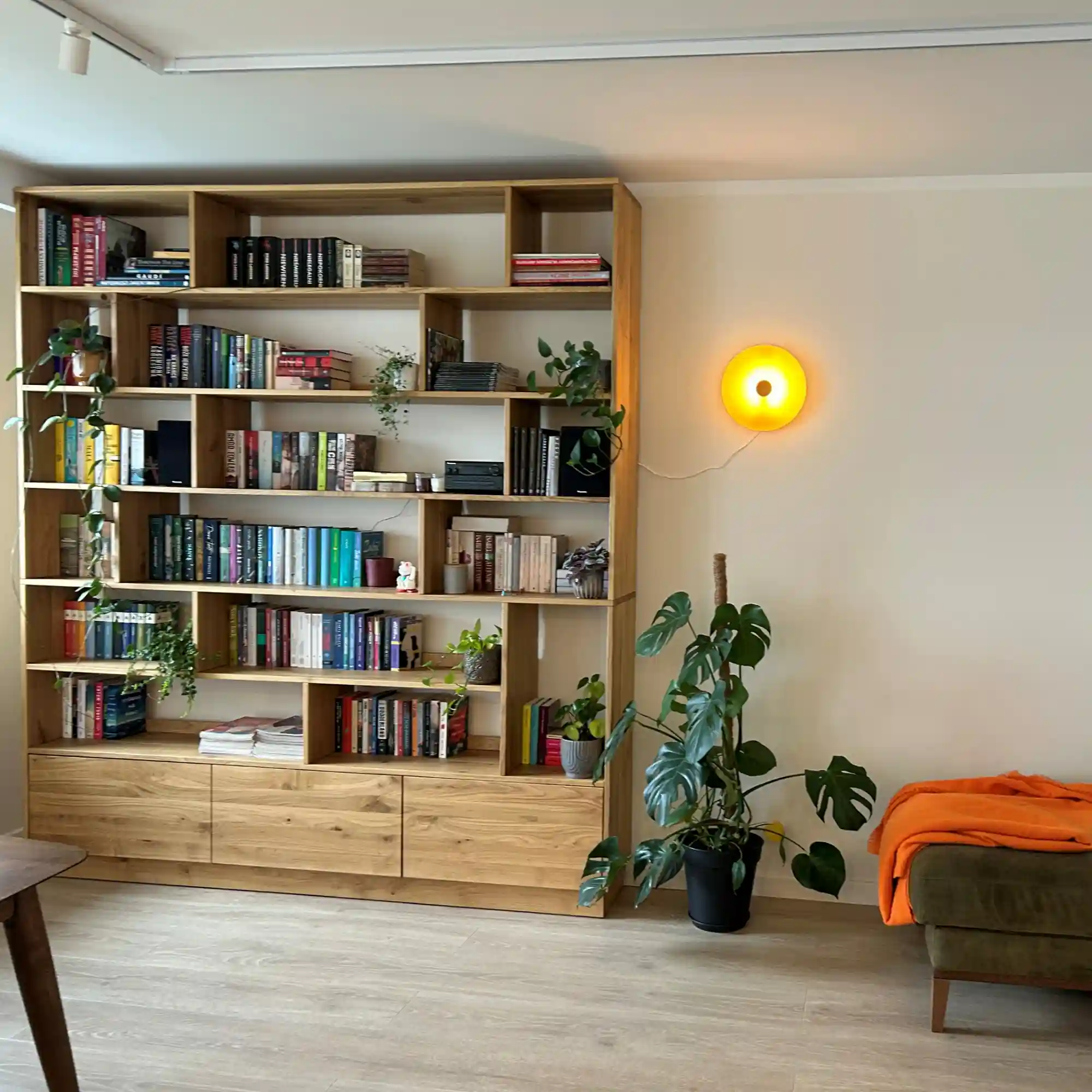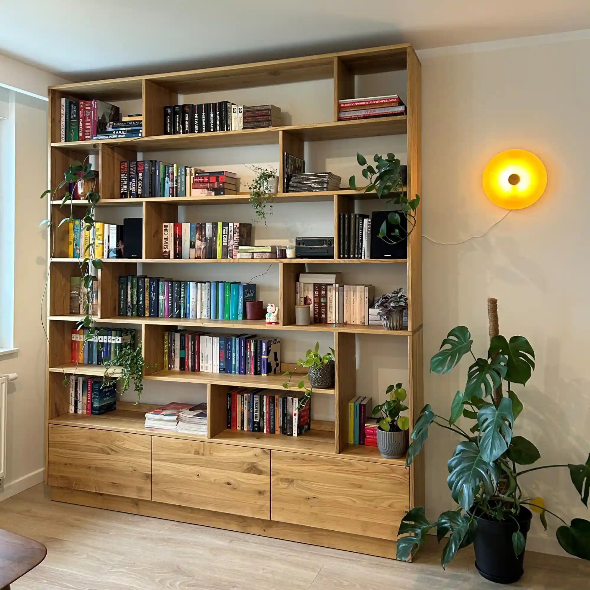 The VITA II oak bookcase with drawers and wooden base is a combination of functionality, aesthetics and solid workmanship. We designed it with modern interiors in mind, where simplicity of form and natural materials count. The characteristic arrangement of the shelves – irregular but harmonious – makes the piece of furniture not only practical but also decorative. The open spaces are ideal for books, documents, plants or decorative objects. Open shelves in an irregular arrangement give the furniture a light feel. The lockable drawers in the lower part will accommodate everything that does not necessarily need to be in view. The whole is set on a solid oak base, which guarantees stability and an elegant finish.