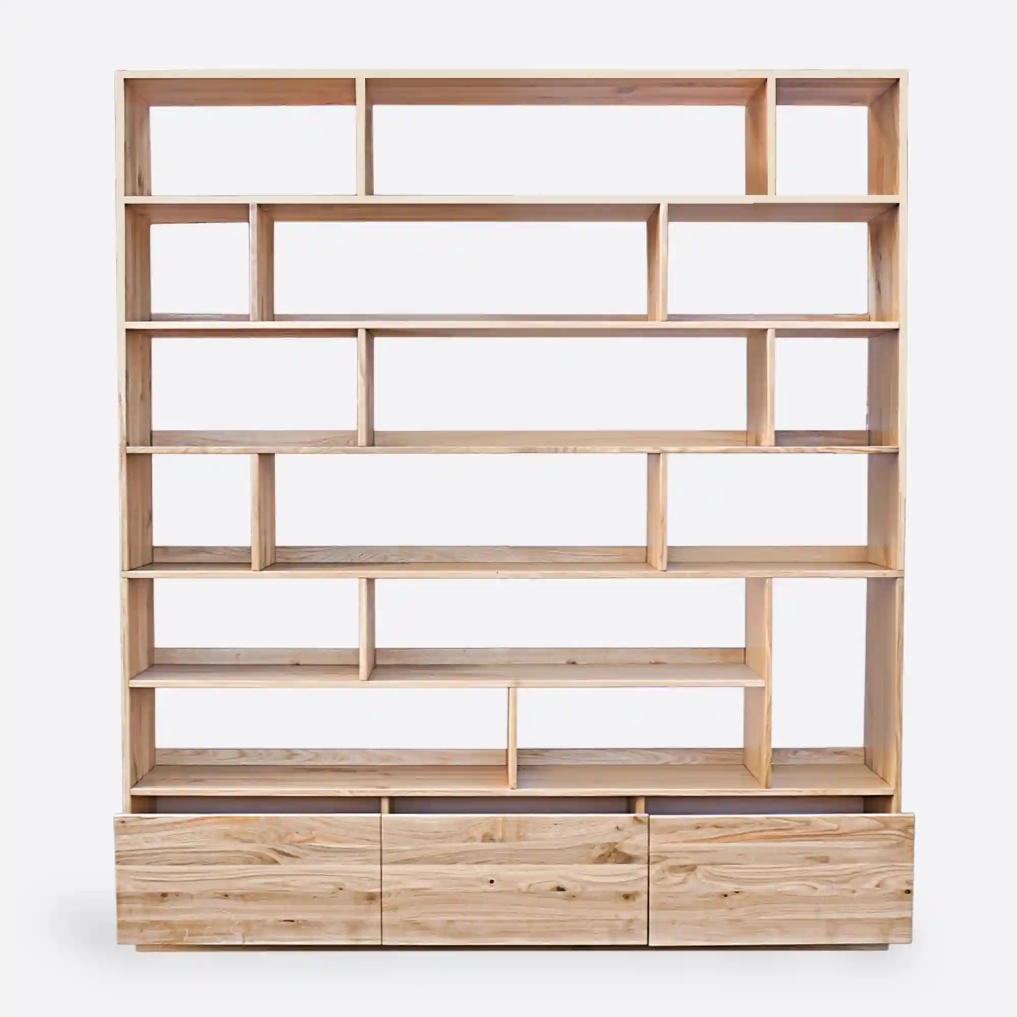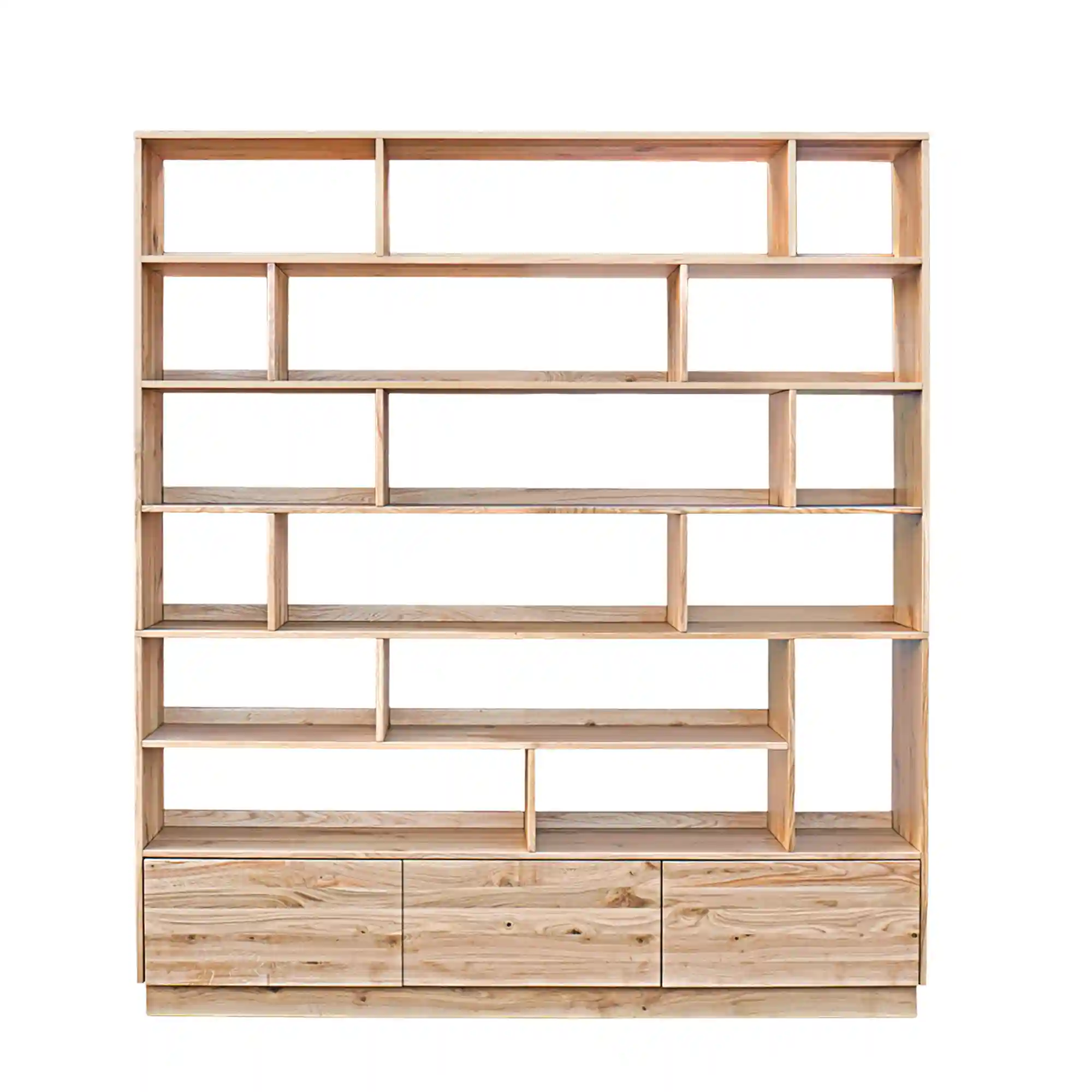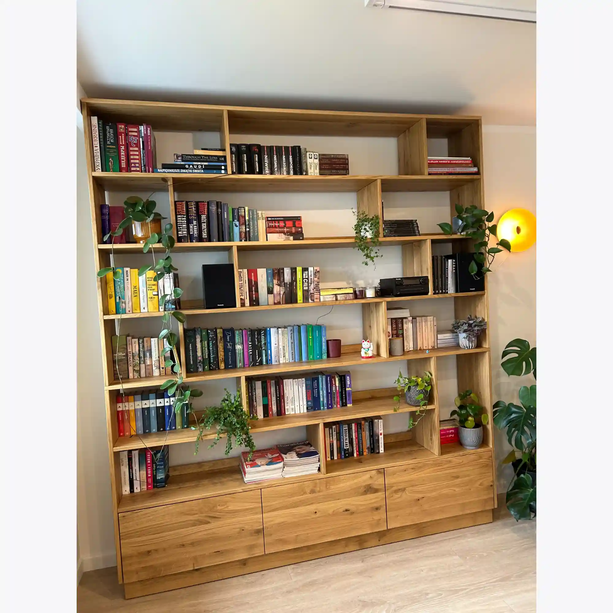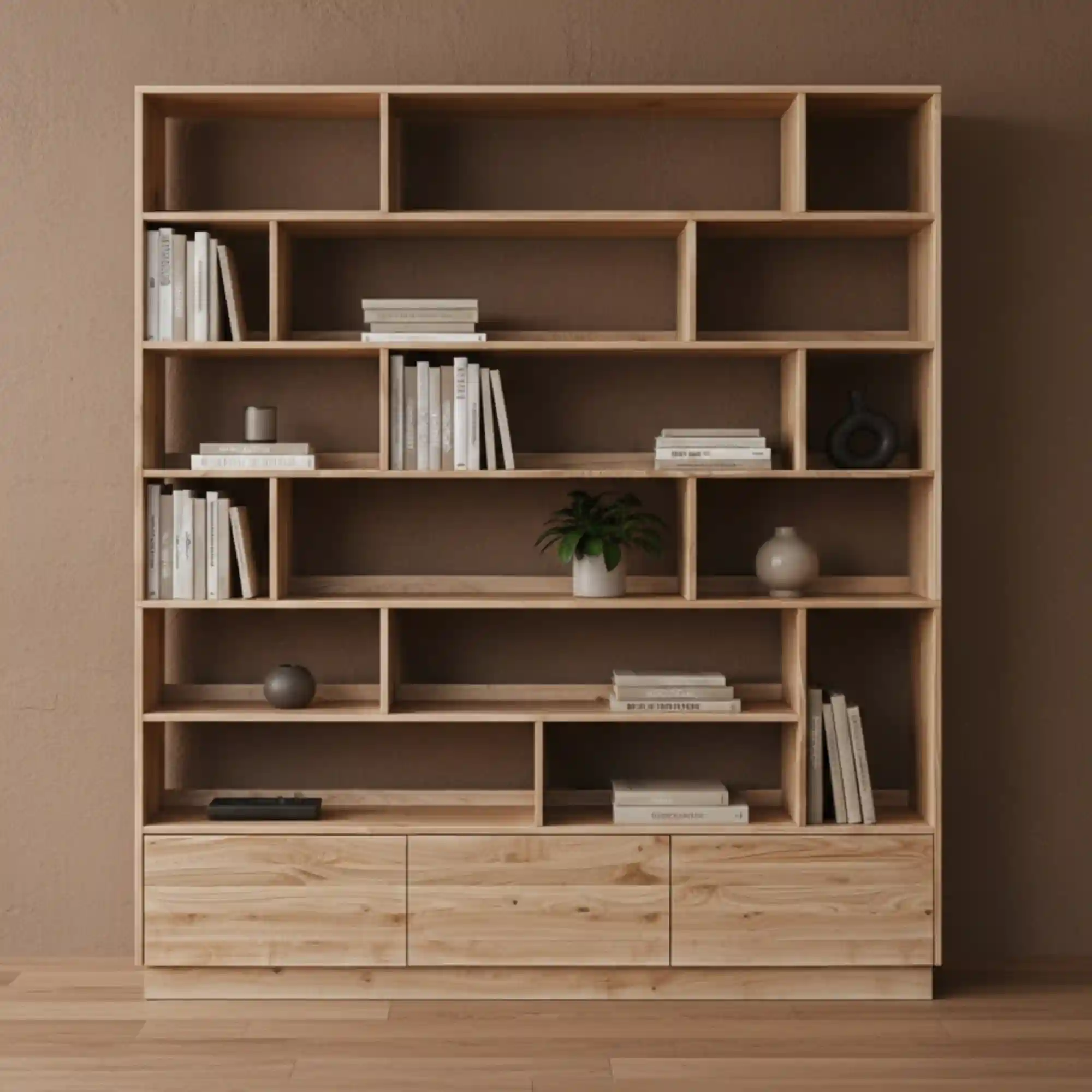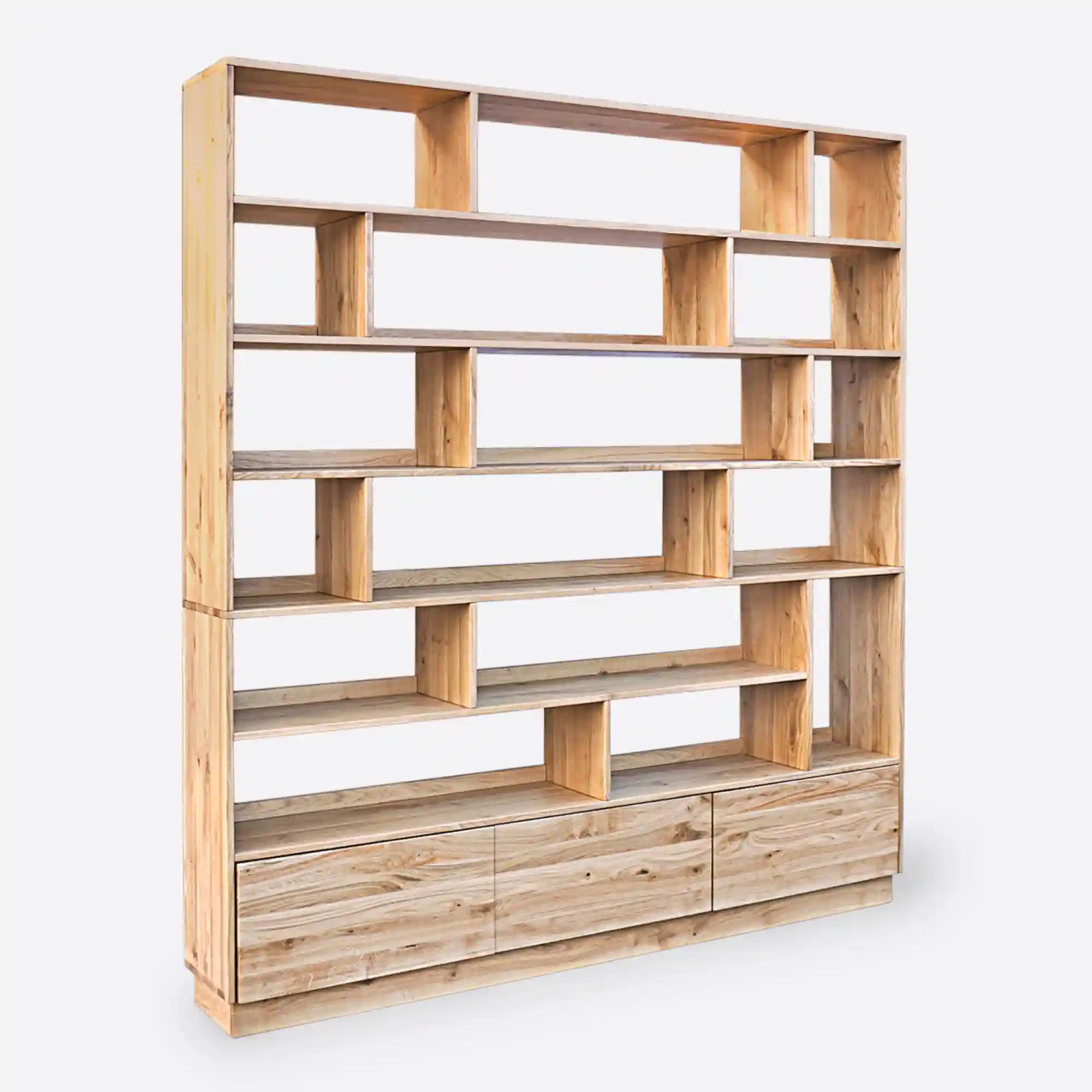 The VITA II oak bookcase with drawers and wooden base is a combination of functionality, aesthetics and solid workmanship. We designed it with modern interiors in mind, where simplicity of form and natural materials count. The characteristic arrangement of the shelves – irregular but harmonious – makes the piece of furniture not only practical but also decorative. The open spaces are ideal for books, documents, plants or decorative objects. Open shelves in an irregular arrangement give the furniture a light feel. The lockable drawers in the lower part will accommodate everything that does not necessarily need to be in view. The whole is set on a solid oak base, which guarantees stability and an elegant finish.