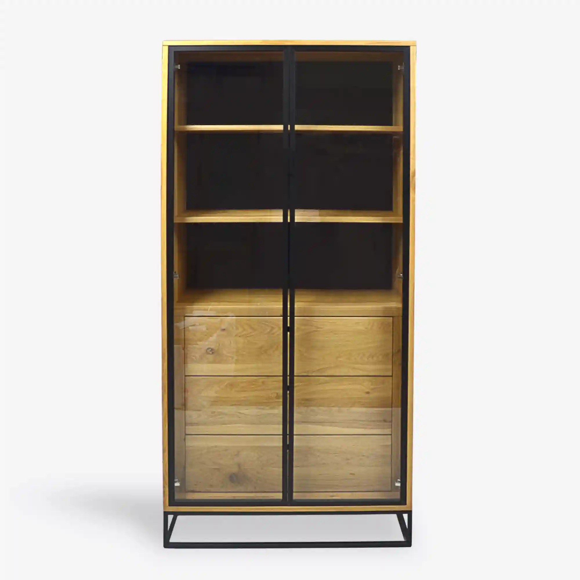 Our oak showcase is a proposal for lovers of modern, functional interiors. The furniture is made in a modern style of solid oak with a natural color. Thanks to this, the structure of the wood is clearly visible, and in addition, each piece of furniture gains a unique character. The wooden display case has a glass door with a black metal frame and handles. The industrial base of the furniture is made of powder-coated steel in black. The oak display case consists of a glazed part with two shelves and three drawers located at the bottom of the furniture. Thanks to this, the industrial oak display case will provide you with a lot of space to display your memorabilia, decorations as well as storing documents and binders. Furniture from the MERIS collection designed for people looking for interesting, modern solutions when furnishing their dream interiors. The oak display case on the metal legs of MERIS III will uniquely emphasize the character of any living room, dining room or study.