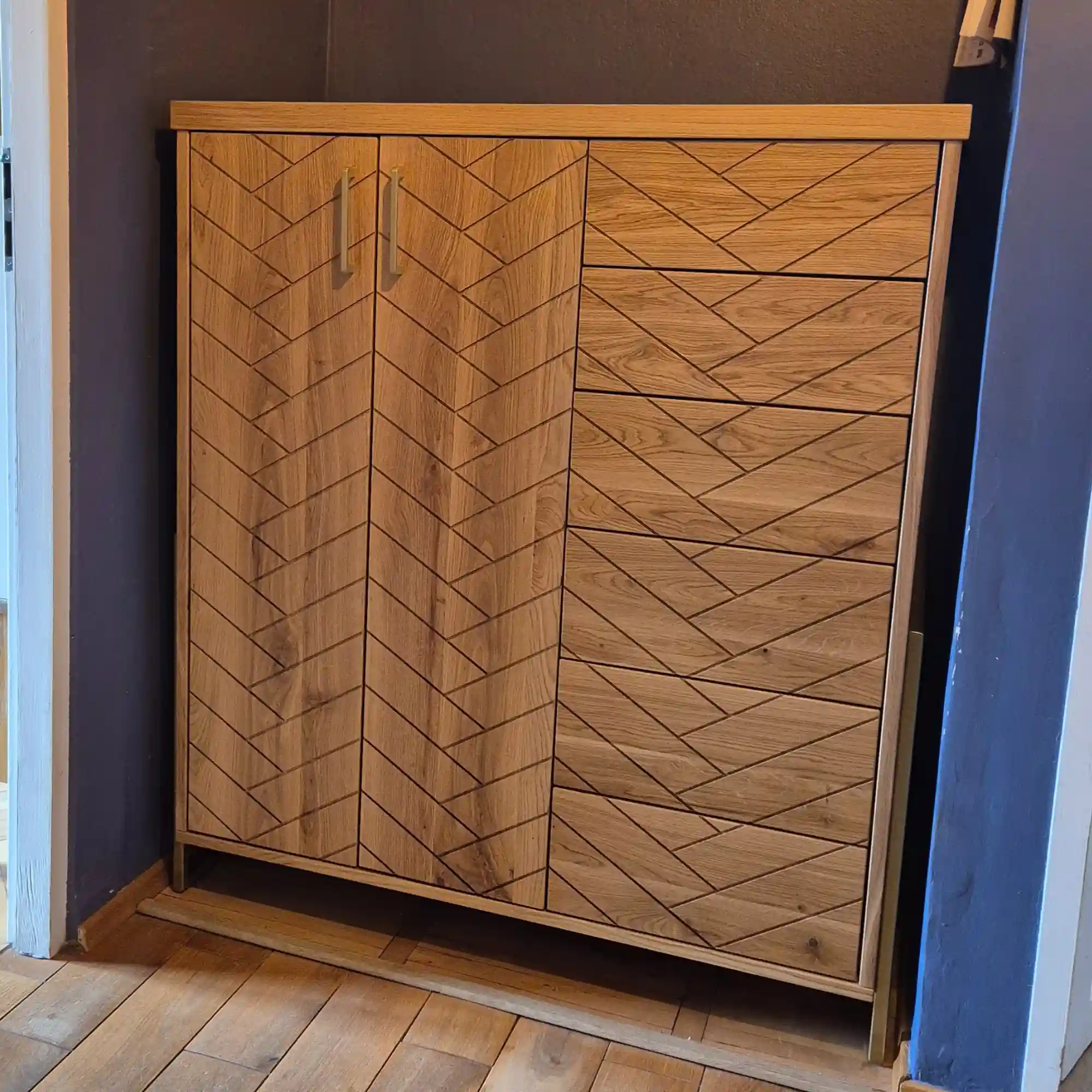 Oak chest of drawers with herringbone pattern to living room CARIN