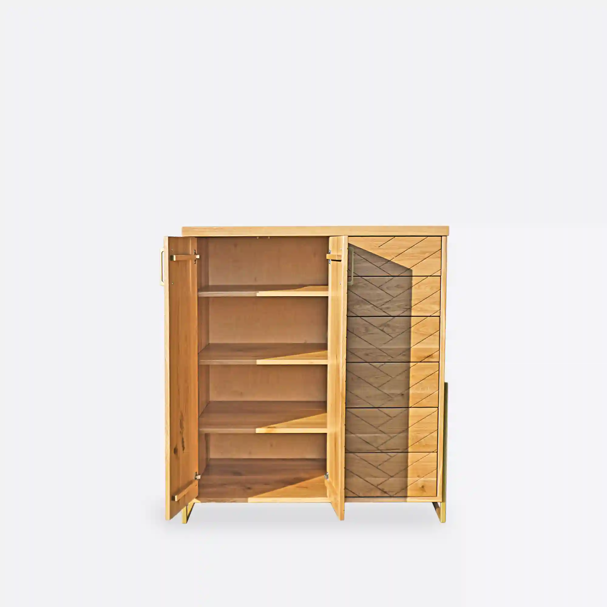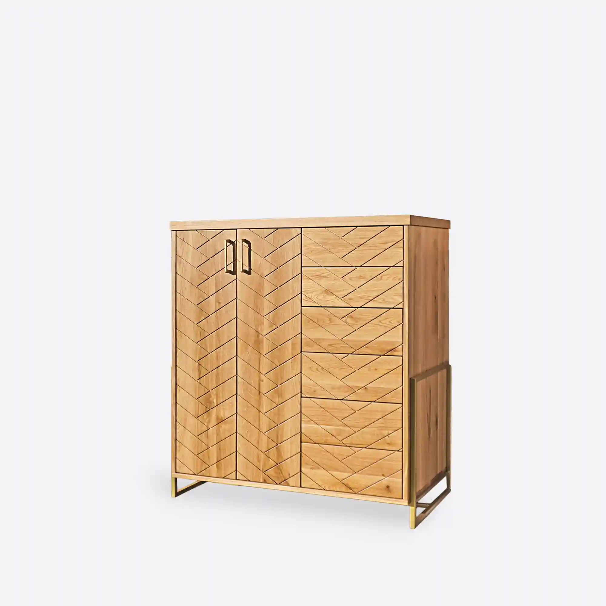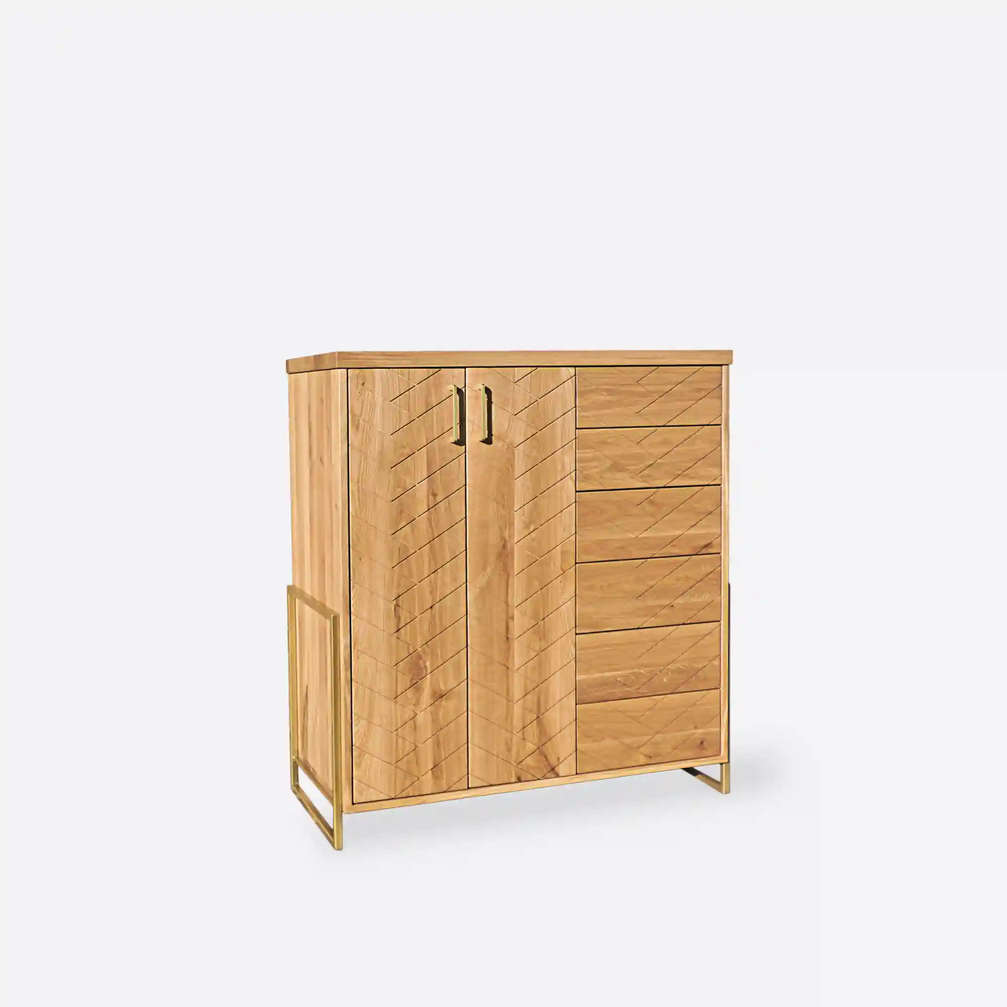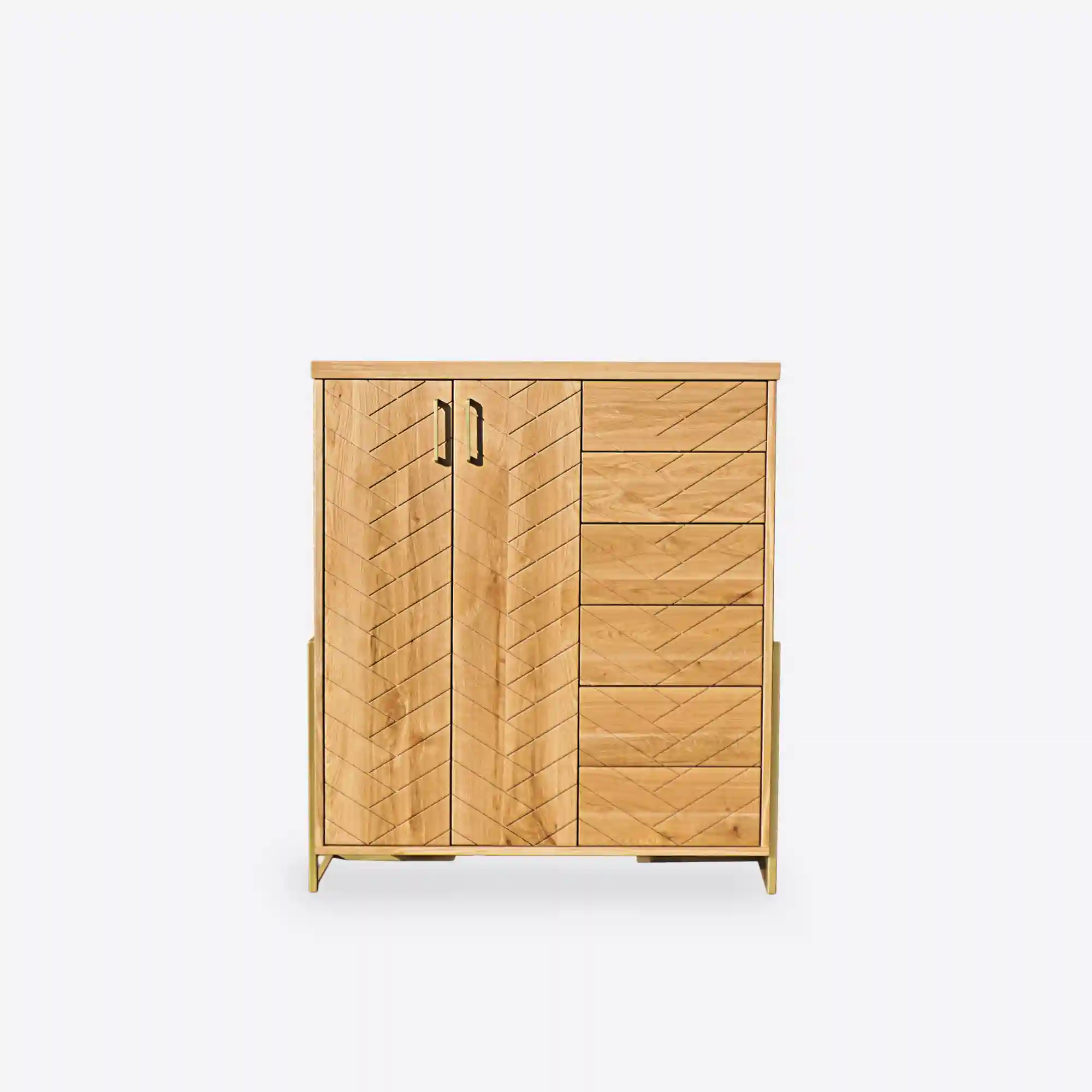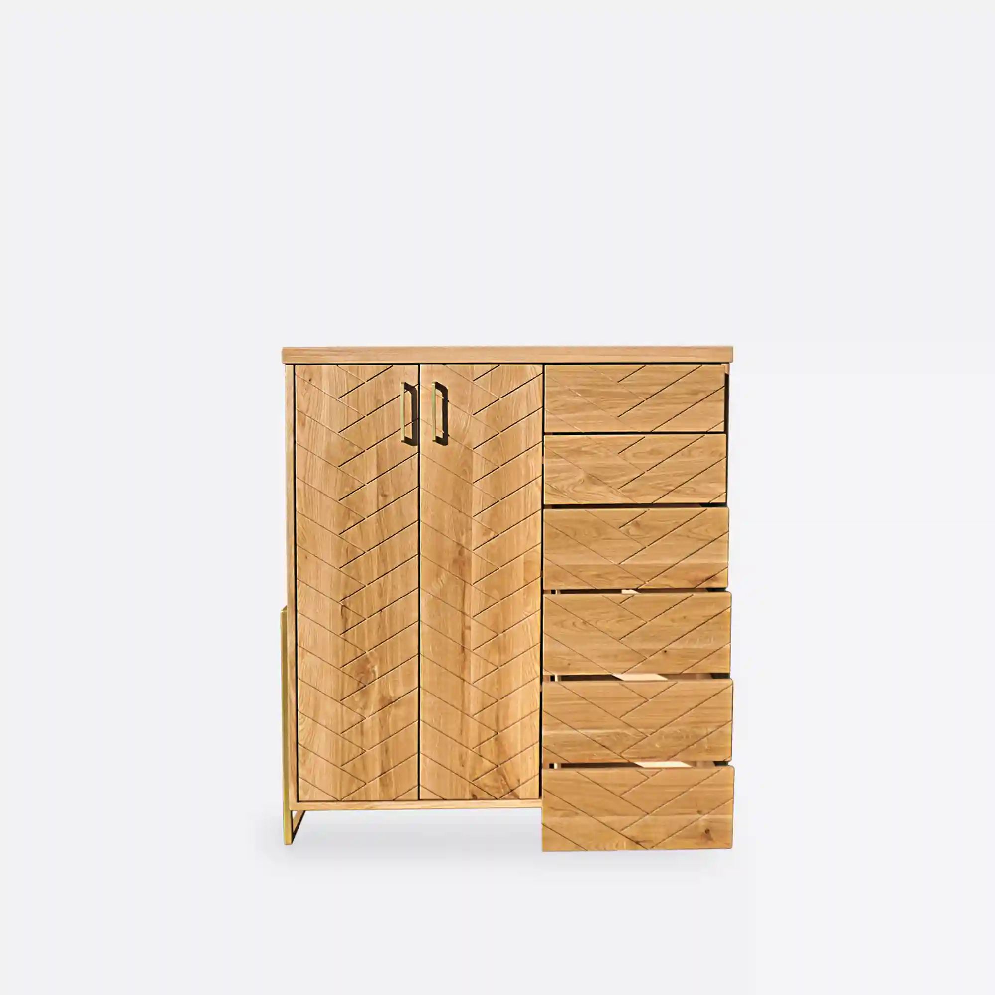 Oak chest of drawers with herringbone pattern CARIN is perfect for every living room or bedroom. Dresser is made of natural solid oak wood, which is solid, durable and beautiful. Meanwhile, the legs and handles are made of gold powder-coated steel. Modern oak chest of drawers has large cabinet with shelf inside and four drawers. This makes the wooden chest of drawers CARIN very roomy and functional, with plenty of storage space. Wooden chest of drawers looks very interesting and original, thanks to the milling on the fronts, which gives the effect of herringbone arrangement of wood. In addition, solid oak wood will ensure the uniqueness of furniture, thanks to its original grain. Modern herringbone oak wood dresser CARIN is combination of modern style and classic, which will fit perfectly in the living room, living room or bedroom.