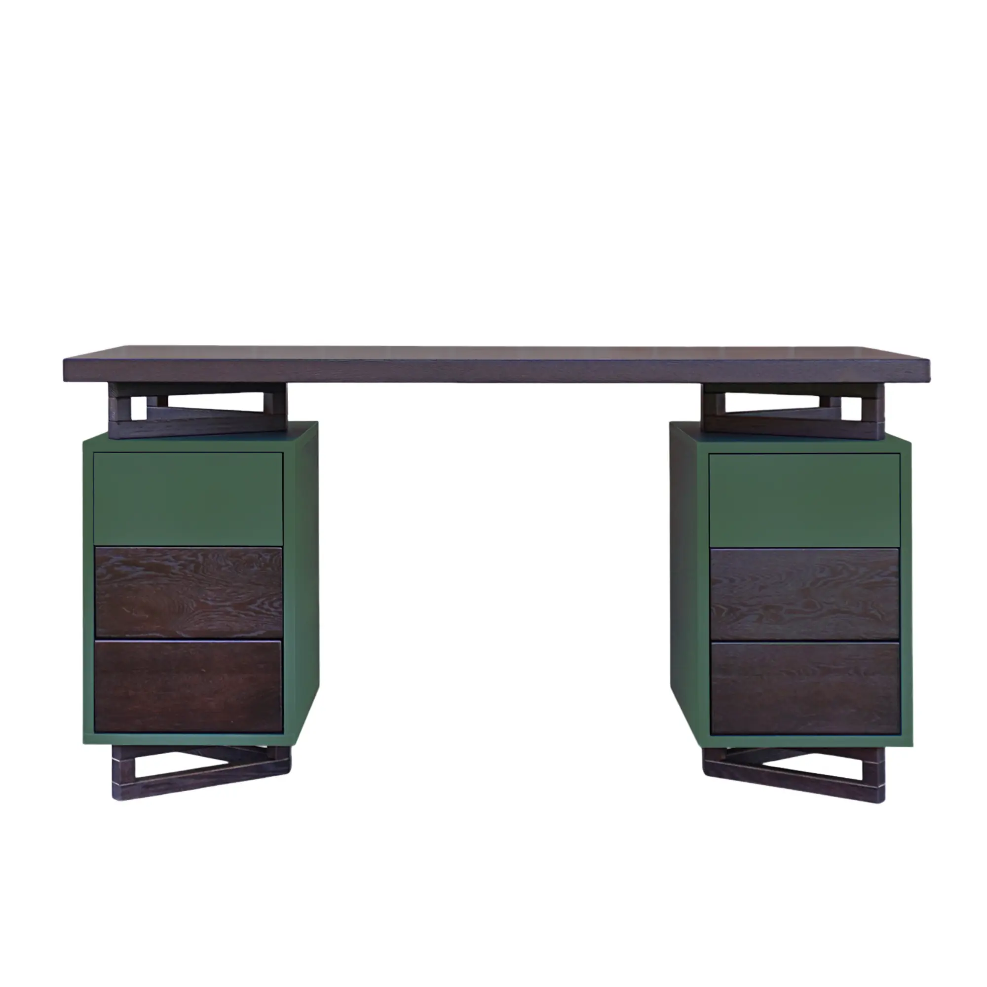 An oak desk with NORD containers is a practical piece of equipment for a room, study or office. The designer desk is made by hand from slab and solid wood, which guarantees the highest quality of workmanship and certainty that the furniture will serve us for many years. The stylish desk with drawers is made of solid oak wood in combination with laminated board. The top and fronts of four drawers are made of cherry-colored oak wood. The body of the container and two drawer fronts made of laminated board in Labrador color. The modern wooden desk is easy to care for and is a practical choice for years. A wooden desk made of solid wood is extremely capacious, because it has two containers, each with three drawers, which will allow for optimal organization of work. Oak desk with containers will certainly be great in the office, office or office. It is also possible to change the colors of wood and board so that stylish desks fit perfectly into your interior! Stylish desks made of solid wood are the perfect choice for the office or study.