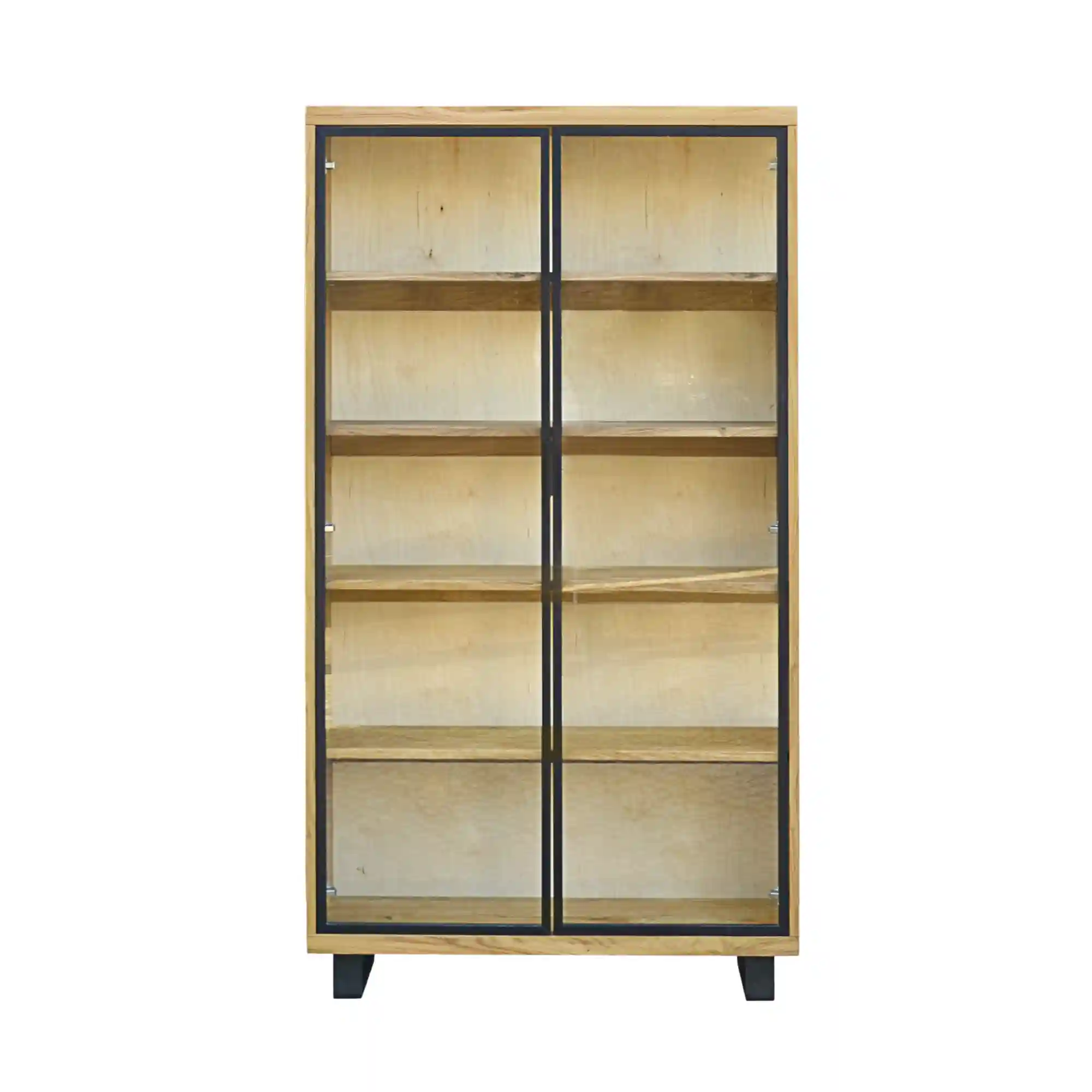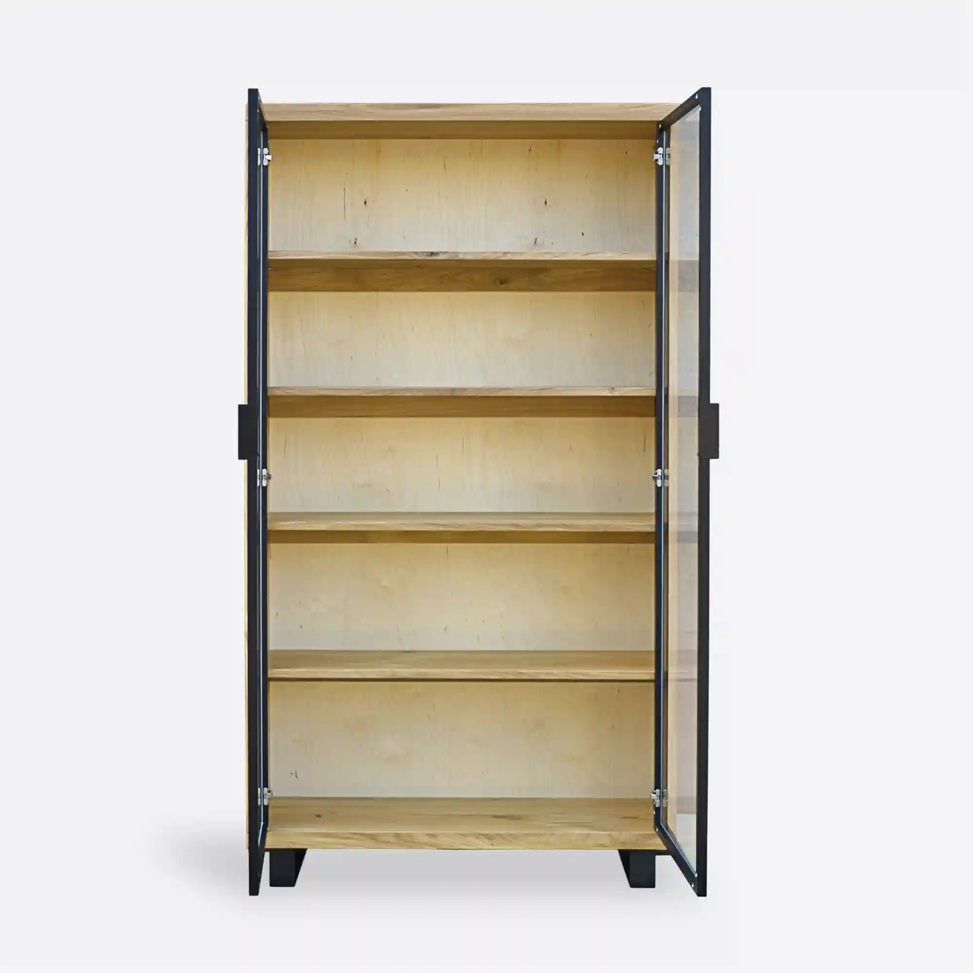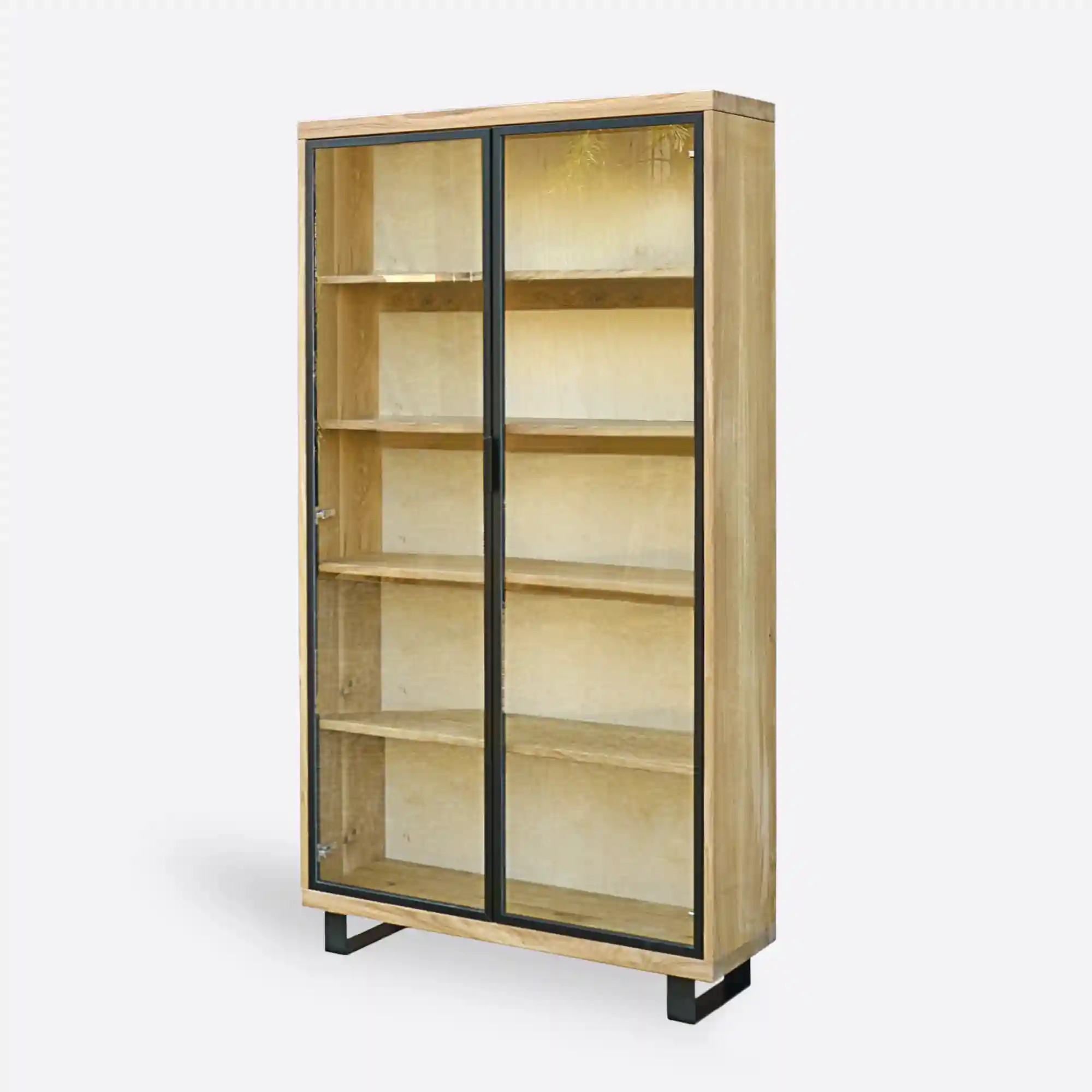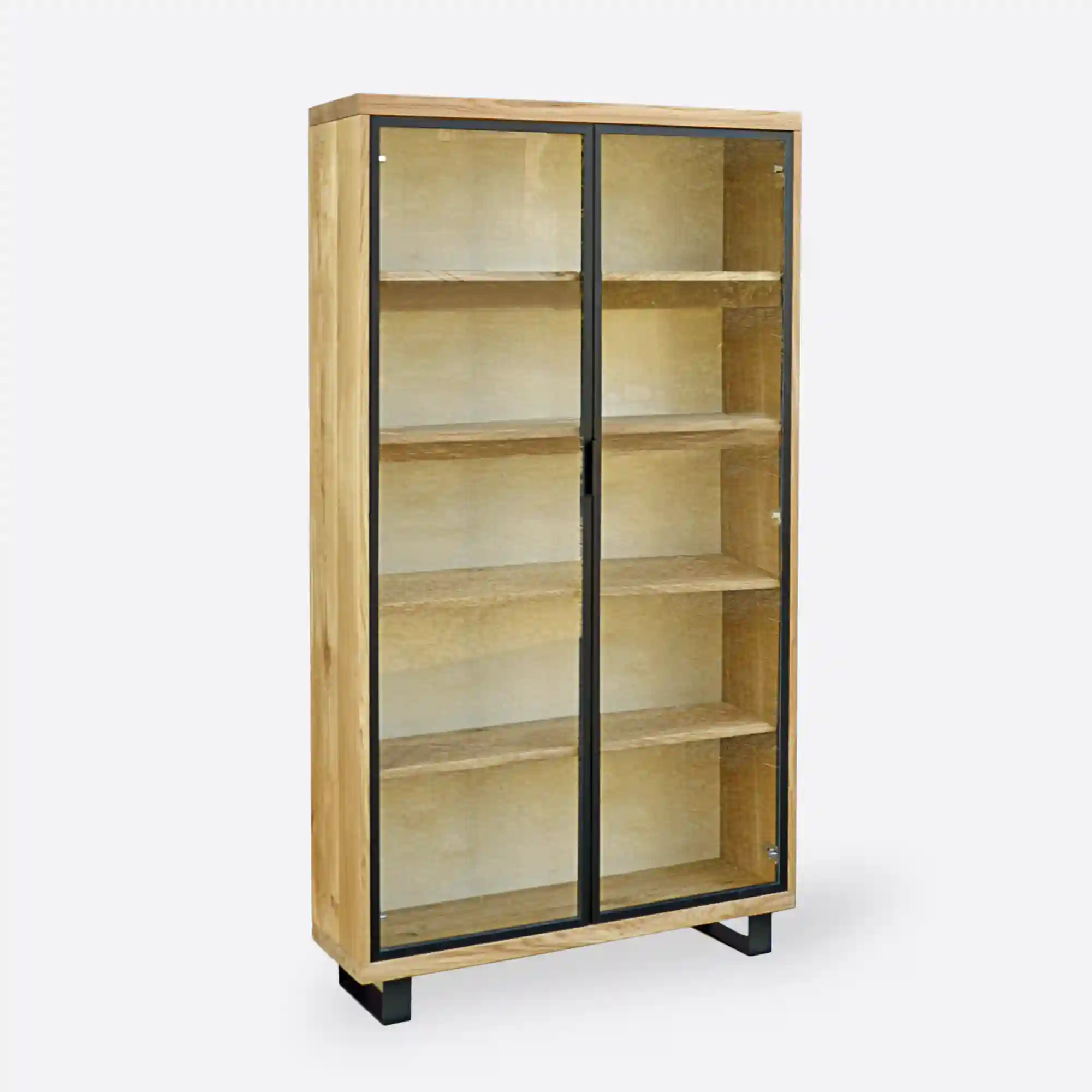 The DELIO III display cabinet is an elegant furniture model from our collection that will look impressive in any interior. A glass display case will allow you to display e.g. books, souvenirs or collectible items such as porcelain. The display case can also be used as a sideboard for tableware, glasses and other small items. Pay attention to details such as metal finishes and wood grains, which perfectly emphasize the character of the furniture. The Delio III display cabinet is made of solid oak, which gives the entire structure durability and a natural, warm look. The body of the website was designed with a minimalist approach in mind, with exposed wood structure, emphasizing its natural beauty. Oak surfaces are carefully polished to highlight the natural wood grain. Additional elements, such as steel fittings and handles, introduce a note of industrial style, harmonizing with the loft concept. The central element of the site is a double-leaf glass door, the use of which provides an elegant view of the interior. Glass creates a subtle transition between the outdoor and indoor environments. The doors open with traditional hinges, emphasizing the classic character of the furniture. An oak loft display cabinet with glass doors and shelves is a recipe for elegant and functional solutions that combine the warmth of wood with the modernity of industrial design. The interior of the living room display case contains several solid shelves, made with attention to every detail from the same oak as the rest of the structure. The shelves are open, which allows you to display your collection of books, decorations or art. When choosing display cases, pay attention to the possibility of adapting them to the space. The appropriate height of shelves, for example, will allow you to store items of various sizes, ensuring the functionality of the furniture.