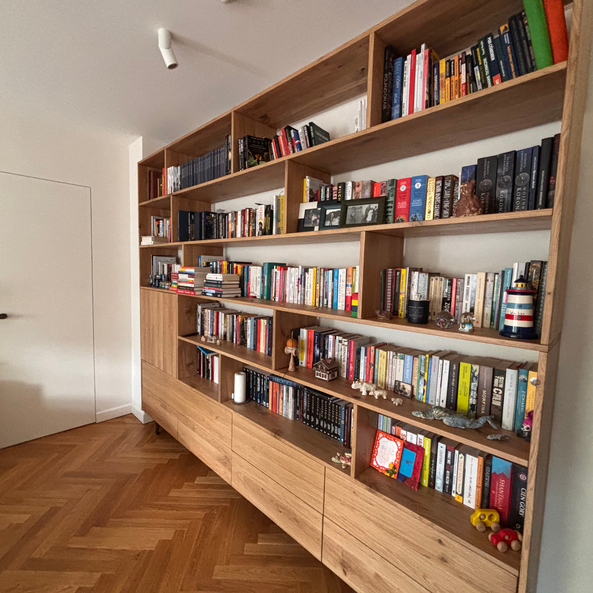 Standard production time for a custom oak bookcase is approximately 10–12 weeks, depending on complexity and scope. Each piece is manufactured in our Polish workshop and thoroughly inspected before delivery.