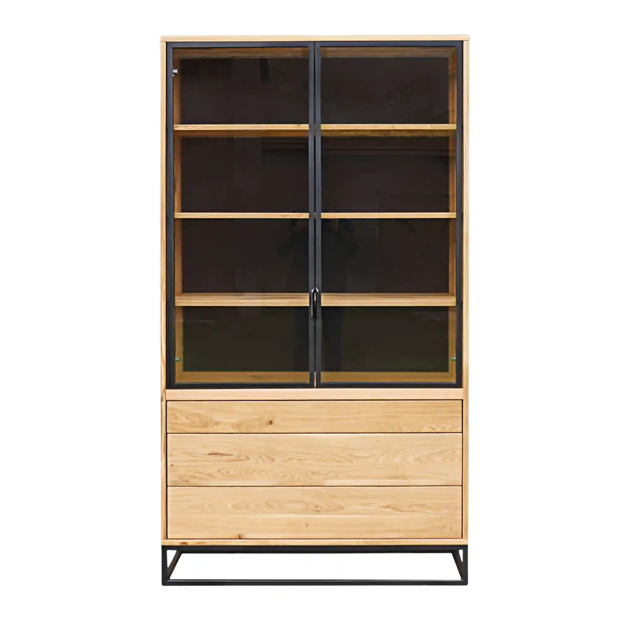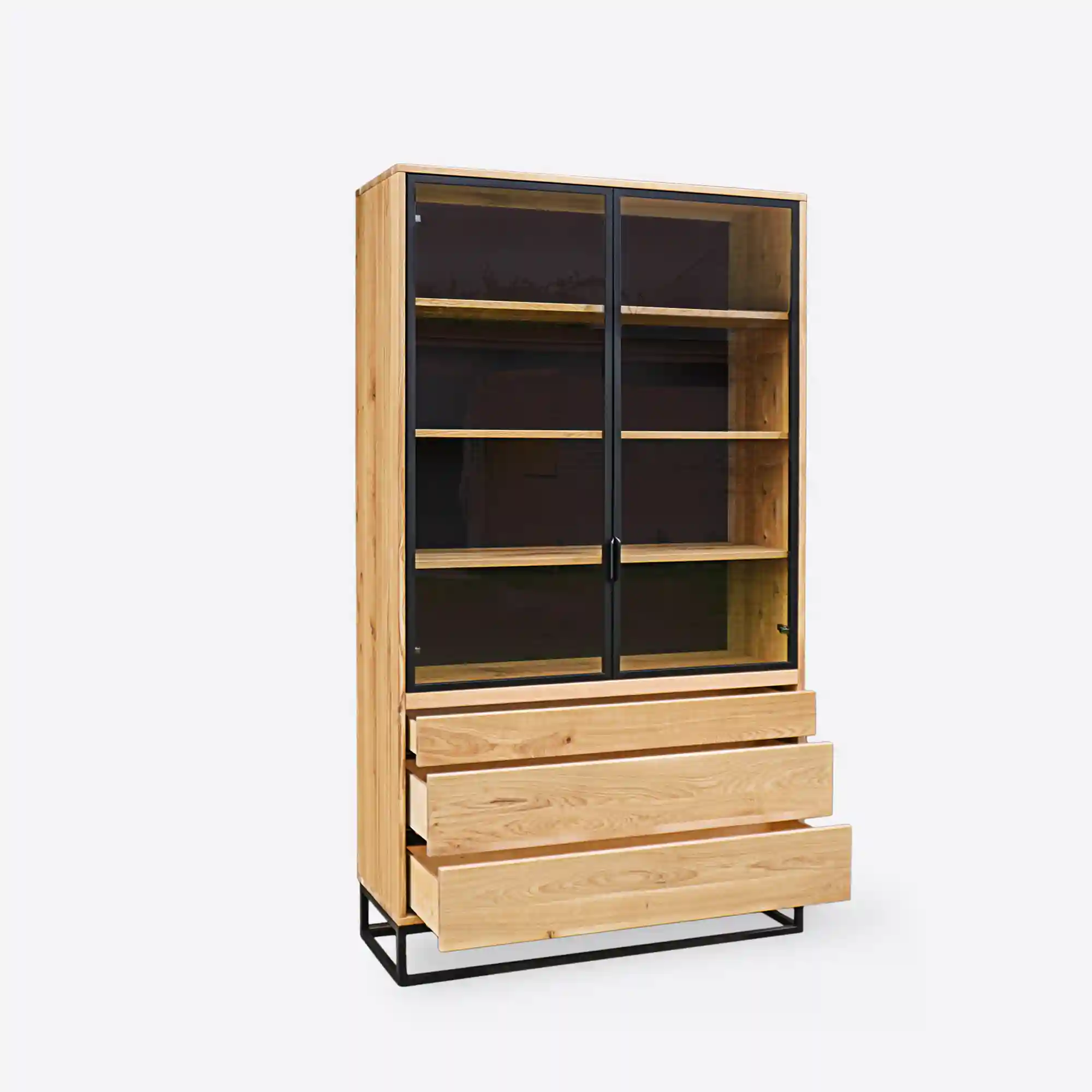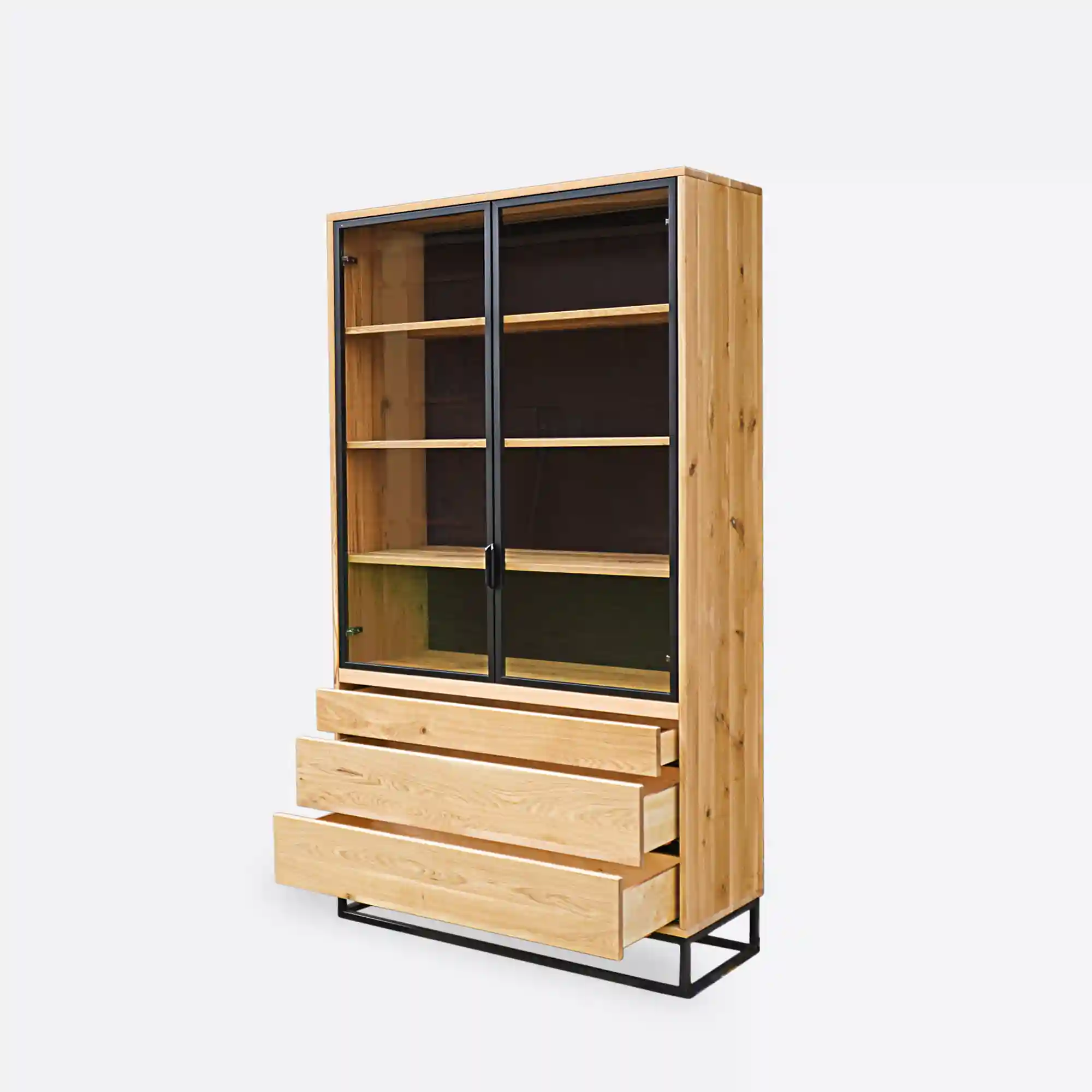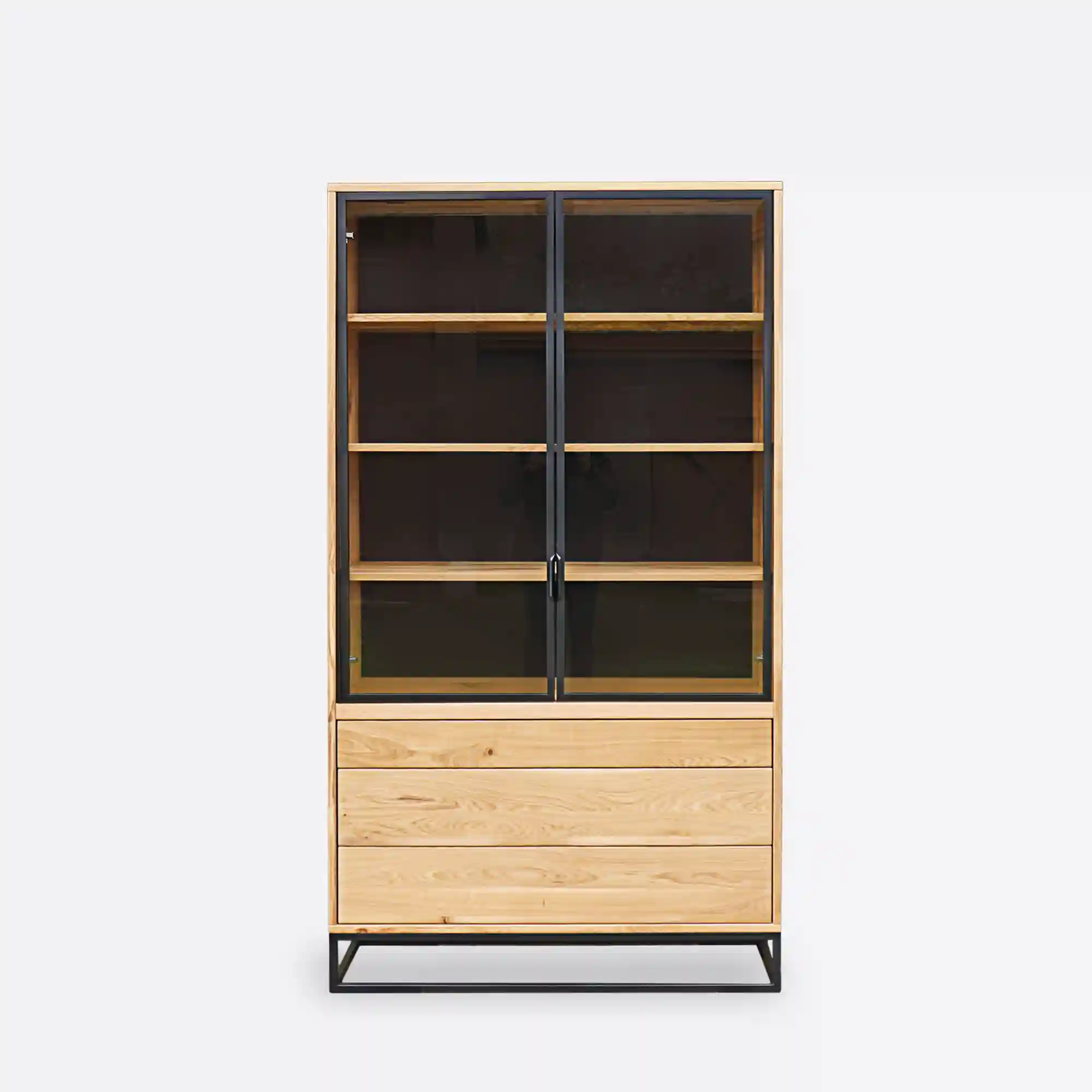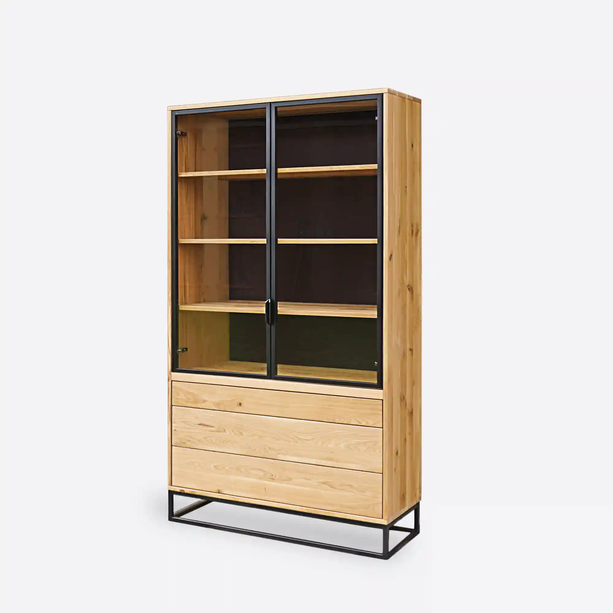 The MERIS IV solid oak display cabinet is a modern version of the bestselling model, which combines functionality with the aesthetics of industrial design. Unlike previous versions, the three capacious drawers have been placed under the glazed section for easier access and greater convenience of use. The drawers open with a tip-on system with silent closing, and the whole is supported by a solid black powder-coated steel base. The glazed part of the display unit is fitted with float glass and aluminium frames with a subtle handle. The contrasting black background emphasises the beauty of the natural wood and the objects on display – such as porcelain, glass, books, collections or family heirlooms. The lower drawers, on the other hand, easily accommodate tablecloths, documents, household accessories or small items you want to keep close at hand. It’s the perfect combination of display and storage in one piece of furniture.