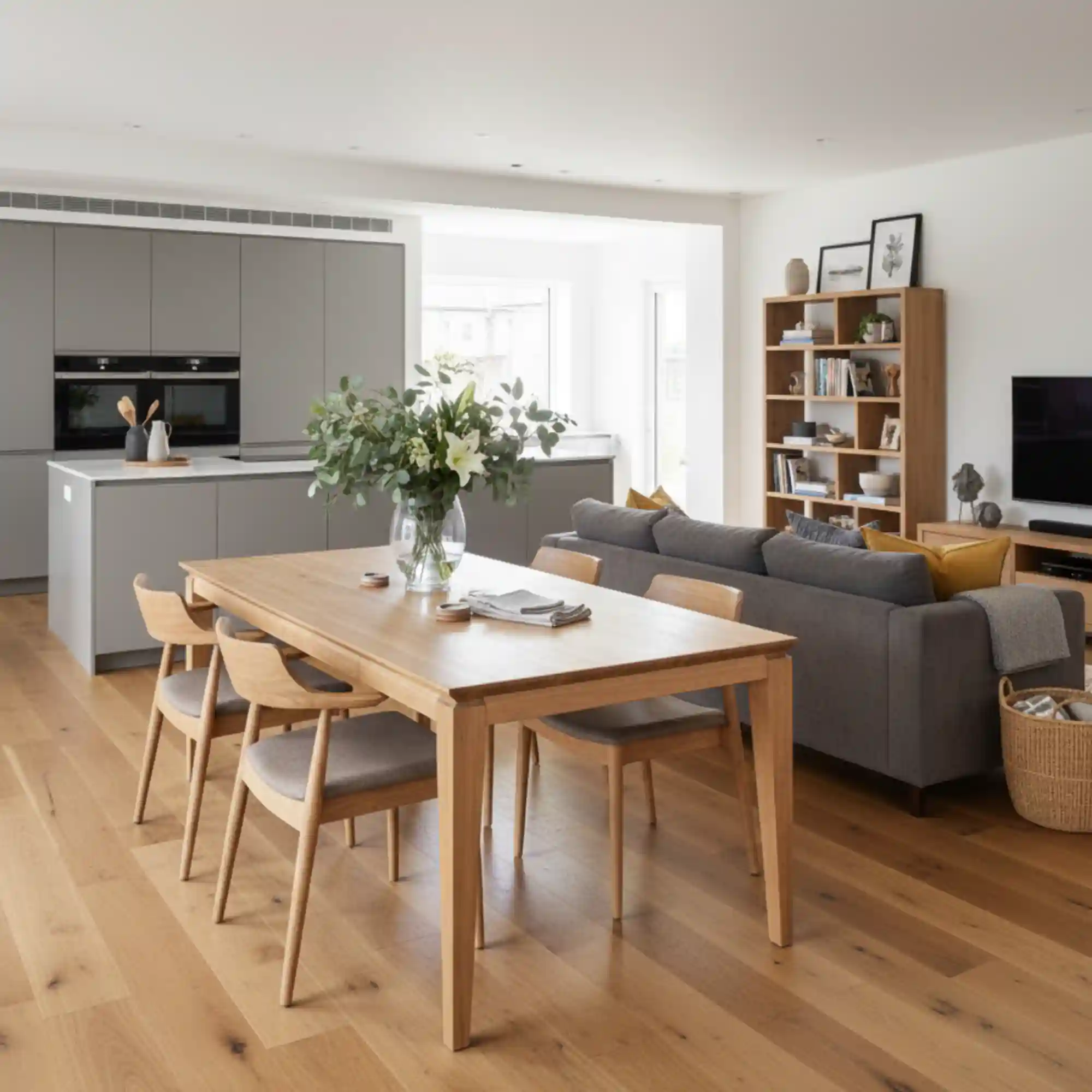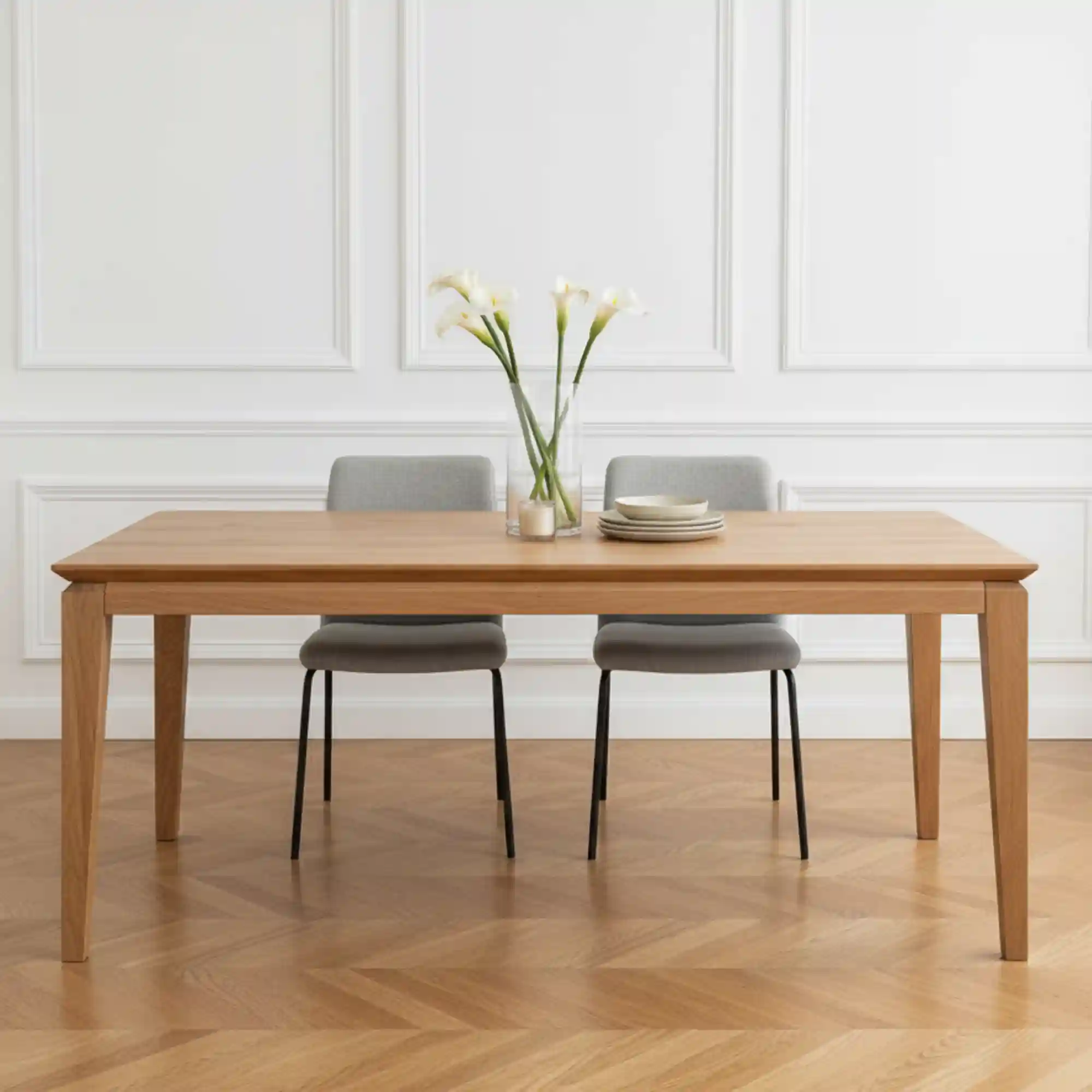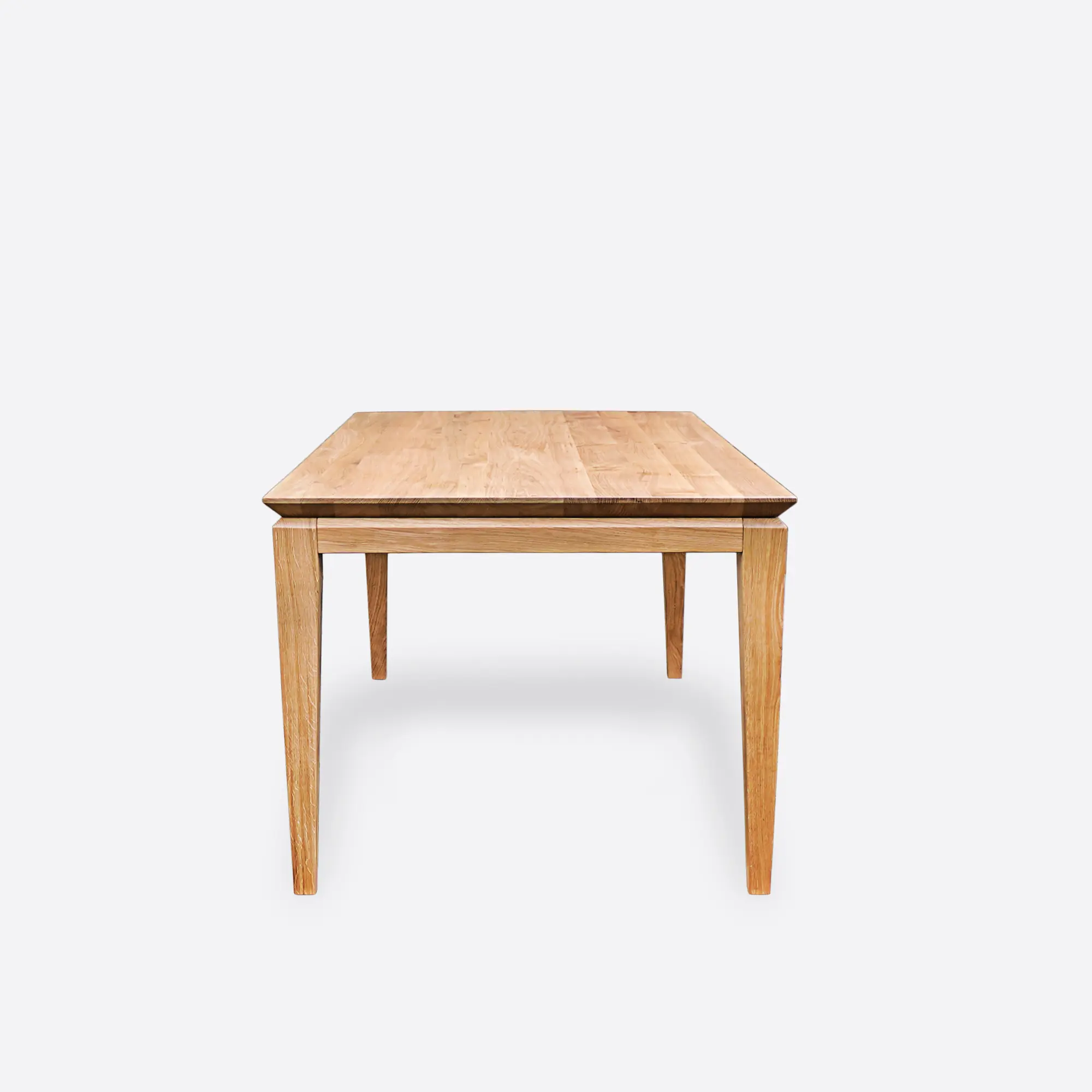 The DANTE I oak extending table is an elegant and functional proposal for the dining room, living room or kitchen, which combines a timeless style with modern details. It is a new, refreshed version of the bestselling DANTE model, distinguished by a more subtle form and a light, visually slender profile. The table’s distinctive legs, shaded on both sides, give the structure a fine look while maintaining full stability. The 4 cm thick table top is made of natural solid oak, known for its exceptional durability and elegant grain. In addition, its Swiss undercut accentuates the modern character of the piece of furniture and makes the whole look light and aesthetically pleasing – even in larger sizes. This is a table that will fit perfectly into both minimalist, loft and classic spaces. You can order a folding version of the DANTE I oak table. Thanks to the modern front slide system, you will be able to enlarge the table surface easily and in no time. Simply push back the legs and place the extensions on the slides. Enjoy meetings with a larger group without sacrificing comfort and style.