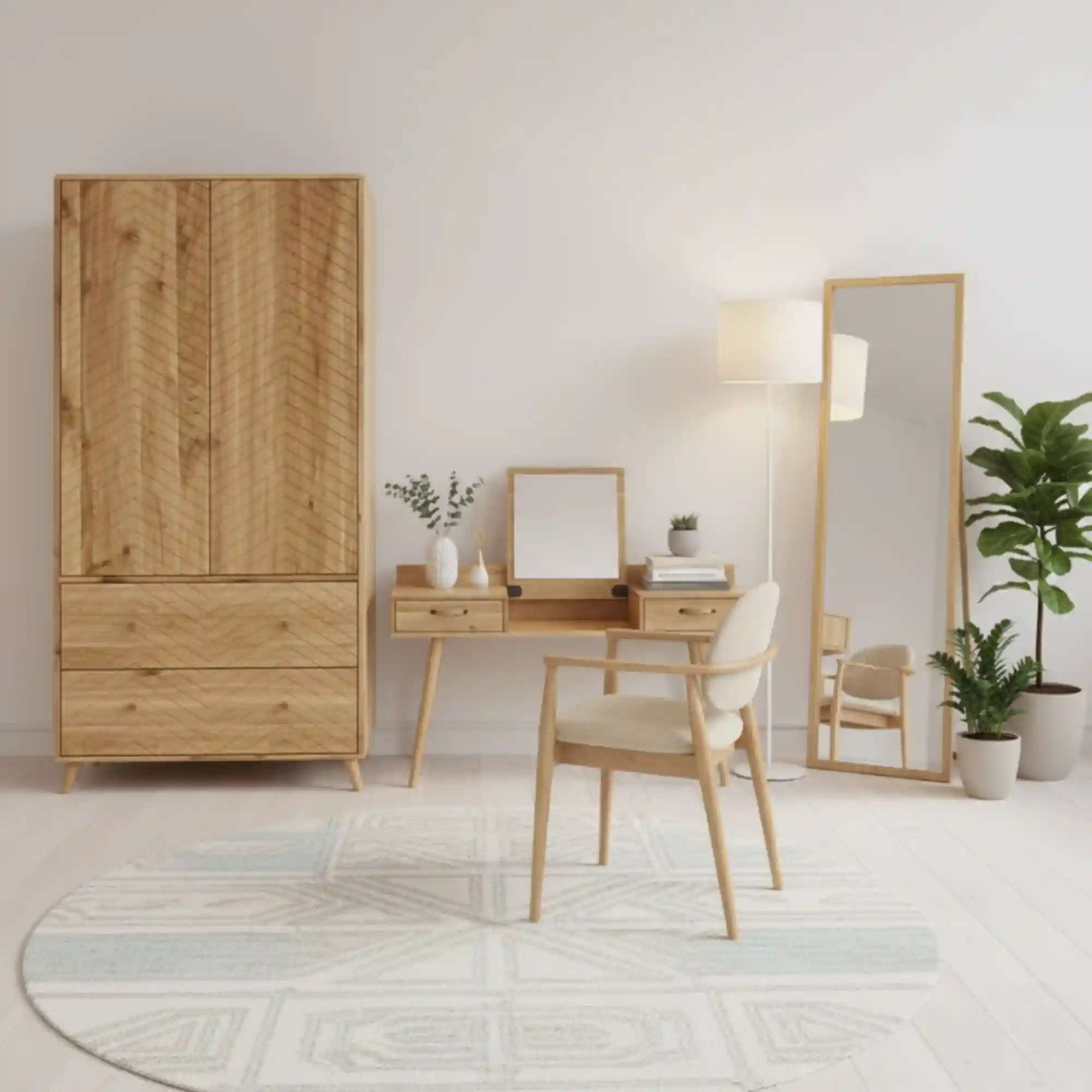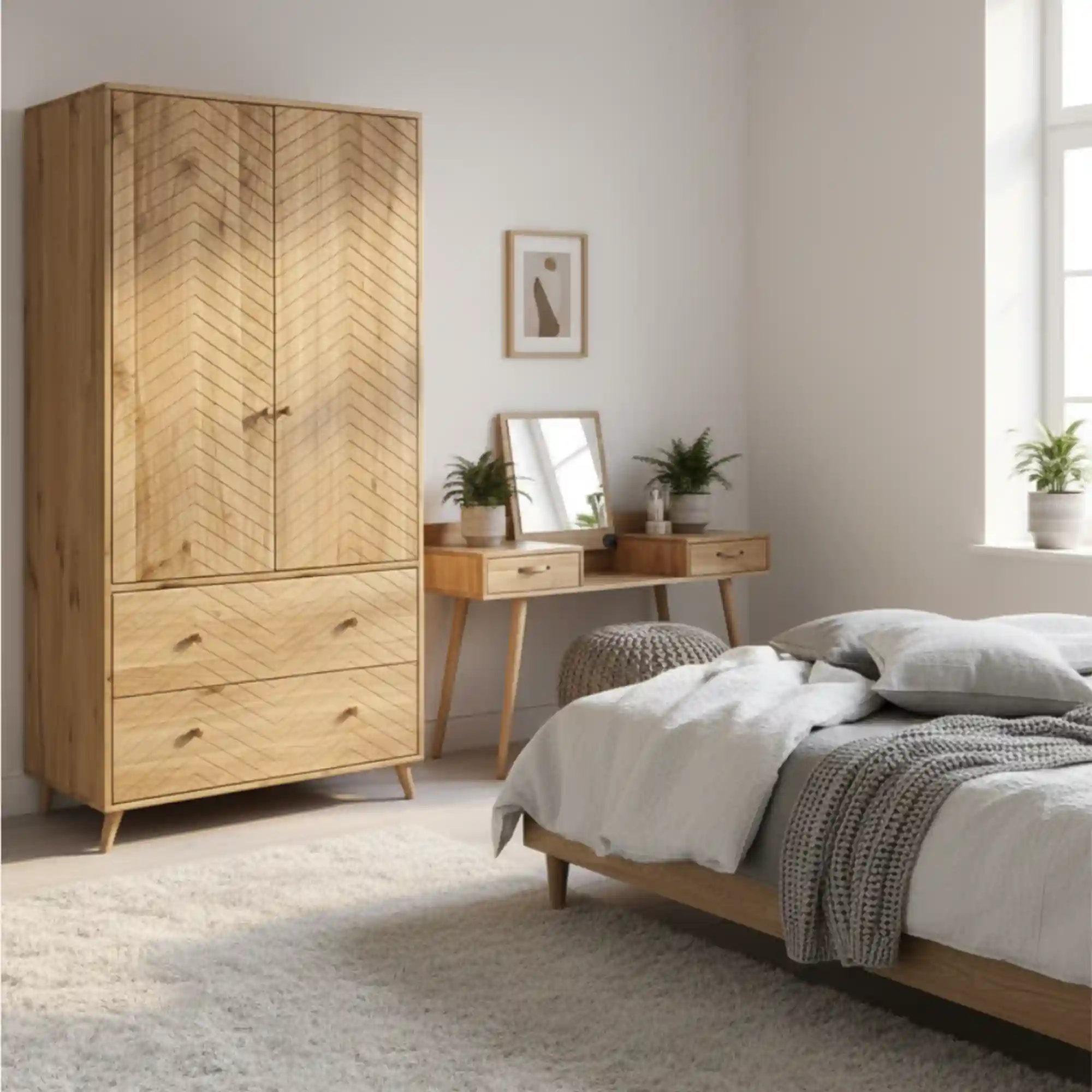 The AXEL oak wardrobe on legs is a unique piece of furniture with a classic character, which combines elegance and functionality. The upper part of the wardrobe has been divided into two zones – one of them is equipped with a clothes rail and an additional shelf, while the second one contains practical shelves. The interior provides plenty of storage space for clothes and accessories. At the bottom there are two spacious drawers, ideal for storing small items or linen. The delicate wooden handles perfectly match the natural colour of the oak wood, which emphasises the simple yet timeless form of the wardrobe. The wardrobe with milled fronts is a unique piece of furniture that brings elegance and subtlety to the interior. Thanks to the carefully executed milling, the wardrobe fronts gain an original texture, which attracts the eye and gives the furniture a refined style. Such a detail gives the interior a unique look, combining modernity with a touch of classic. The milled fronts go well with a variety of arrangements – from minimalist, through Scandinavian, to more glamorous. The AXEL wardrobe is a perfect choice for those who appreciate unconventional solutions and want to add an elegant yet modern touch to their interior.