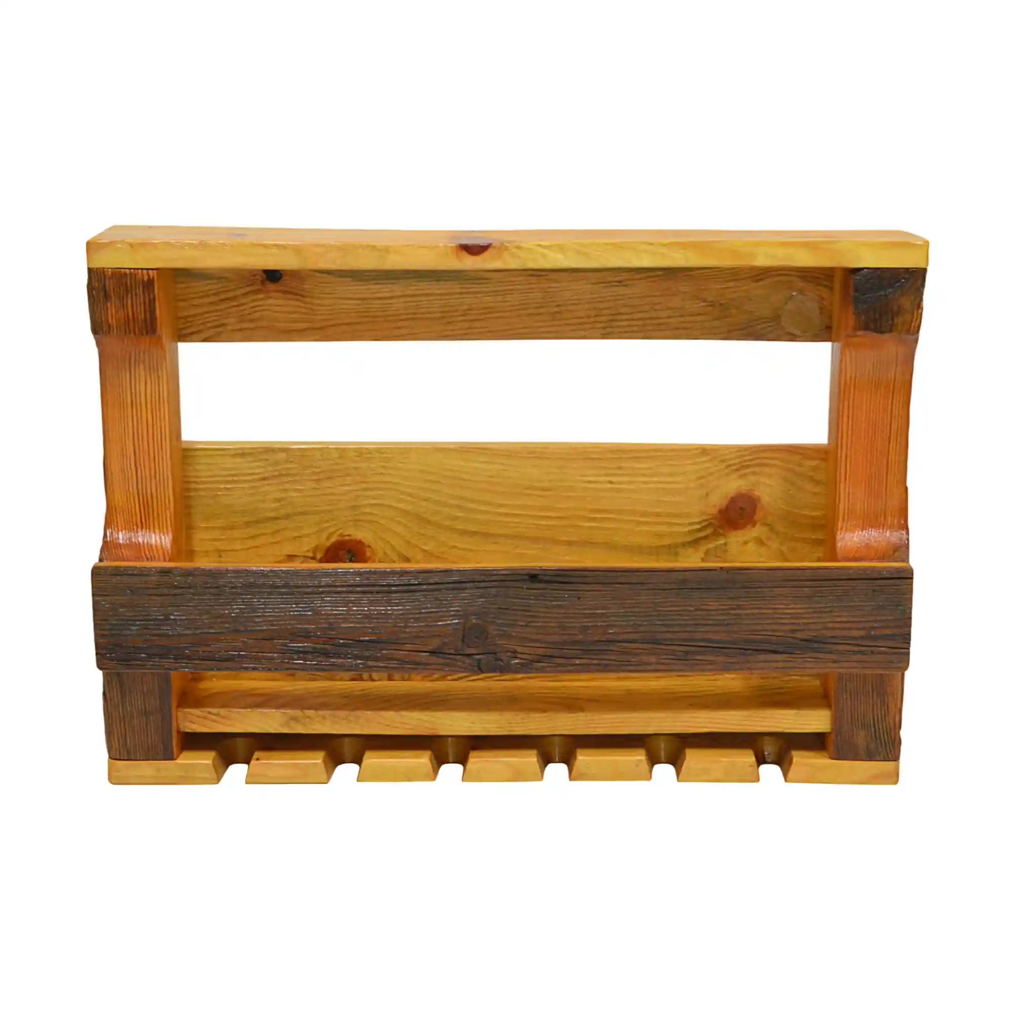 Wine shelf of solid wood for glasses looks original, how it looks, thanks to its natural colours. Industrial shelves are made of old solid wood with visible natural structure. Painting the wood emphasizes its color and protects and guarantees long use. Shelving ensures safe storage of wine bottles. Wood wine shelf for alcohol and glasses is perfect choice for any interior.