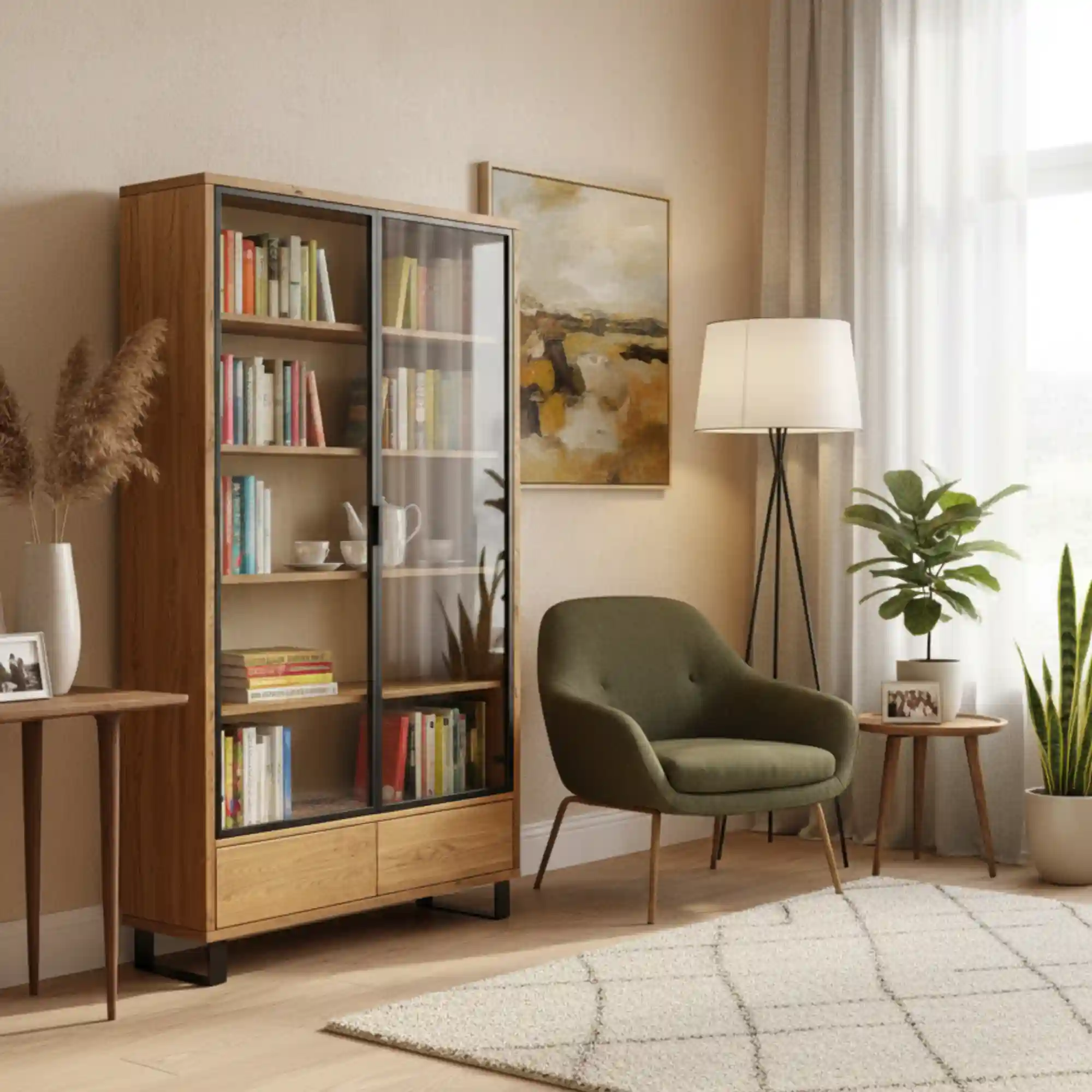Our offer includes wooden showcases in various sizes and styles. Industrial-style display cabinets made of oak or pine wood and metal, such as the DENAR model or the CARLA wooden display cabinet, are very popular. Loft display cabinet: The structure may contain metal details such as fittings, hinges or handles. Such elements add character to the furniture and emphasize the industrial style. Modern display cabinets from our collection have a wide range of applications. Wooden display cabinets are distinguished by their original design and durability, so they will last for many years. Oak display cabinets are solid furniture that fit into modern interiors and are used to store tableware and many other products. Pay attention to the DAVOS wooden bookcase or the ANDORA model with glass doors. We can adapt wooden display cabinets to the dining room or kitchen space to meet customer expectations. We can cover the wood surface with matte varnish or choose an oil finish in an available color, which will emphasize the wood pattern and the character of the material.