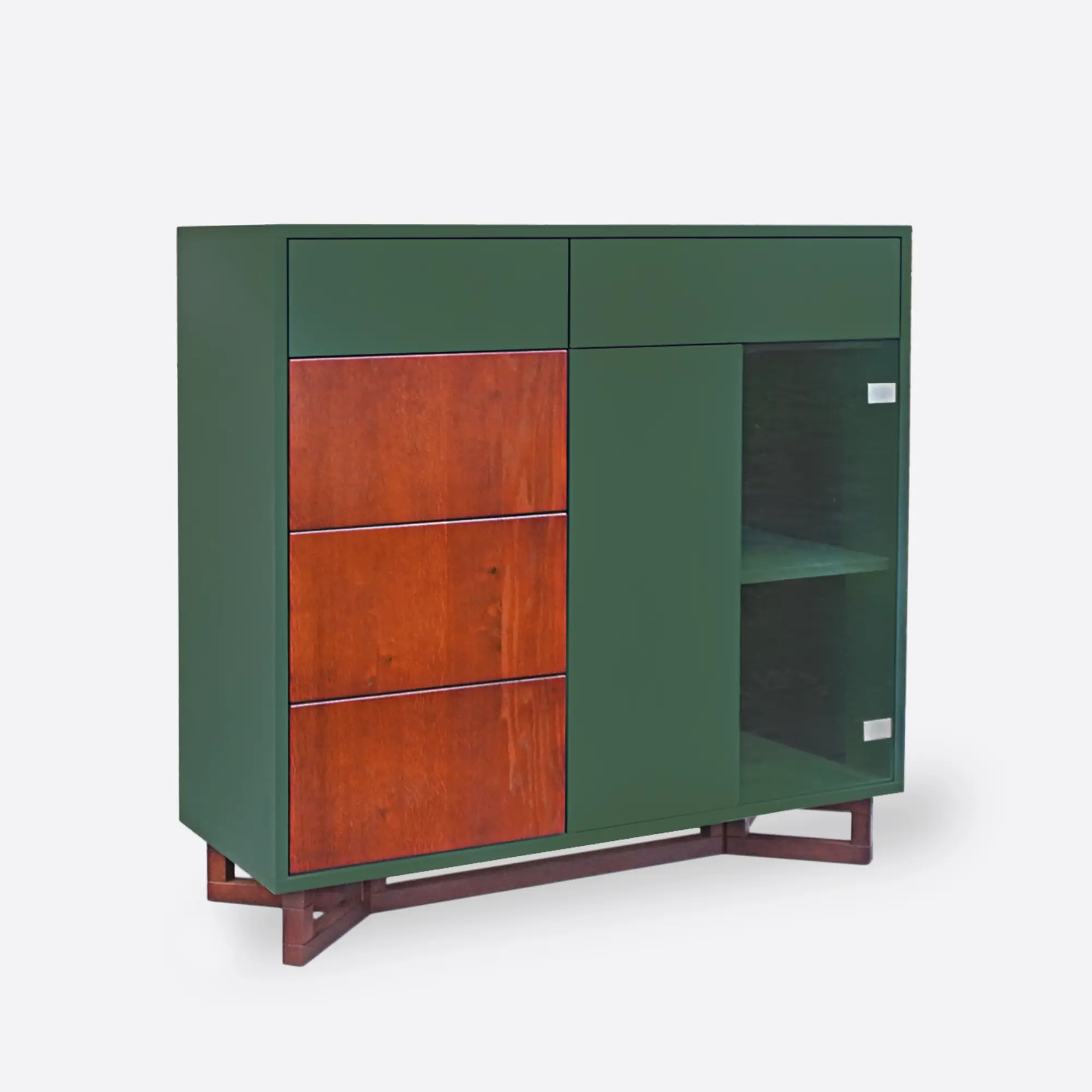 Wooden dresser with drawers of wood NORD boards is a piece of furniture that will allow you to create a fashionable and functional interior. The furniture is made of laminated board in Labrador color. The fronts of three drawers and one cabinet made of oak solid wood in cherry color. In addition, the door on the right side is made of glass, so as to expose interesting decorations in an interesting way. The legs of the furniture are made of oak wood. Wooden chests of drawers and chests of drawers made of pine wood are solid and durable furniture. Designer chest of drawers equipped with five drawers and two shelves will accommodate many everyday things while guaranteeing the safety of their storage. The modern form of the wooden chest of drawers combined with a practical and solid construction with drawers and cabinets creates an elegant and universal whole. A wooden chest of drawers with wooden and plate drawers will be a perfect complement to both the dining room, living room and living room. Wooden chest of drawers is a universal piece of furniture. Wooden chests of drawers and other furniture are created by hand, which guarantees an original and unique look.