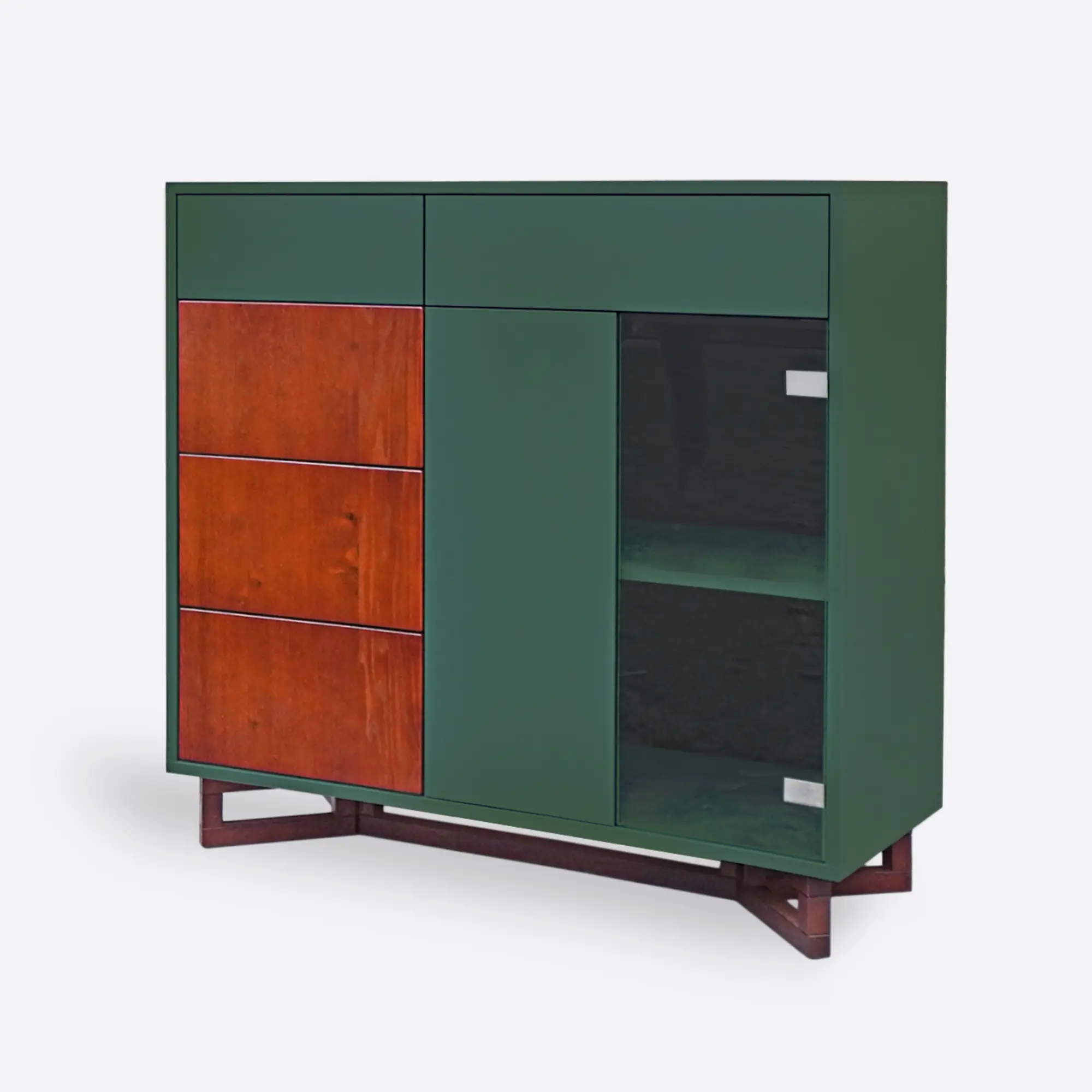 Metal elements such as legs and handles are fully customisable, including matte black, brushed steel, brass, white RAL shades or any colour from the RAL palette. Wooden legs finished to match the cabinet create a cohesive and elegant look.