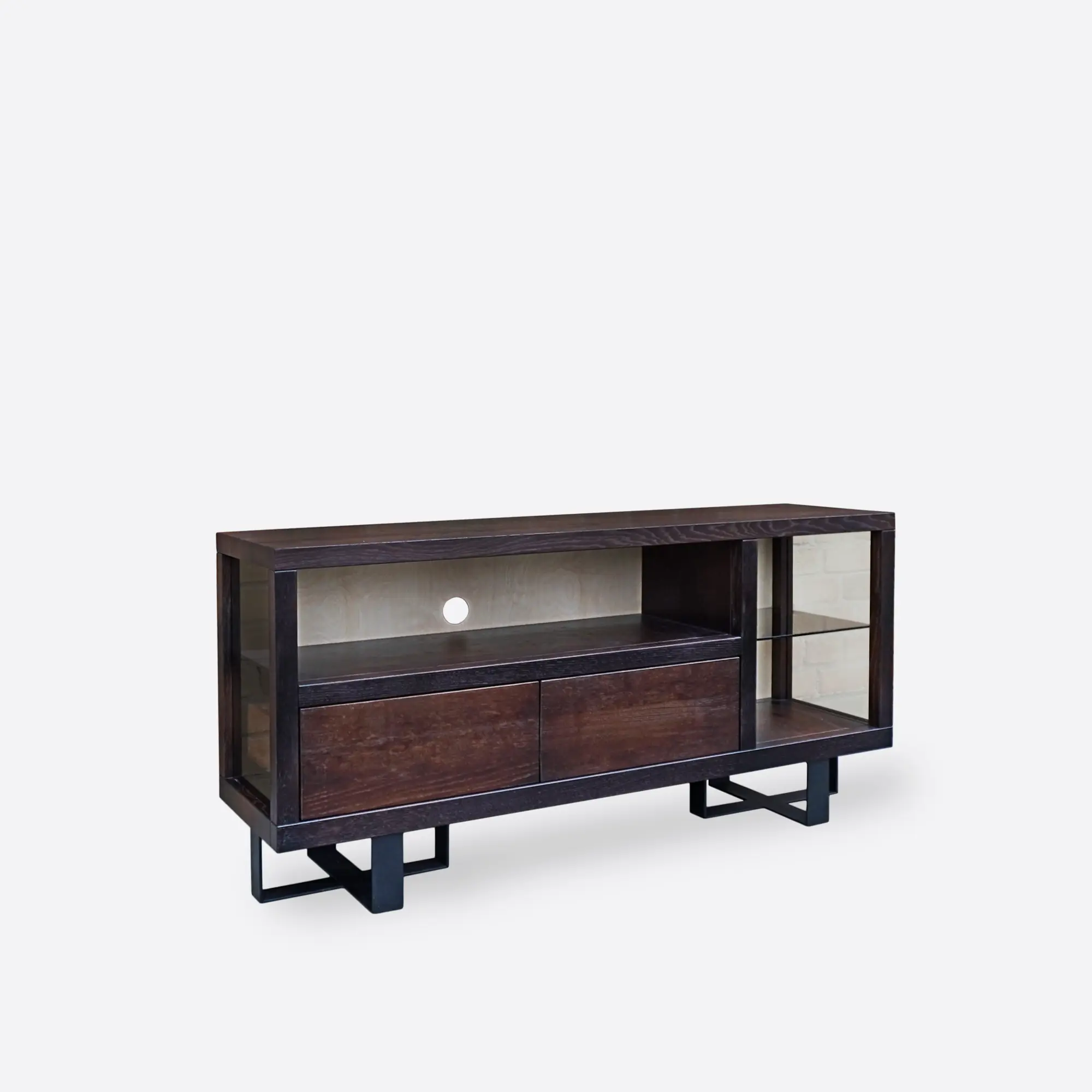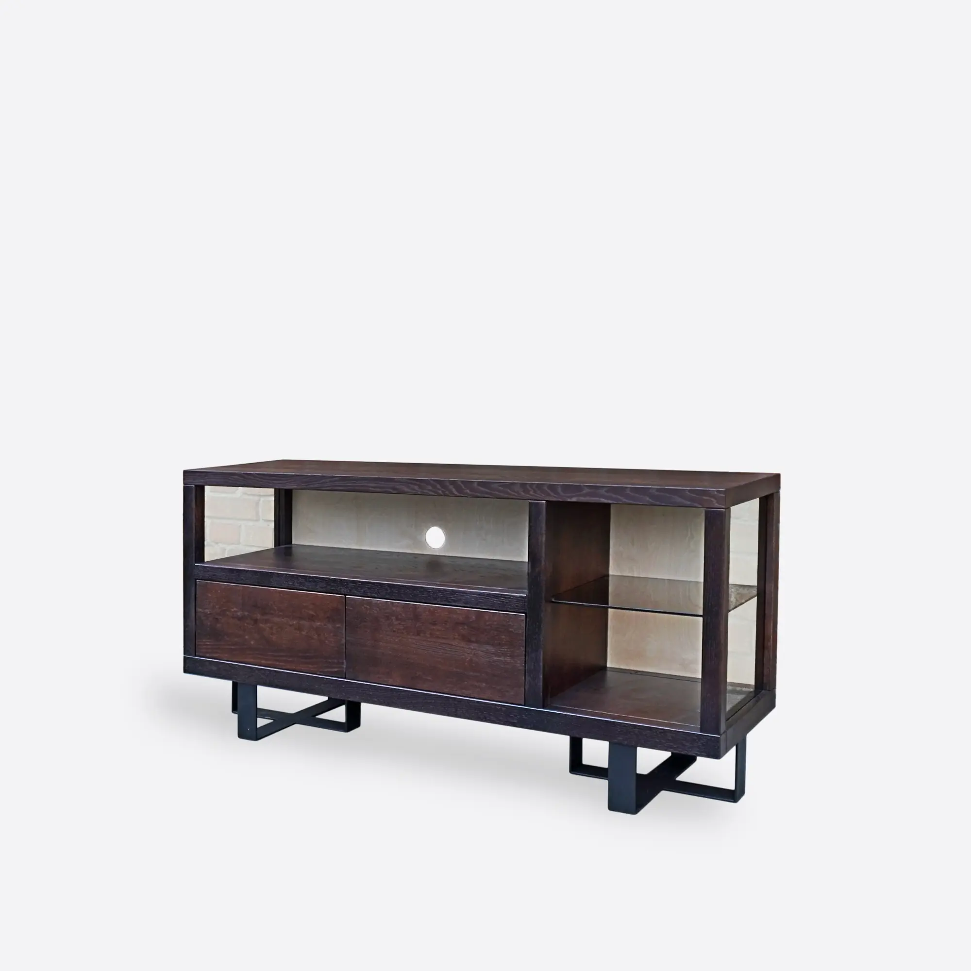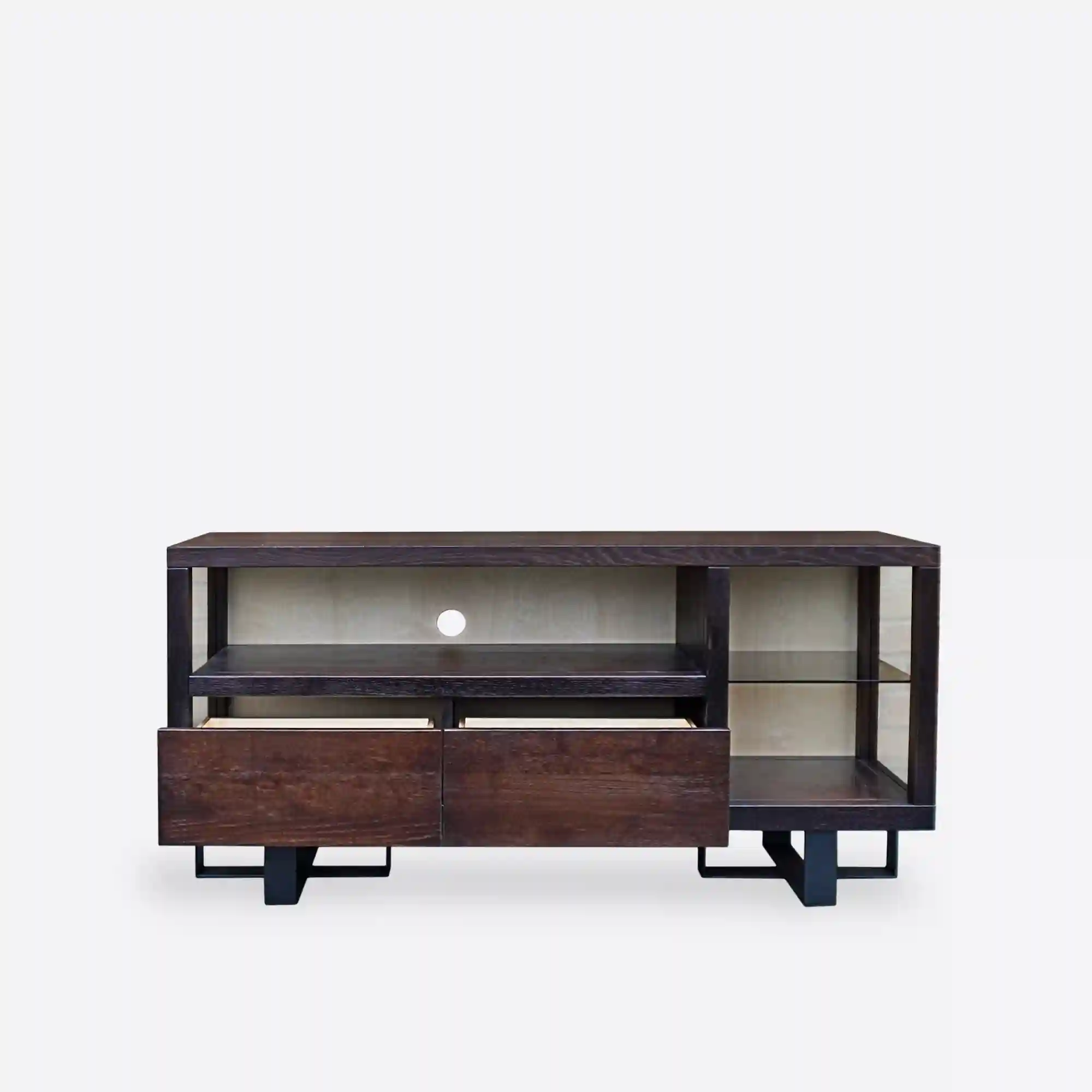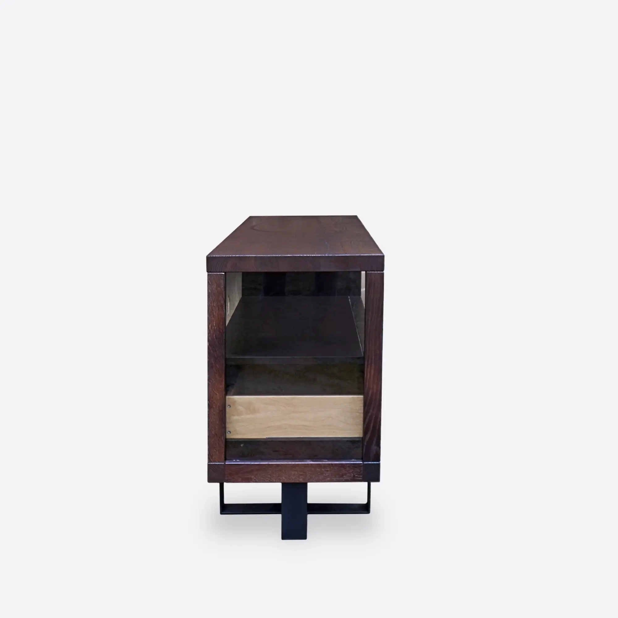 Wooden TV stand of solid wood with metal legs MOCCA is great choice for your TV or any other equipment. Cabinet is made of solid oak wood, which is protected with lacquer in rustical color. Legs are made of steel protected by powder coating in black, which is excellent protection. TV cabinet made of solid wood thanks to metal legs gains a lot of lightness sublime shape. We especially recommend placing cabinet in rooms such as the living room or bedroom decorated in industrial style. Industrial, oak TV cabinet is equipped with two capacious drawers and open shelves that will provide a lot of space for decoders in living room. TV cabinet made of wood and metal will be extremely stable and durable. TV cabinets of solid wood will add extraordinary atmosphere to interiors and make them functional and comfortable to use. Wooden TV stand of solid wood with metal legs MOCCA I will stylishly fit into any interior and give outstanding character to the room.