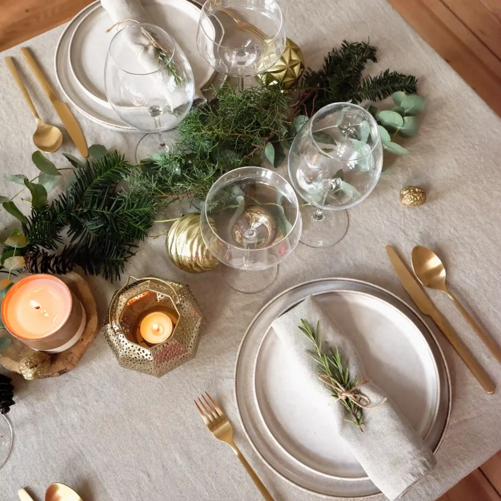 - Natural elements: decorate the table path with fir branches, pine cones and walnuts. Add some fresh flowers to add color.